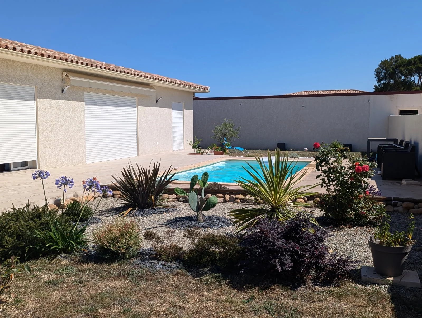 Villa de 135 m² habitable - Terrain clôt de 700 m² Cuisine équipée ouverte sur le salon séjour et terrasse. 3 chambres / 2 SDB / 2 wc - 1 Bureau Terrasses sur Piscine 8 x 4 Garage de 32 m² Terrain clôt de 700 m².
