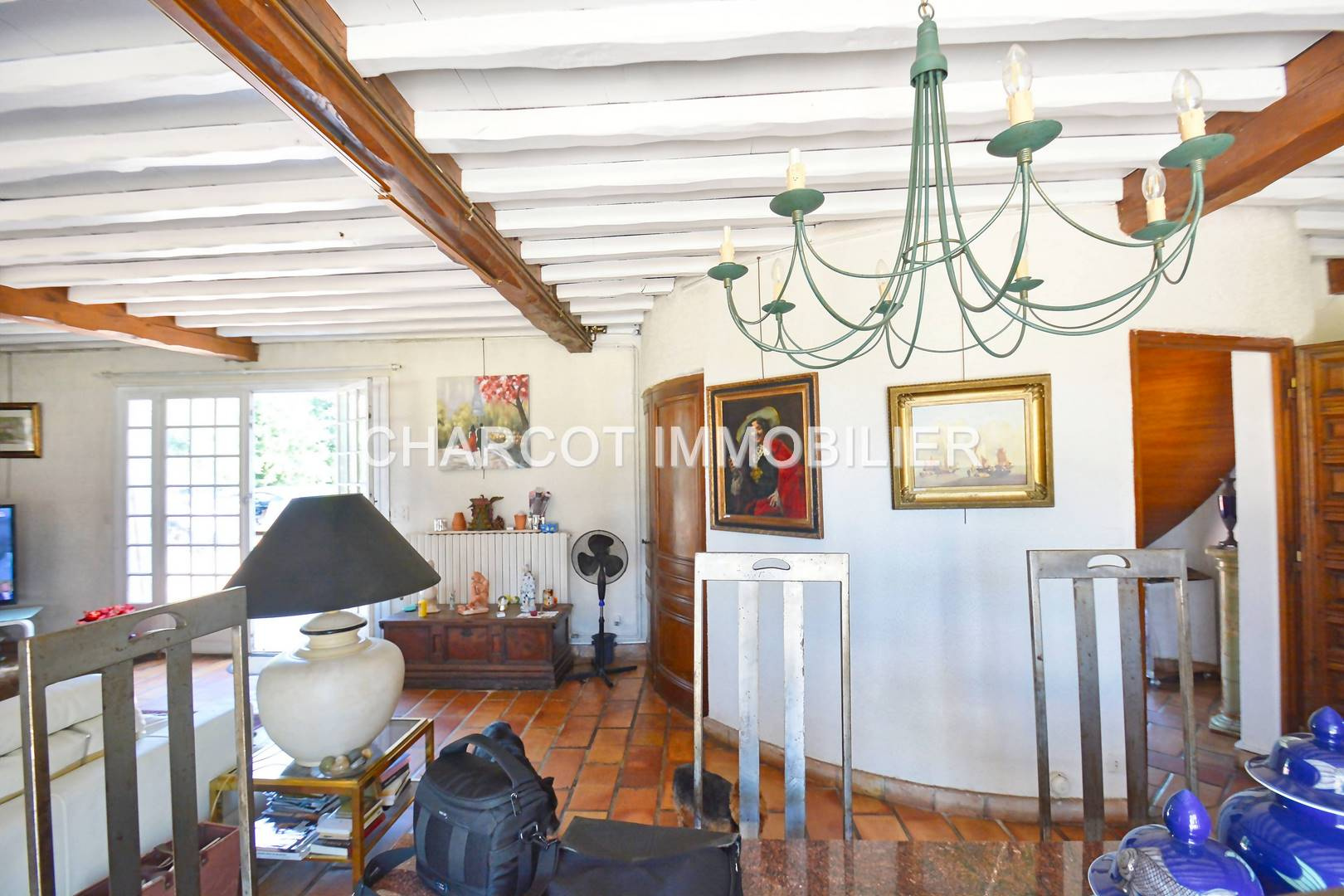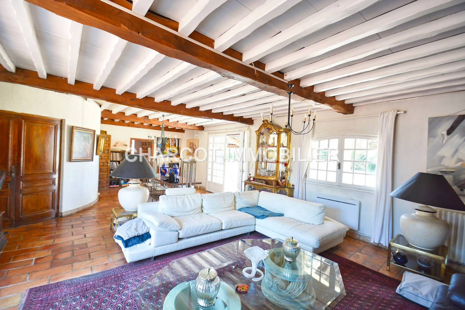 Un salon/séjour spacieux de 60,10 m2 avec des poutres à la française, un sol en terre cuite et trois grandes fenêtres donnant sur une terrasse avec un barbecue abrité.
