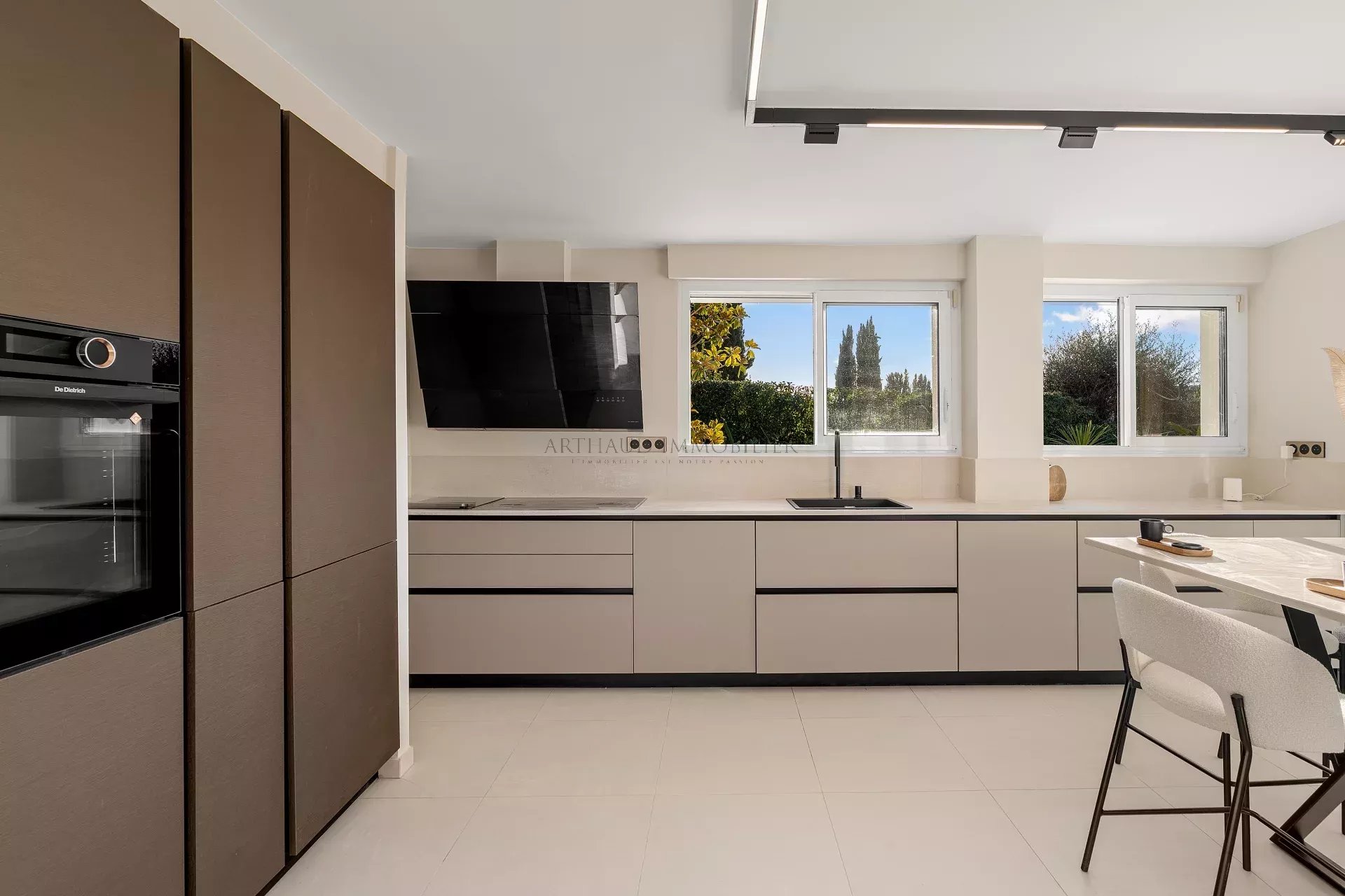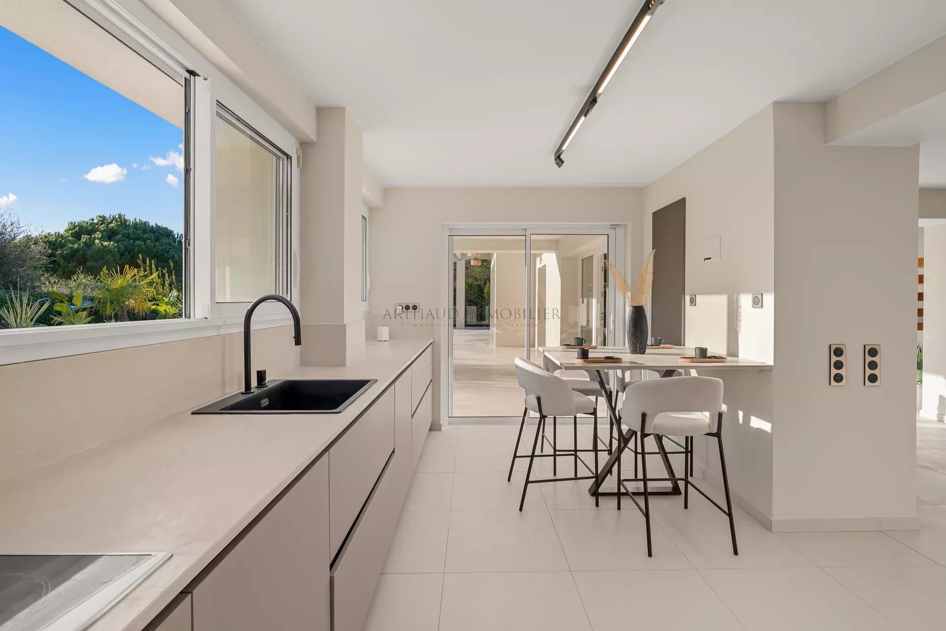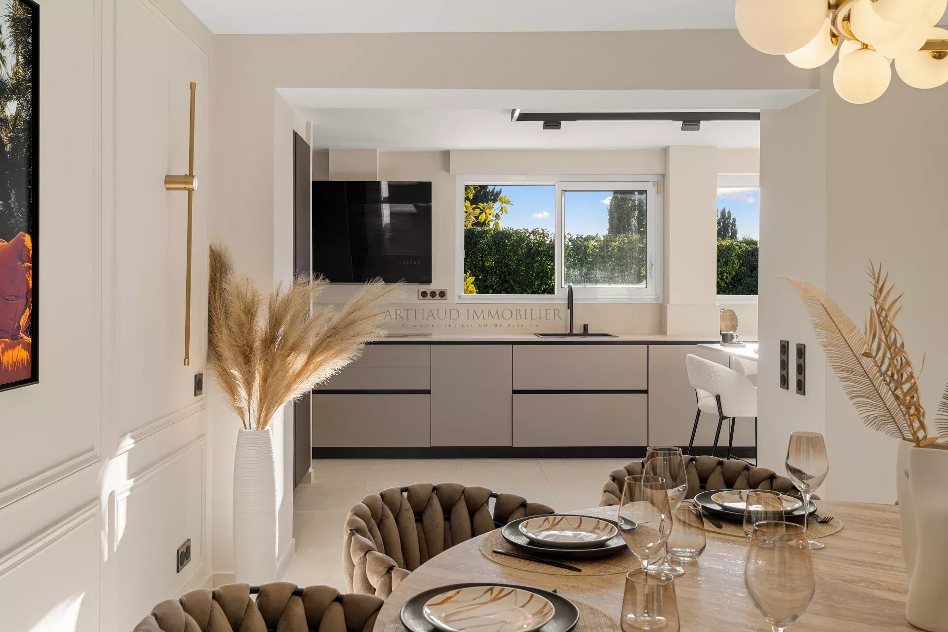 Le séjour spacieux s’ouvre sur l’extérieur grâce à de larges baies vitrées, tandis que la cuisine moderne et entièrement équipée jouxte une salle à manger chaleureuse. Chaque détail a été pensé pour allier confort et raffinement.
