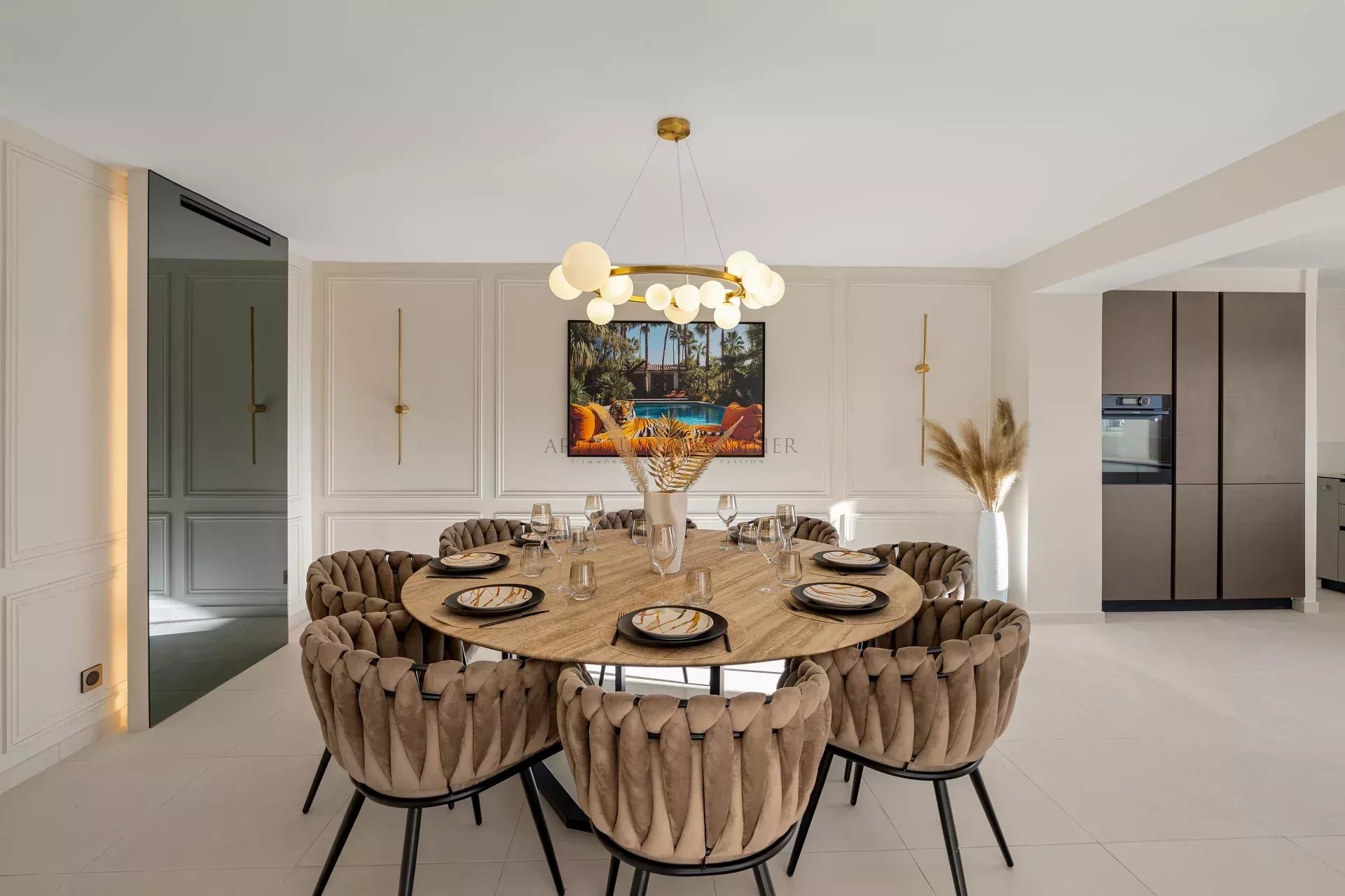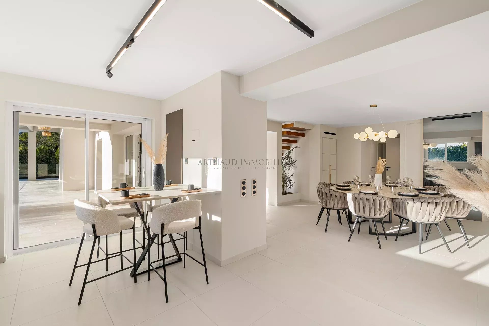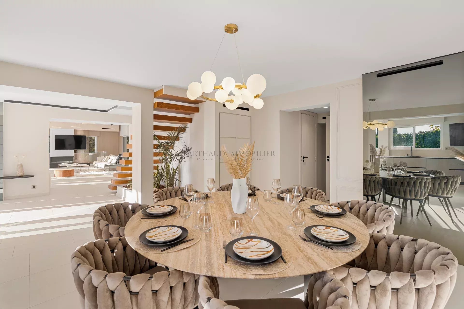 Le séjour spacieux s’ouvre sur l’extérieur grâce à de larges baies vitrées, tandis que la cuisine moderne et entièrement équipée jouxte une salle à manger chaleureuse. Chaque détail a été pensé pour allier confort et raffinement.