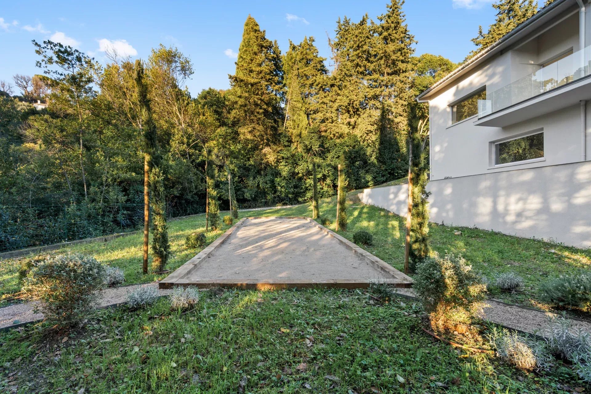 À l’extérieur, tout est conçu pour profiter pleinement du cadre méditerranéen : une piscine, un terrain de pétanque et une grande terrasse.