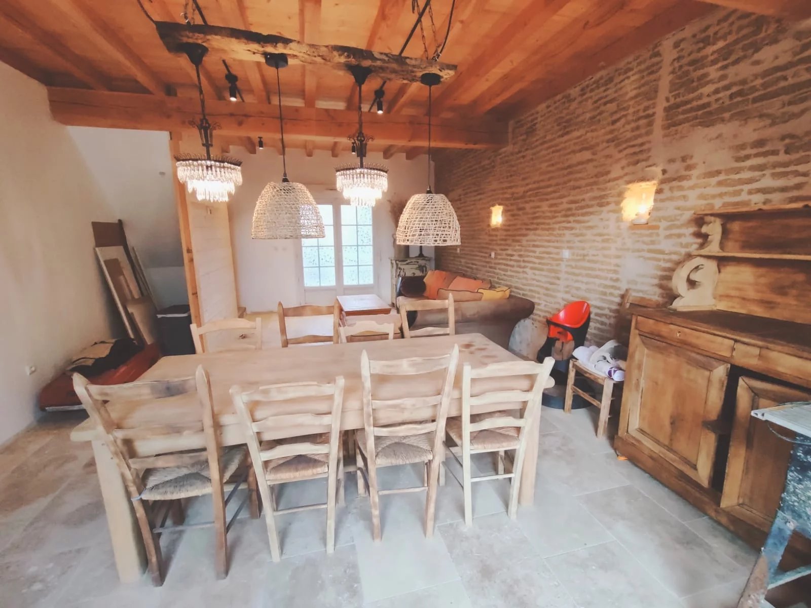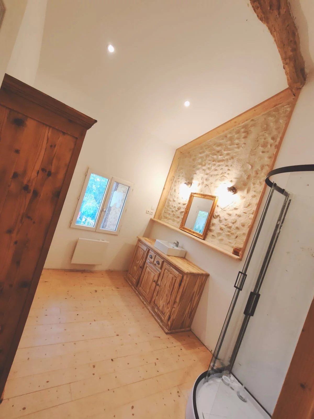 À l’étage, trois chambres mansardées au charme indéniable vous attendent, avec poutres et pierres apparentes ainsi qu’un magnifique plancher en bois restauré, apportant chaleur et authenticité à l’espace nuit.