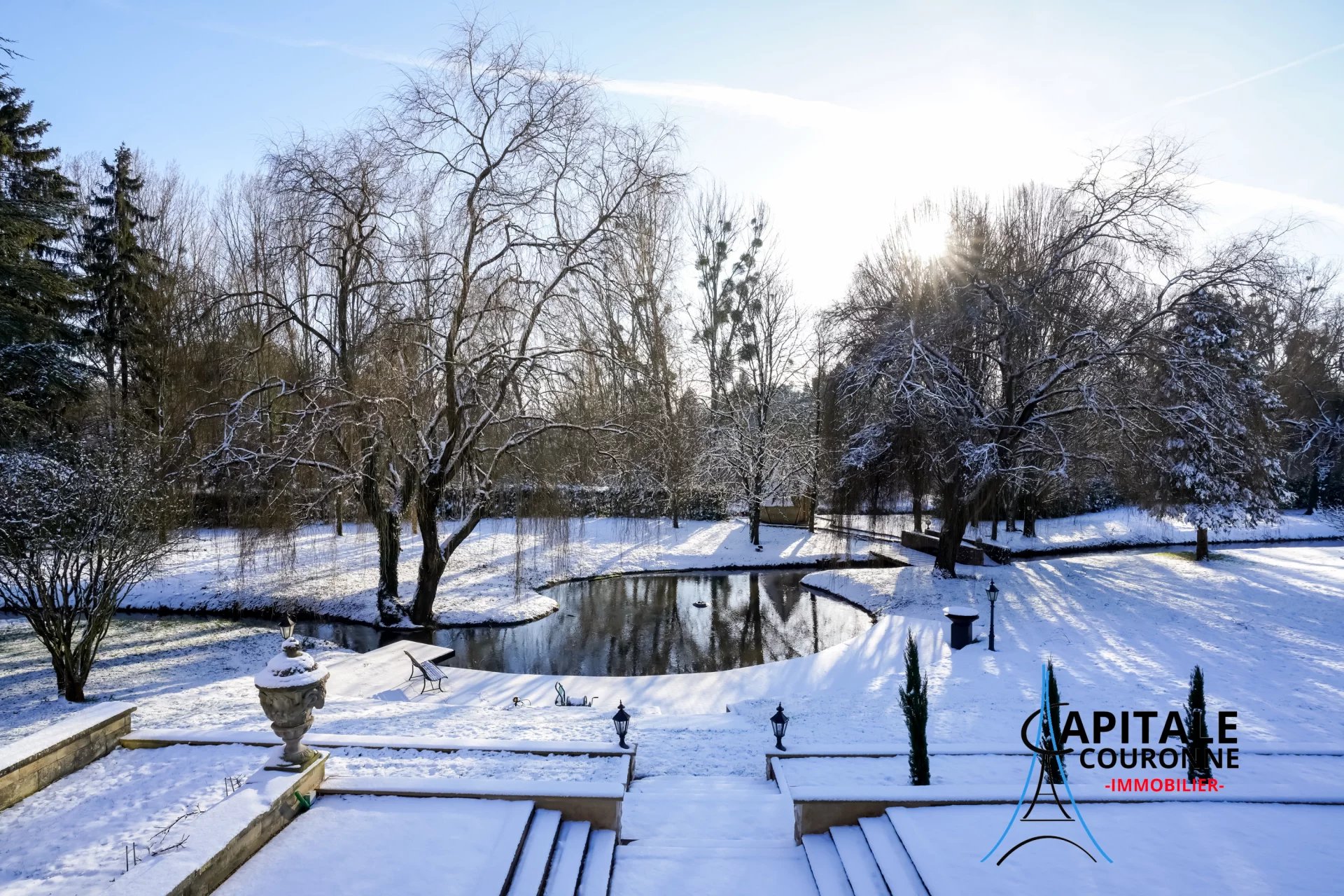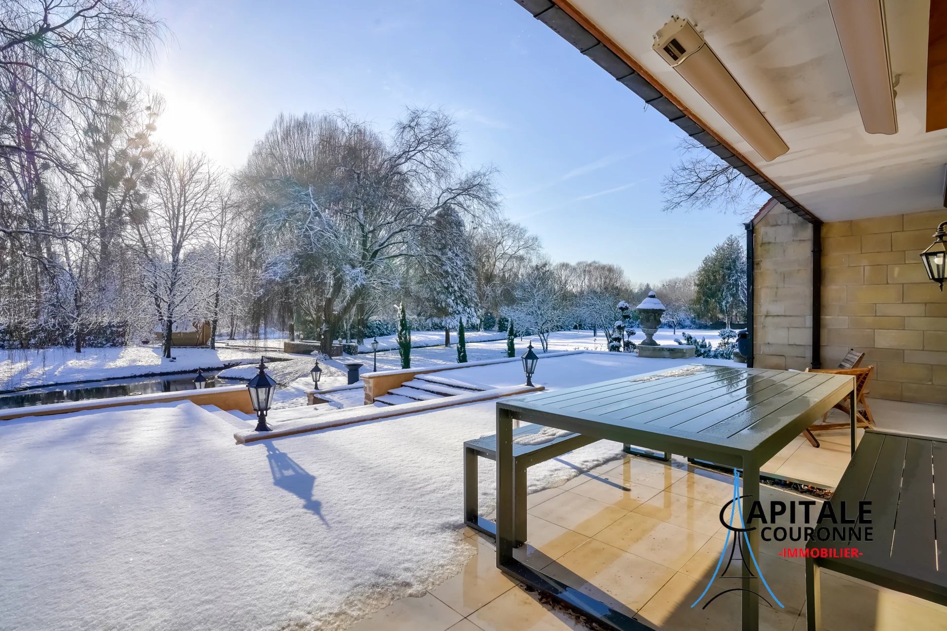 L'extérieur de la propriété est tout aussi impressionnant, avec un parc paysager parfaitement entretenu, un garage pour quatre véhicules (4 portes automatisées), une cabane/studio indépendant, un verger et un terrain de pétanque.