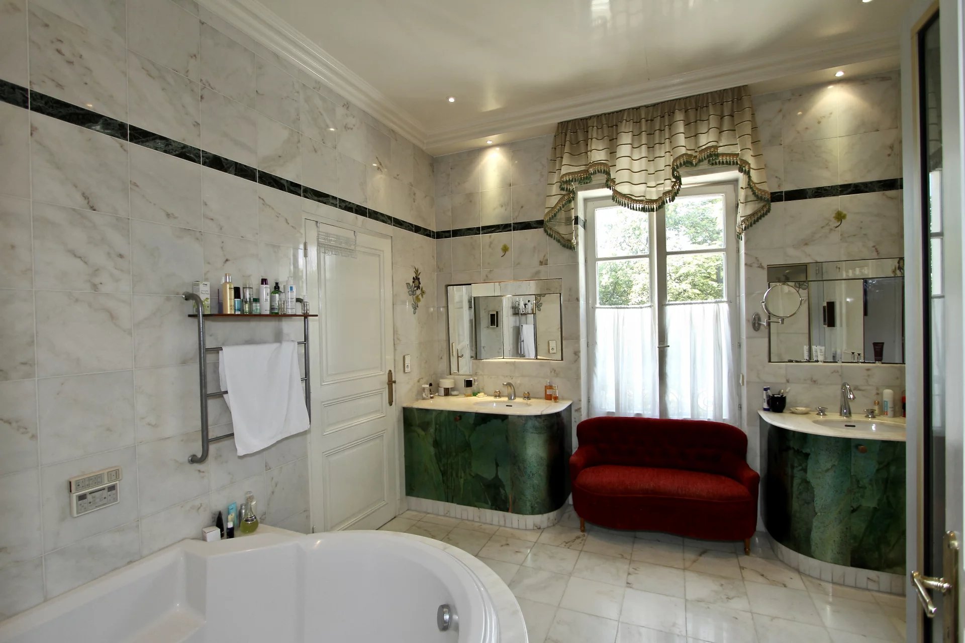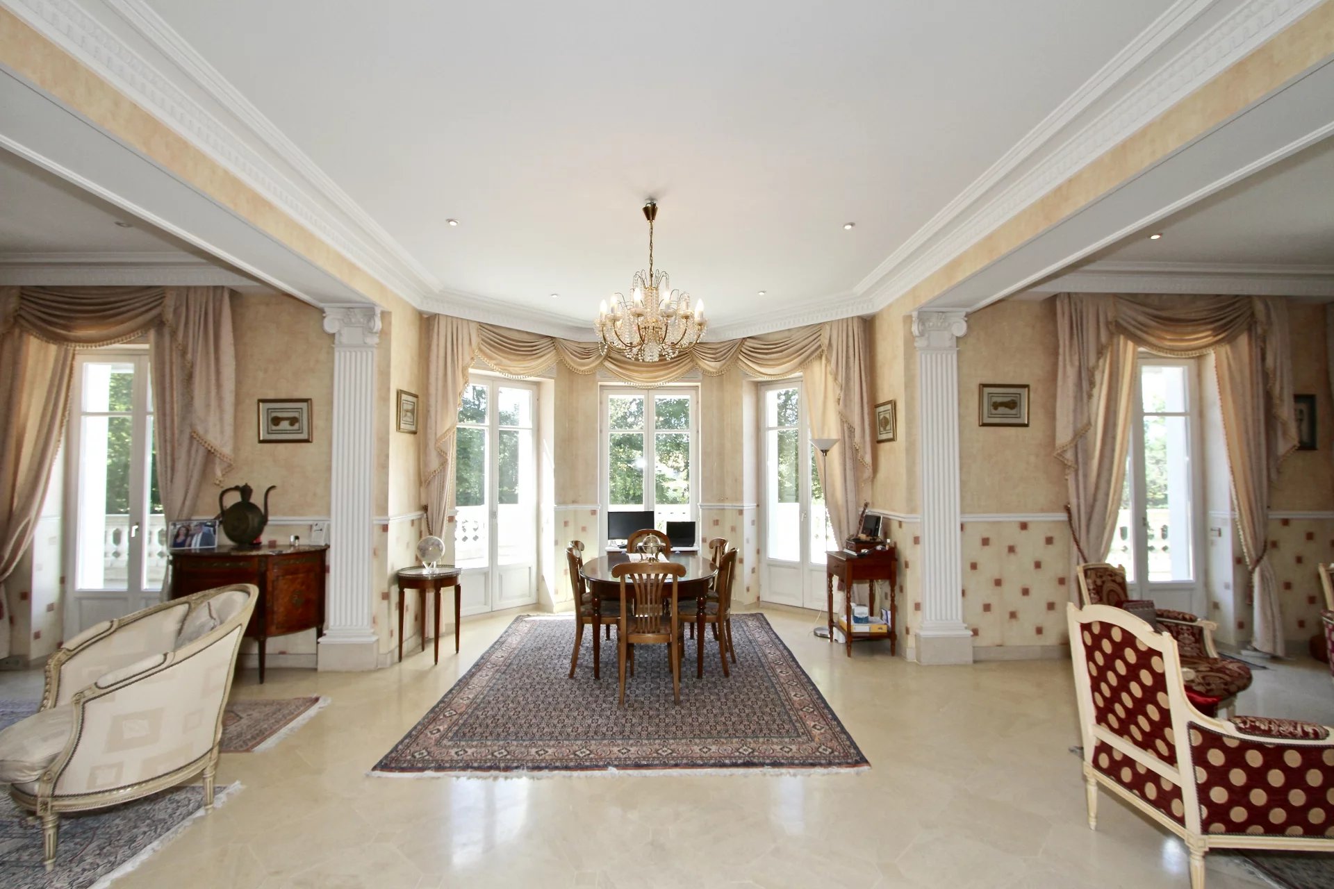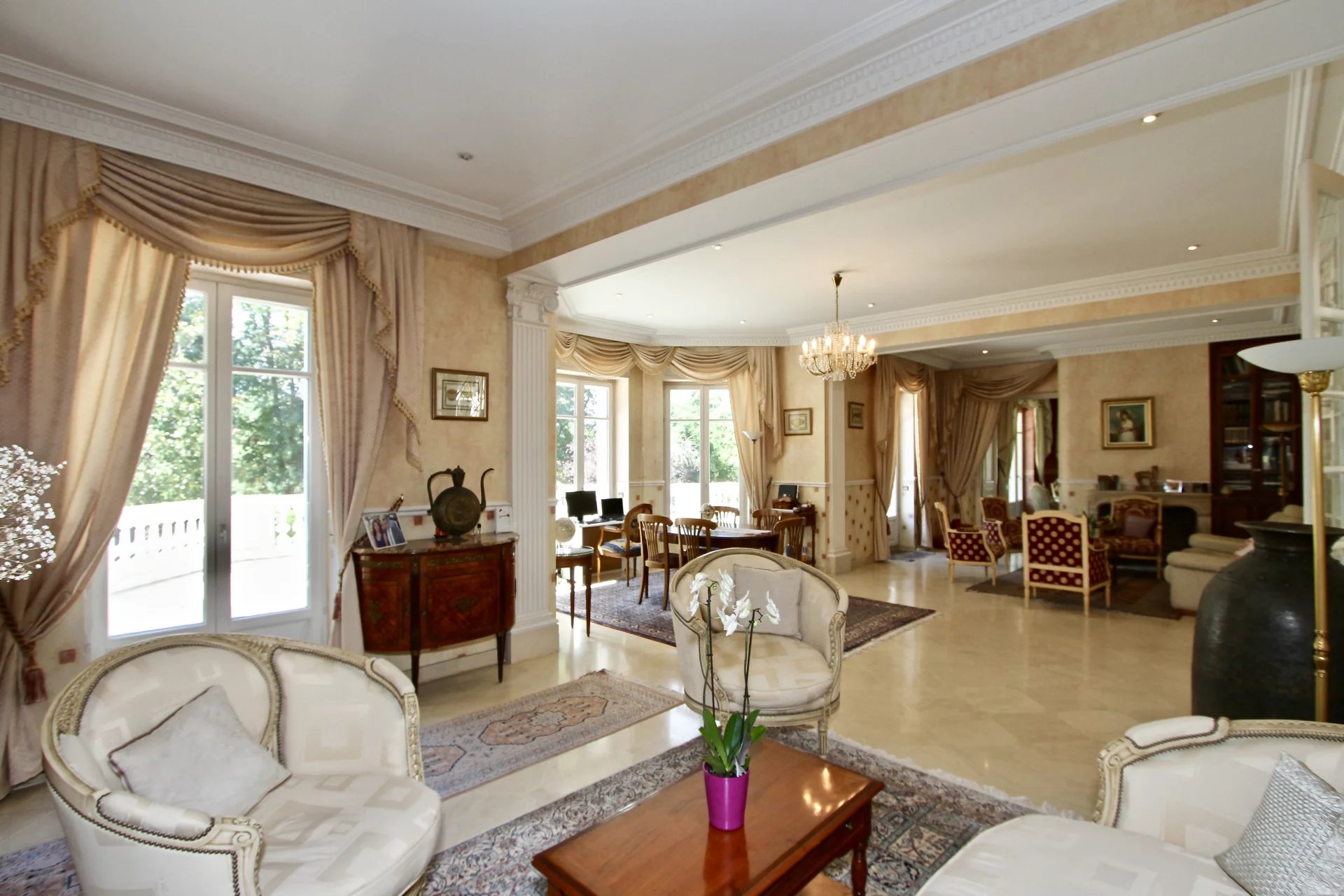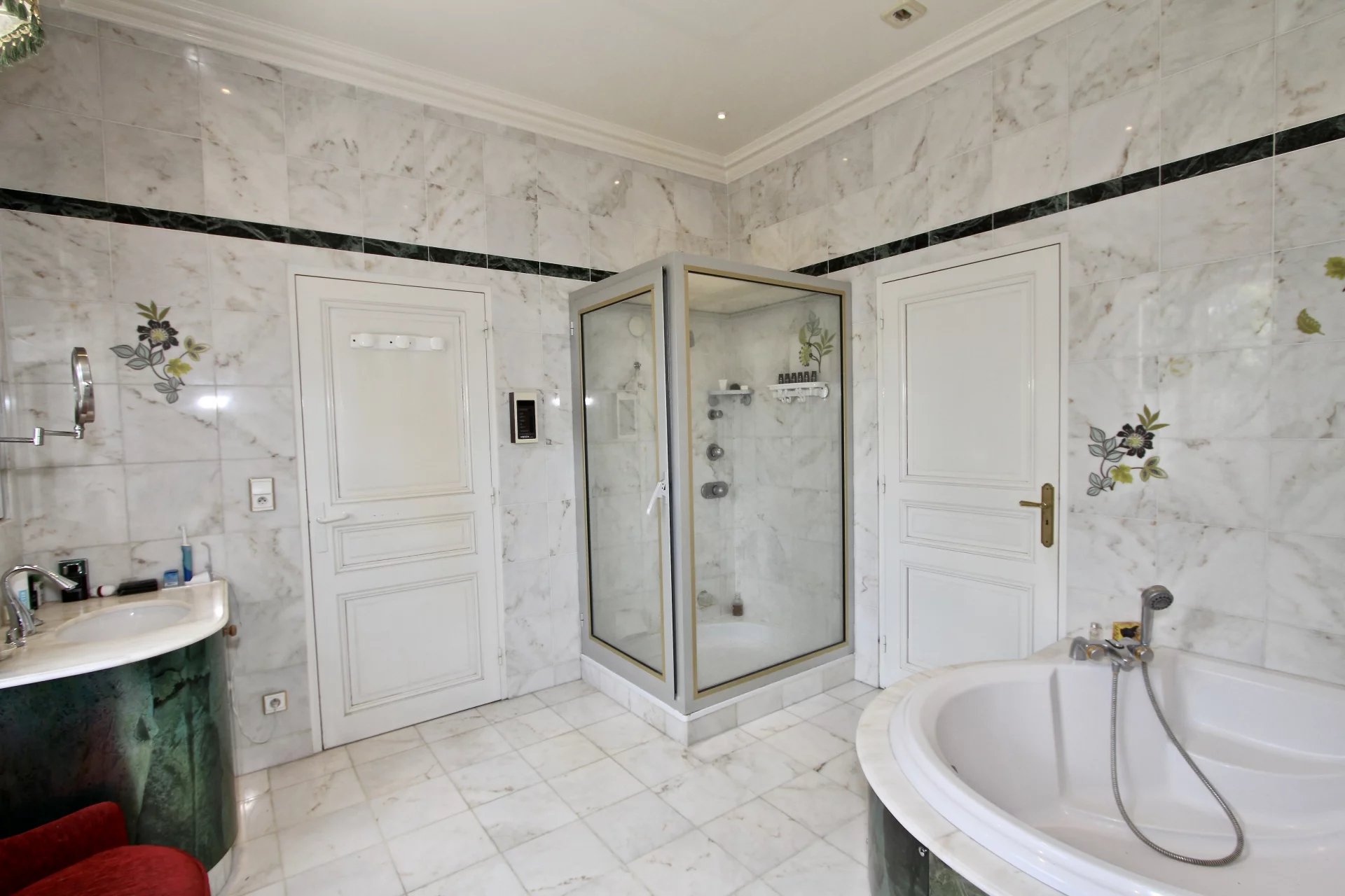 Elle compose : Entrée, vestiaire, toilettes invités, réception de 150 m² (salle à manger, deux salons) ouverte sur une grande terrasse de 100 m², cuisine. 1er étage : 5 chambres avec chacune sa salle de bains ou salle de douche et dressing. 2ème étage :family room sur terrasse, salle de douche sur deux terrasses (chacune 35 m² dont l’une avec piscine a nage. Rez-de-jardin : appartement indépendant comprenant : grande cuisine dînatoire ouvrant sur une belle terrasse et le jardin, salle à manger, salon, 2 chambres, salle de bains et salle de douche, bureau. De nombreuses pièces annexes, garage de 150 m² Chauffage gaz par le sol dans l'ensemble de la maison, volets roulants électriques. Maison de gardien à l'entrée de la propriété d'environ 60 m² + véranda. Charges : électricité 976/an ; gaz 4930/an ; eau 1500€/an . Charges mensuelles 617€/mois. Taxe foncière : 7996€/an .