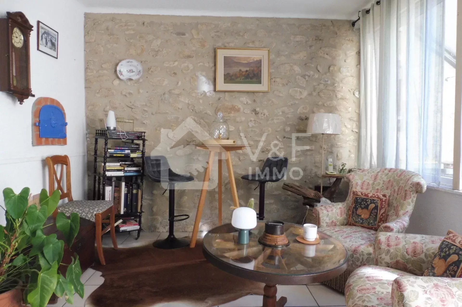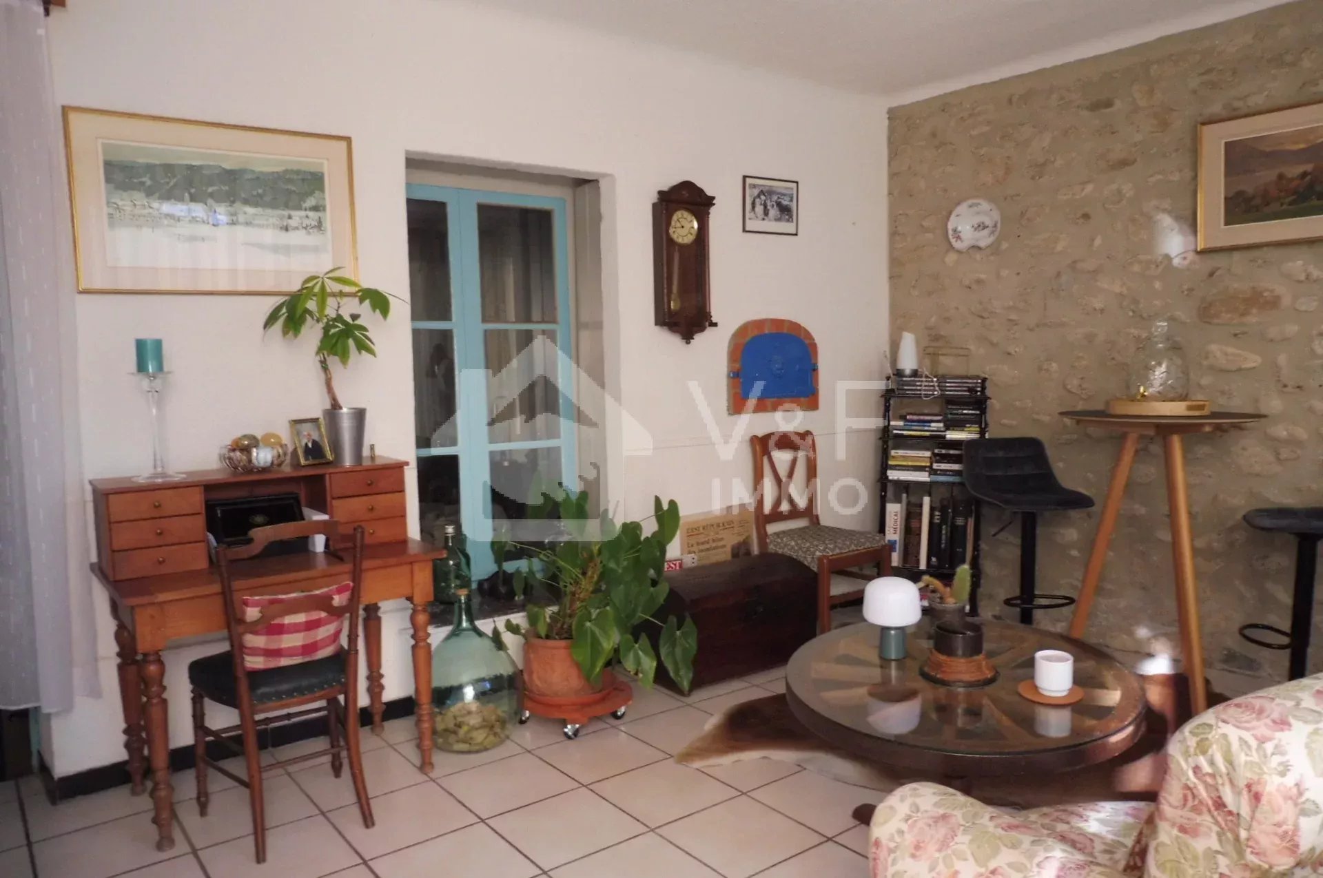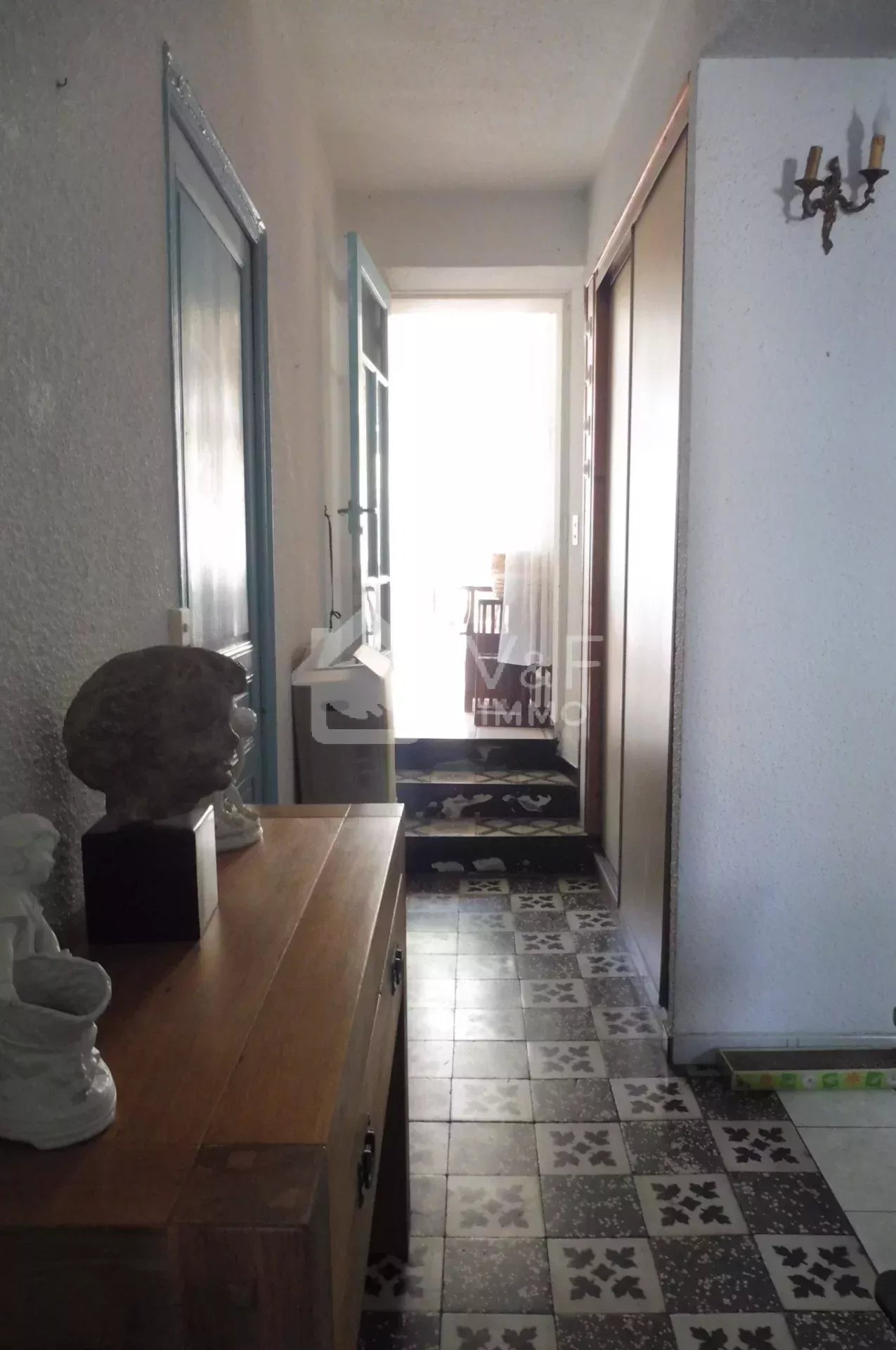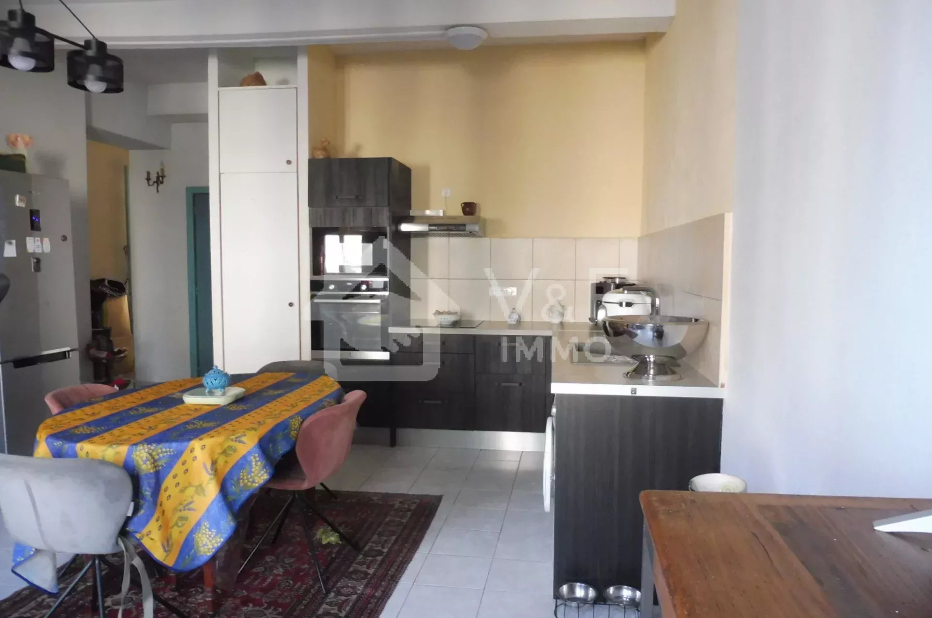 Proche du centre et de ses commerces, grand appartement traversant au charme ancien avec son mur en pierre et son carrelage Catalan. IL se compose d'un séjour cuisine ouverte équipée, un salon, deux belles chambres, Une cour et un garage finalise l'ensemble. Petite copropriété sans charges.