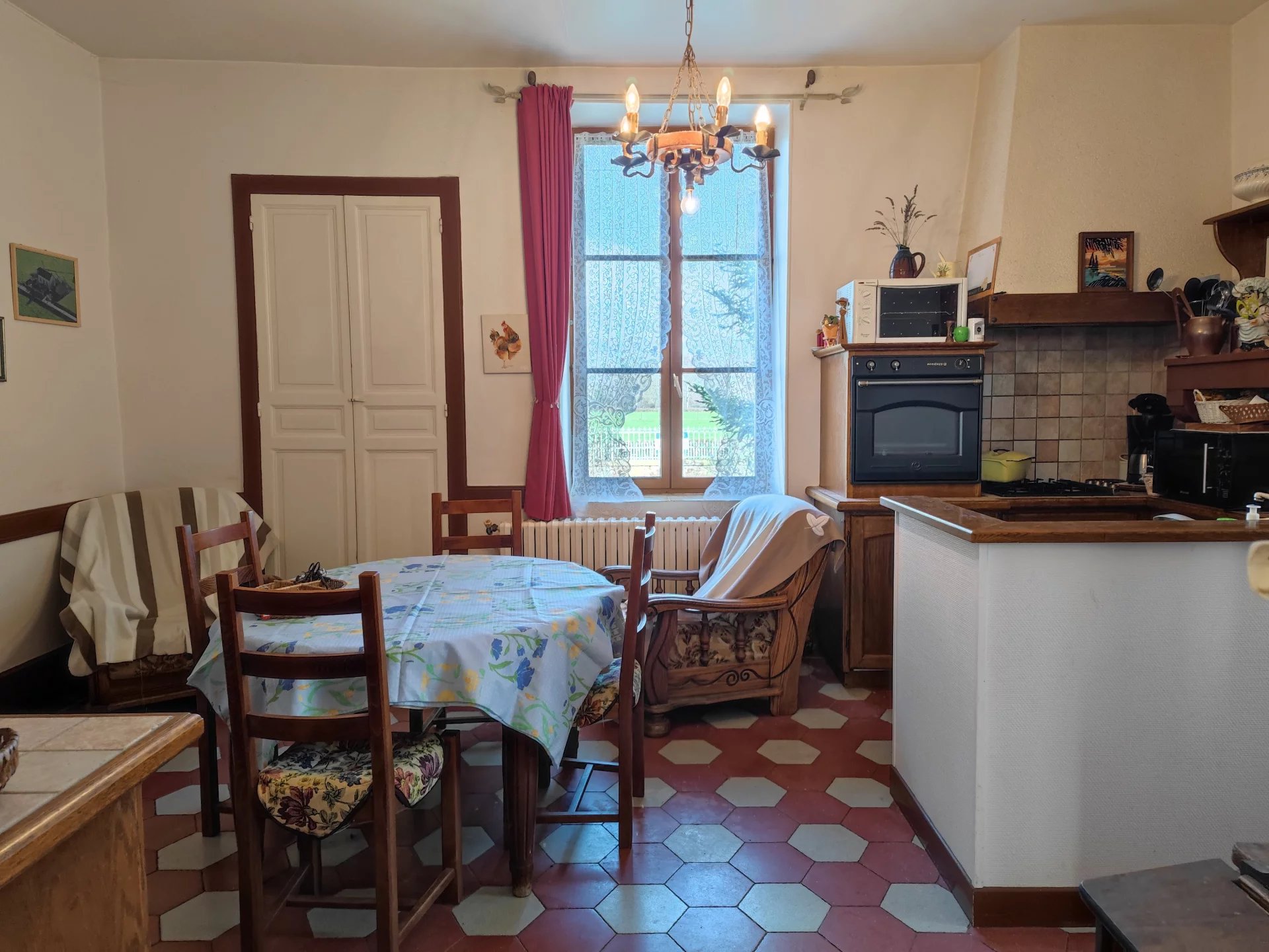 La propriété se compose d’une maison principale élevée sur caves avec au rez-de-chaussée une entrée desservant une cuisine avec coin repas, un salon / salle à manger, suivi de deux chambres, une salle de bain et un WC. Cet espace est en bon état général, pourvu de grandes ouvertures en double vitrages donnant un aspect très lumineux à l’ensemble. Un chauffage central au fioul est présent.