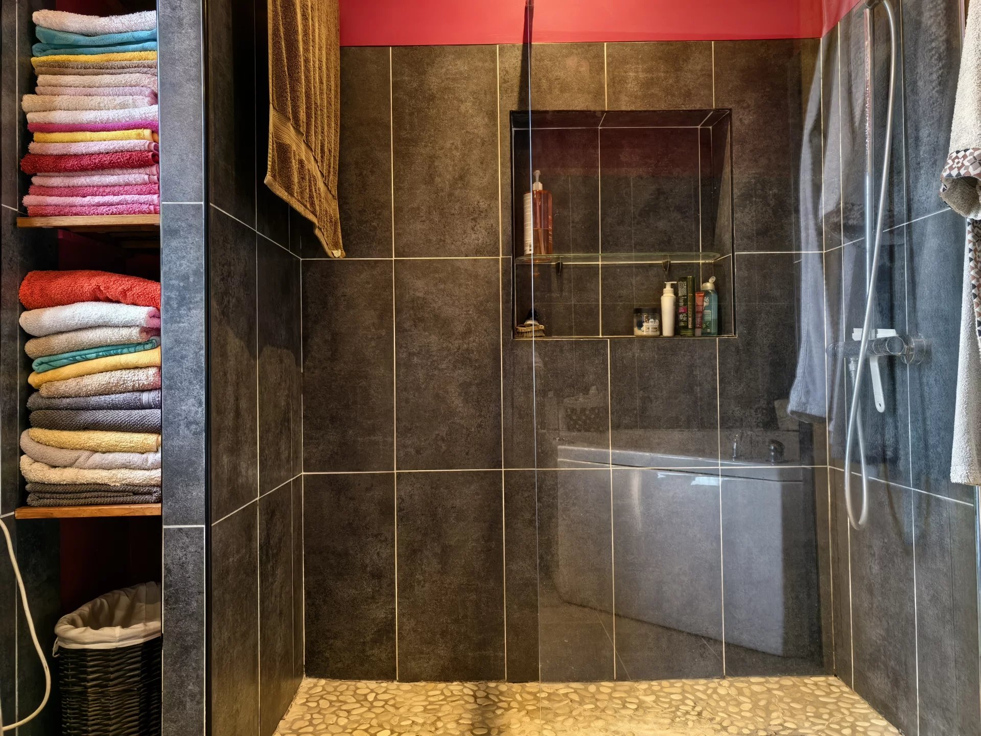 Cette propriété est composée au rez-de-chaussée d’une entrée desservant une très belle pièce de vie de 30m2 avec un accès direct sur la terrasse, suivie d’une cuisine / salle à manger, une salle de bain avec baignoire et douche à l’italienne et un WC indépendant. Un espace buanderie et un atelier complètent le rez-de-chaussée.