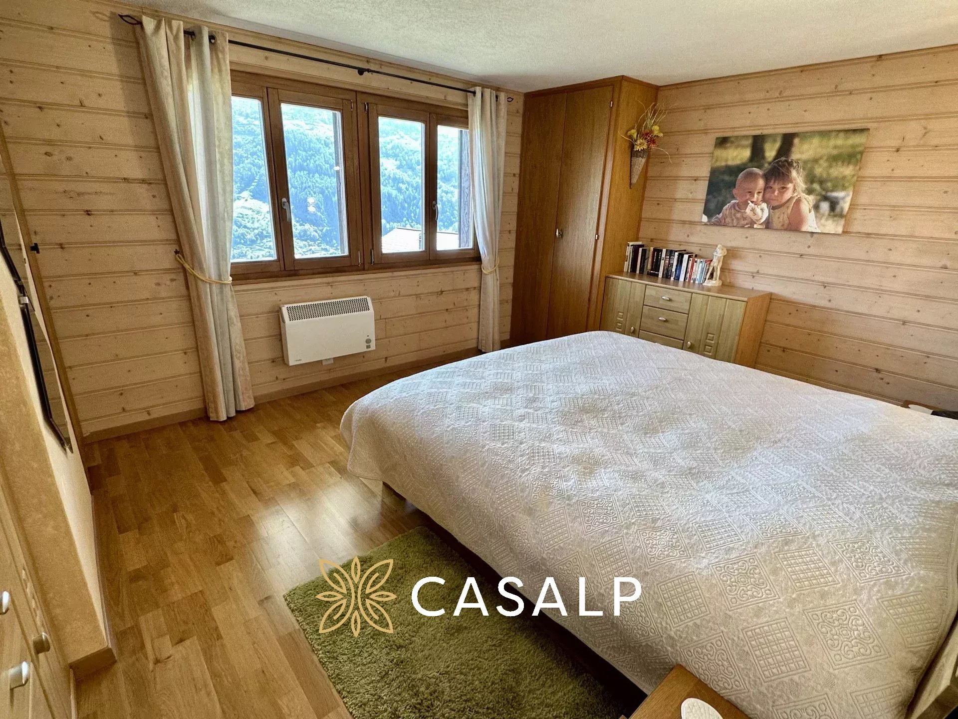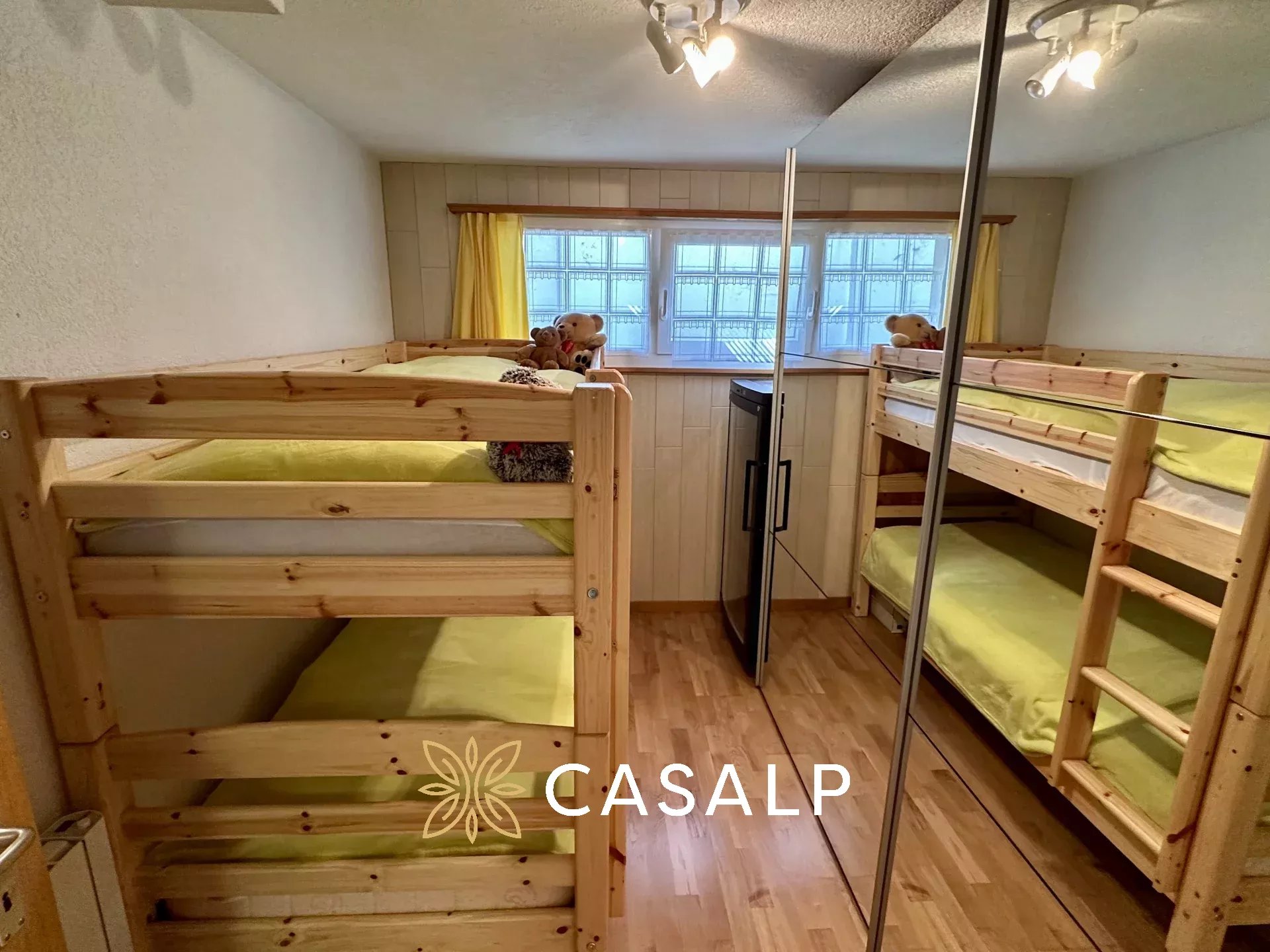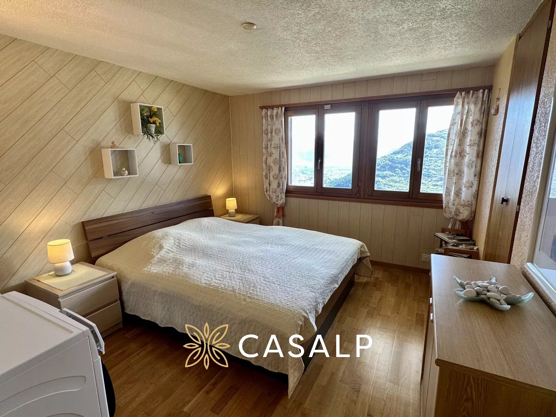 Au rez-de-jardin, les deux grandes chambres à coucher offrent un confort douillet et une plus petite chambre idéal pour des enfants, avec des fenêtres encadrant des panoramas spectaculaires. La salle de douche avec WC moderne vient compléter l'espace.