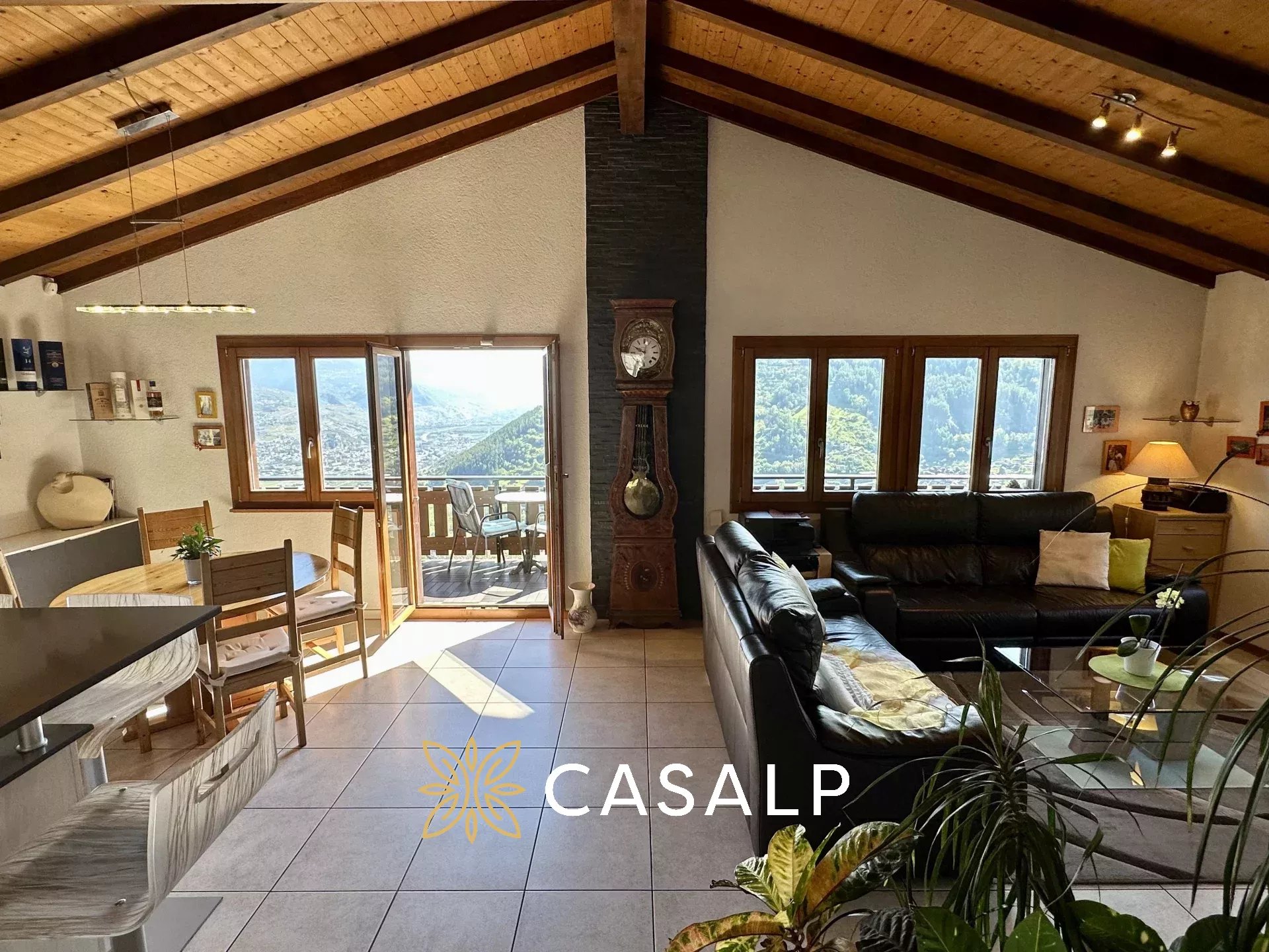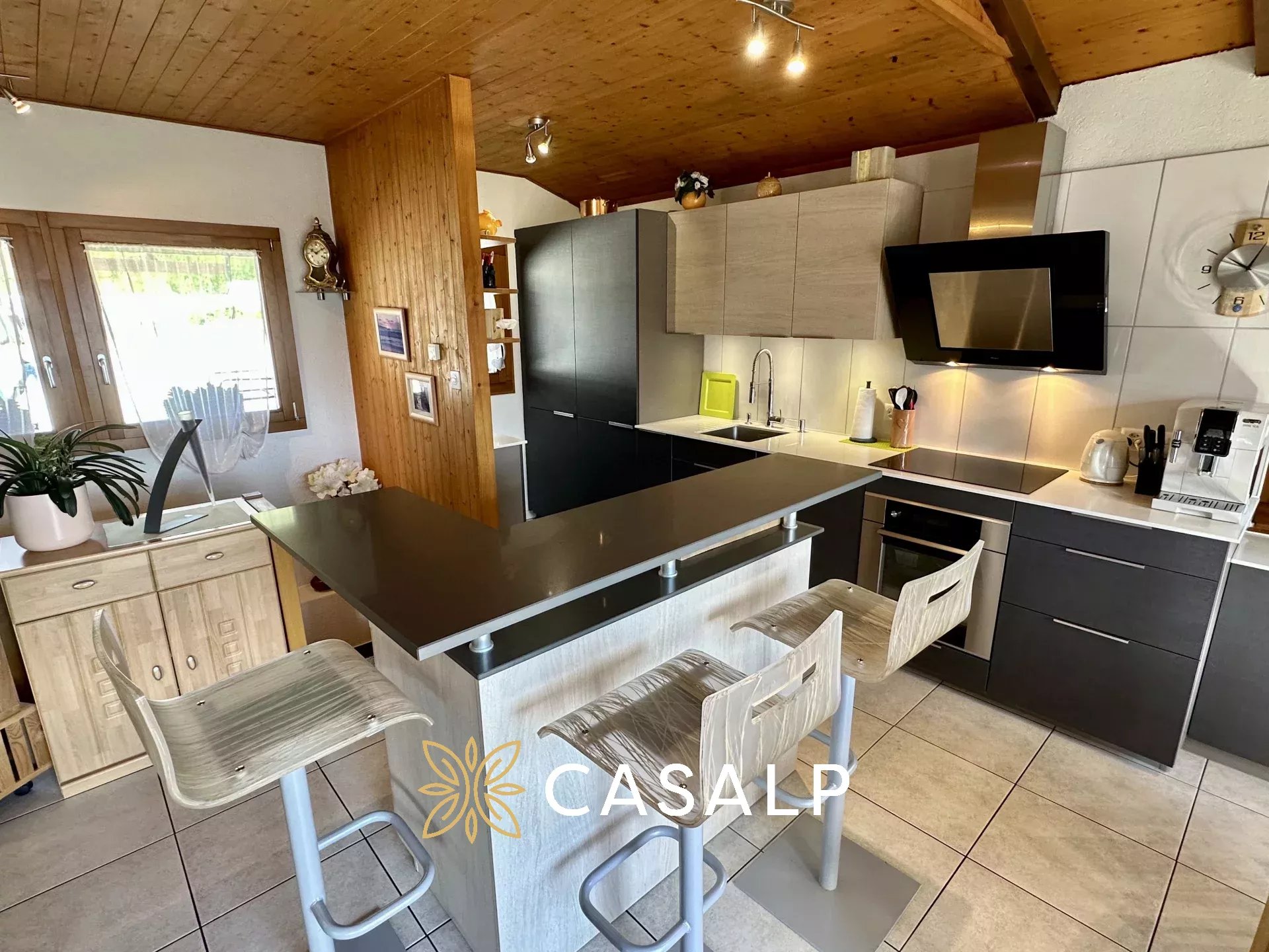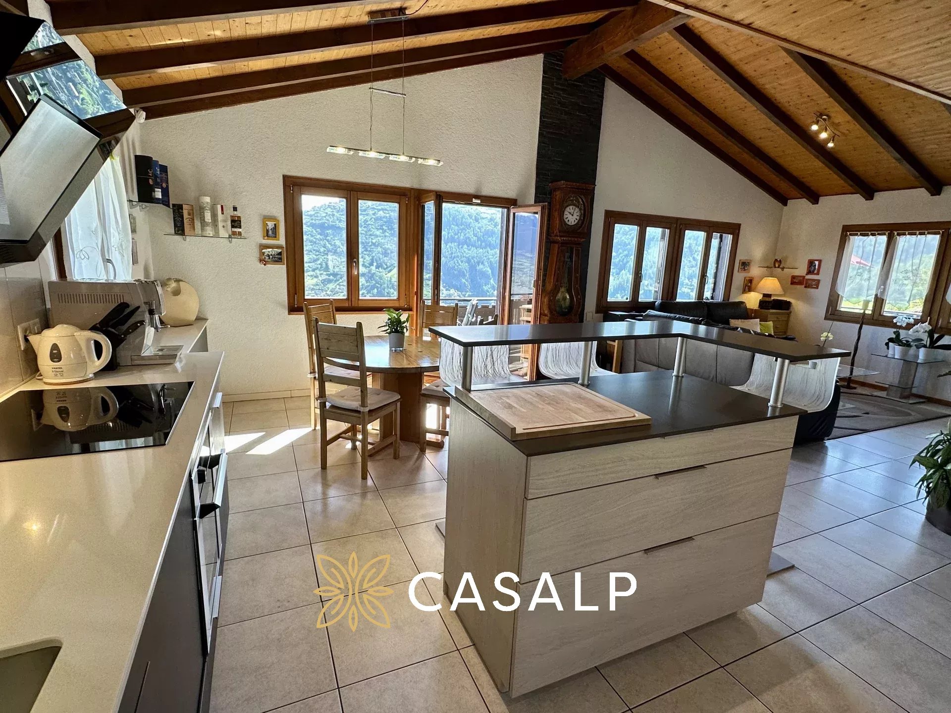 La cuisine ouverte entièrement équipée offre une vue imprenable sur les Alpes, ajoutant une touche de magie à chaque repas.