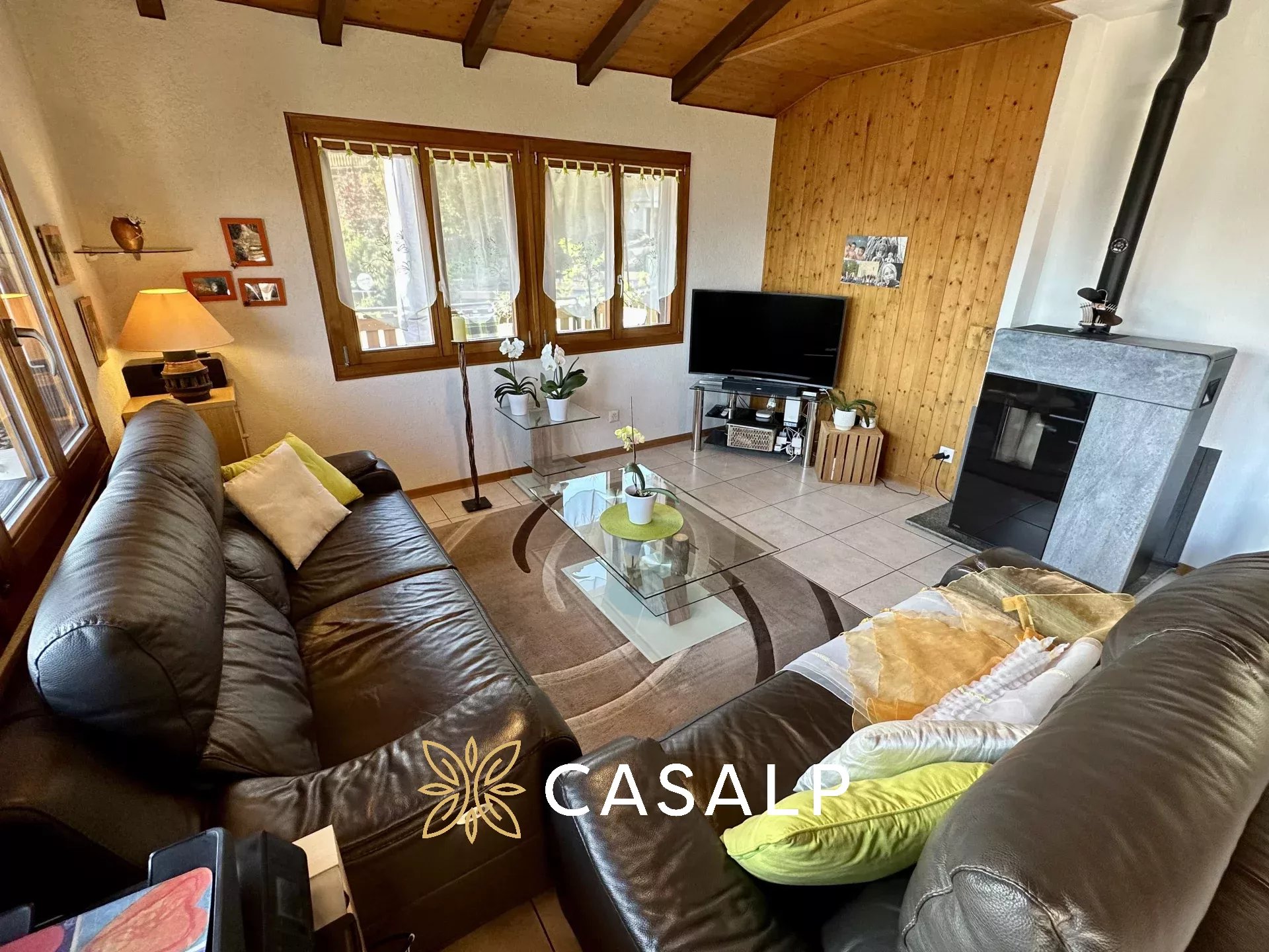 Le salon, équipé d'un poêle à pellets, invite à des soirées confortables près du chauffage.