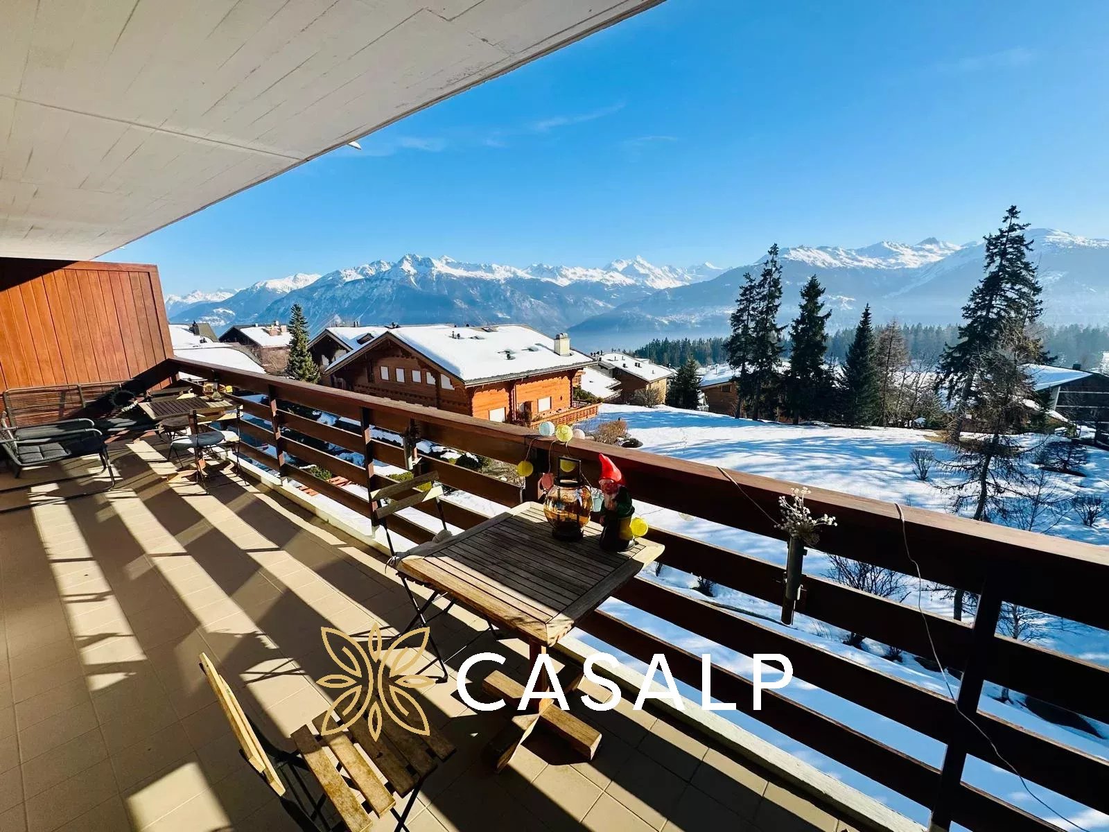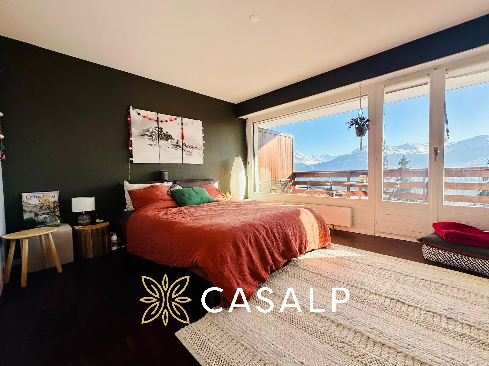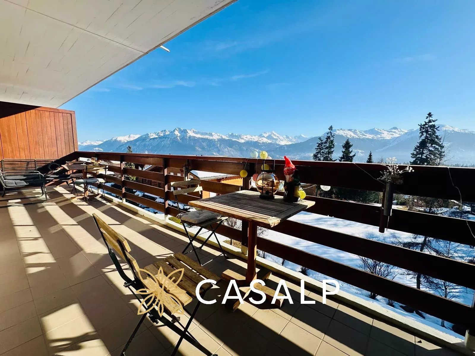 Depuis son vaste balcon carrelé de 18 m², exposé plein sud, profitez d’un ensoleillement optimal tout au long de la journée et d’une vue à couper le souffle sur les Alpes valaisannes, le lac de la Moubra, la forêt environnante et le charmant village de Vercorin.