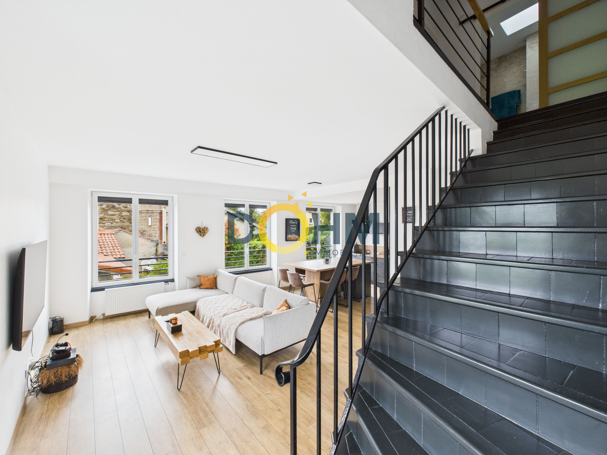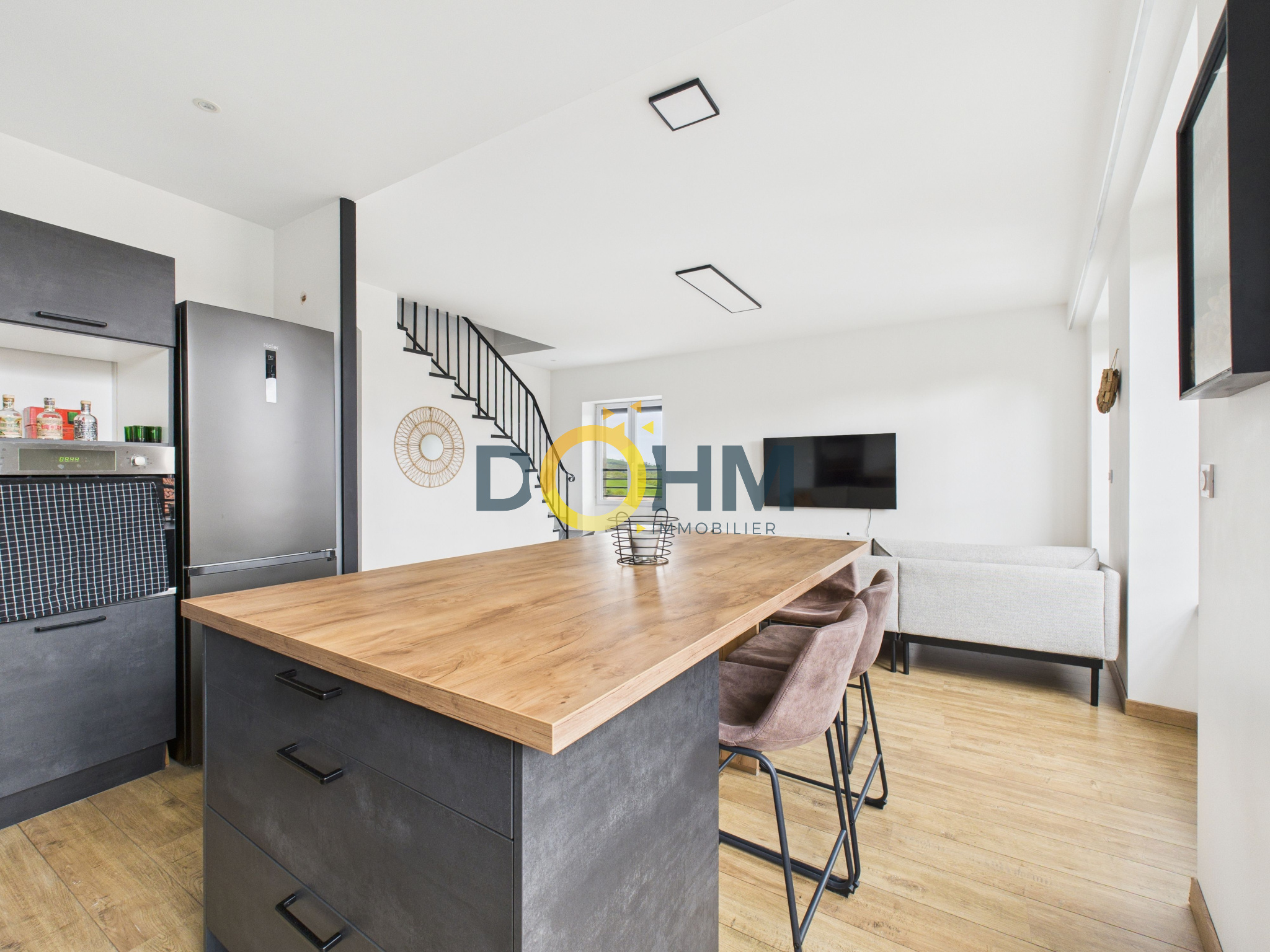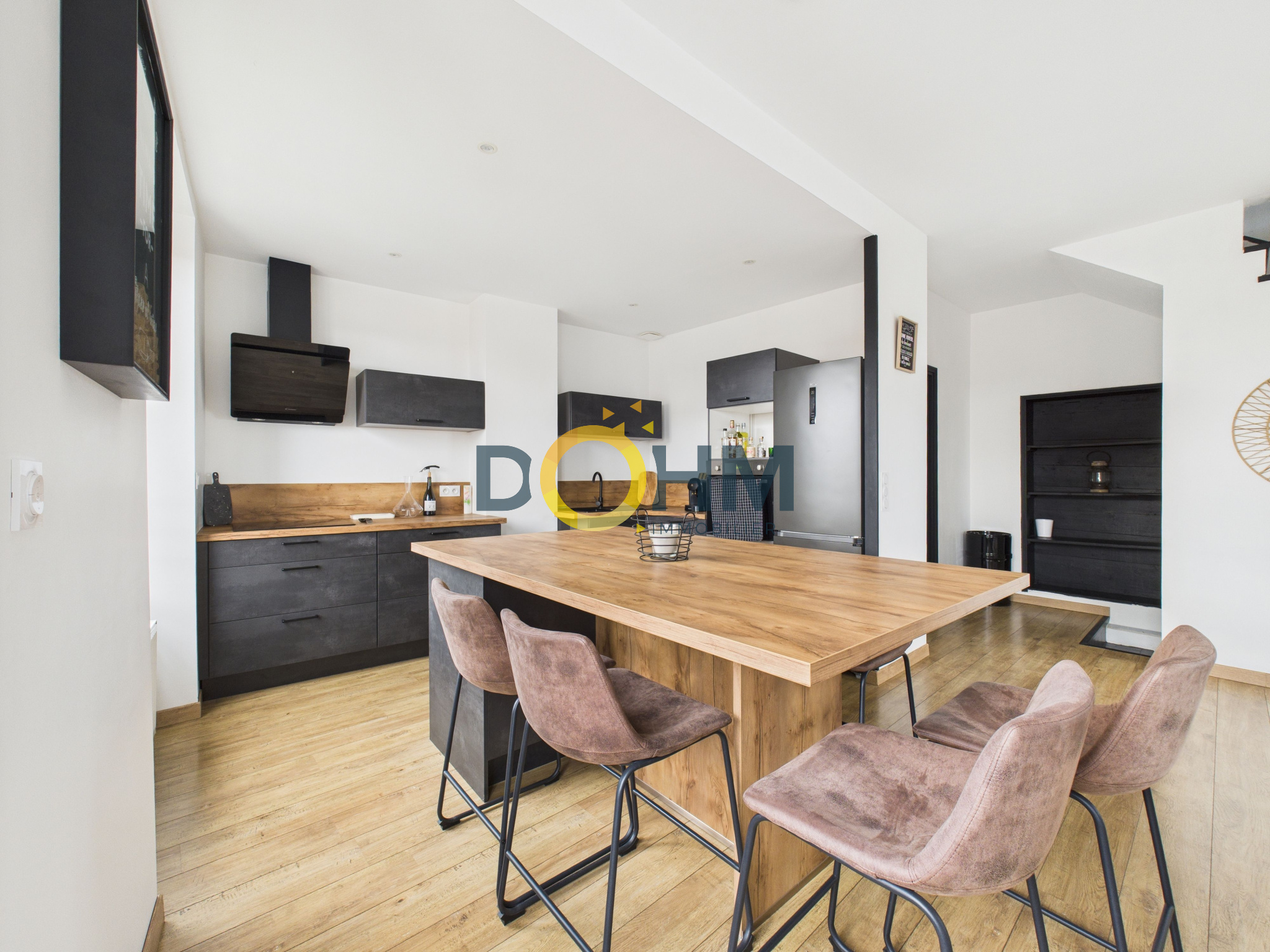Au 1er étage, une pièce de vie avec cuisine ouverte entièrement équipée et aménagée de 38m2 baignée de lumière . le combo confort et style idéal pour recevoir en toute convivialité !