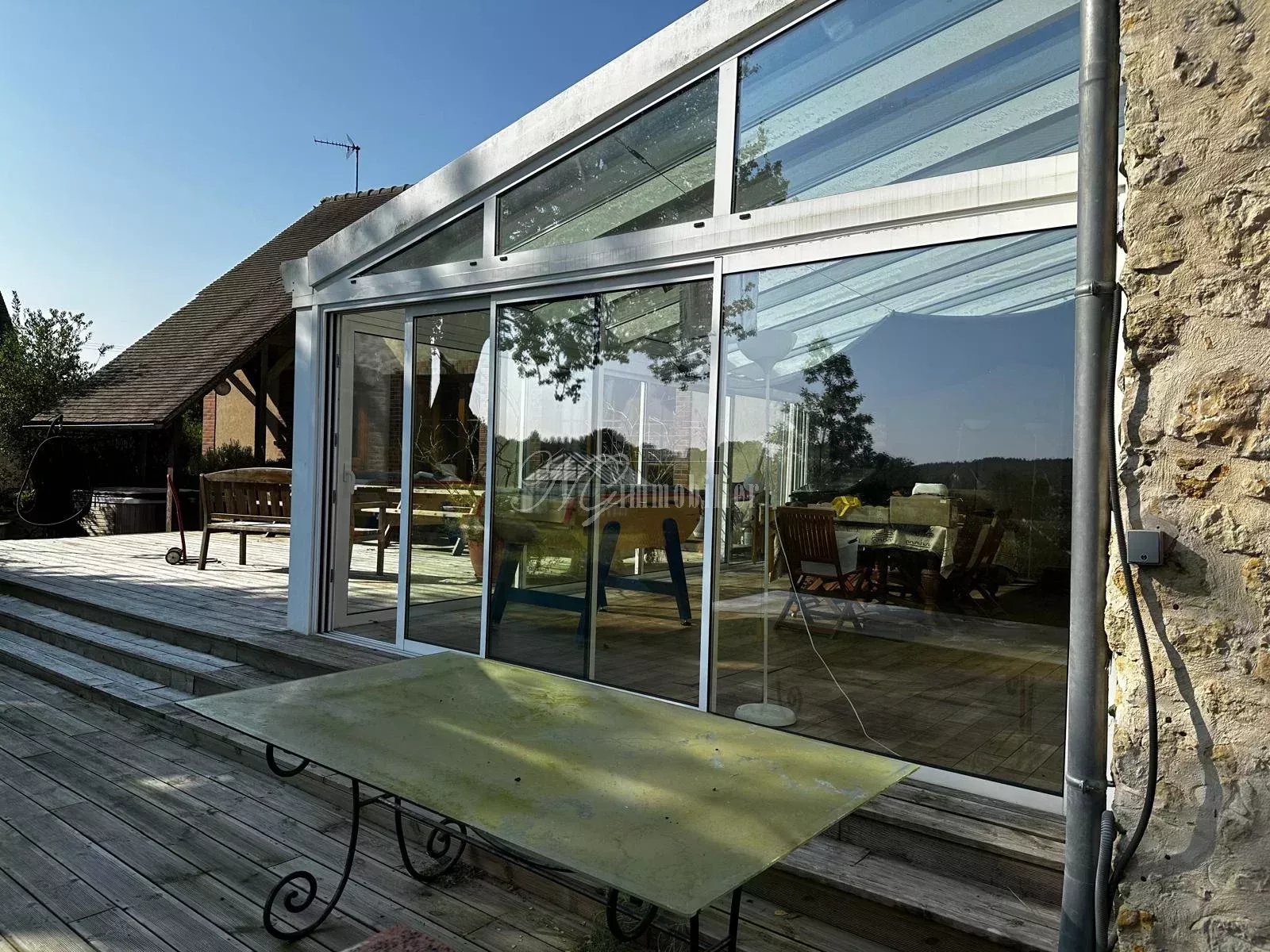 Au fond de la maison, un espace détente vous attend avec un sauna, un hammam et une douche, pour vous ressourcer après une longue journée. Une agréable véranda lumineuse vous offre une vue imprenable sur la campagne environnante.