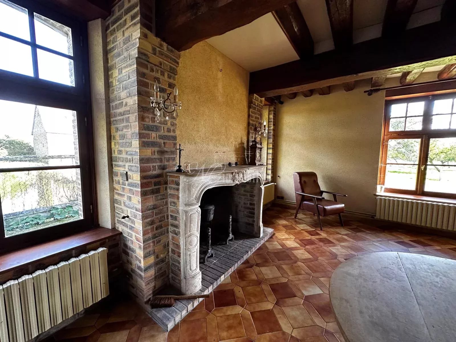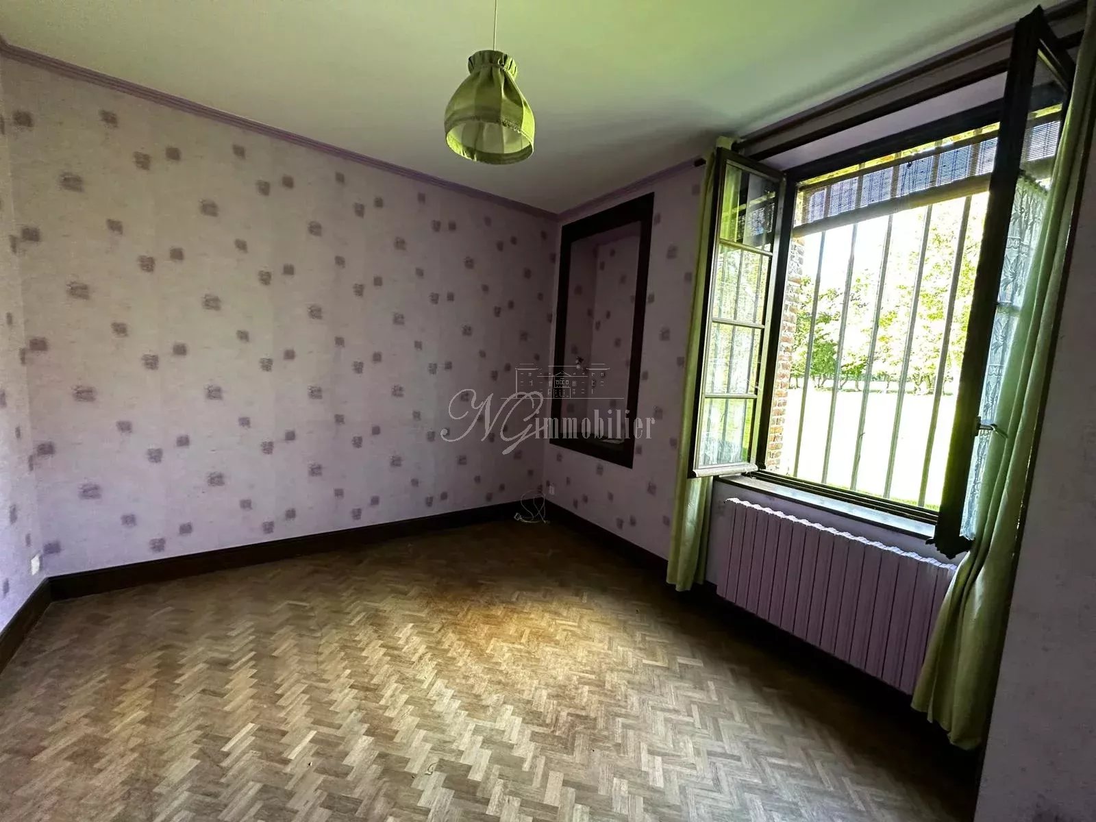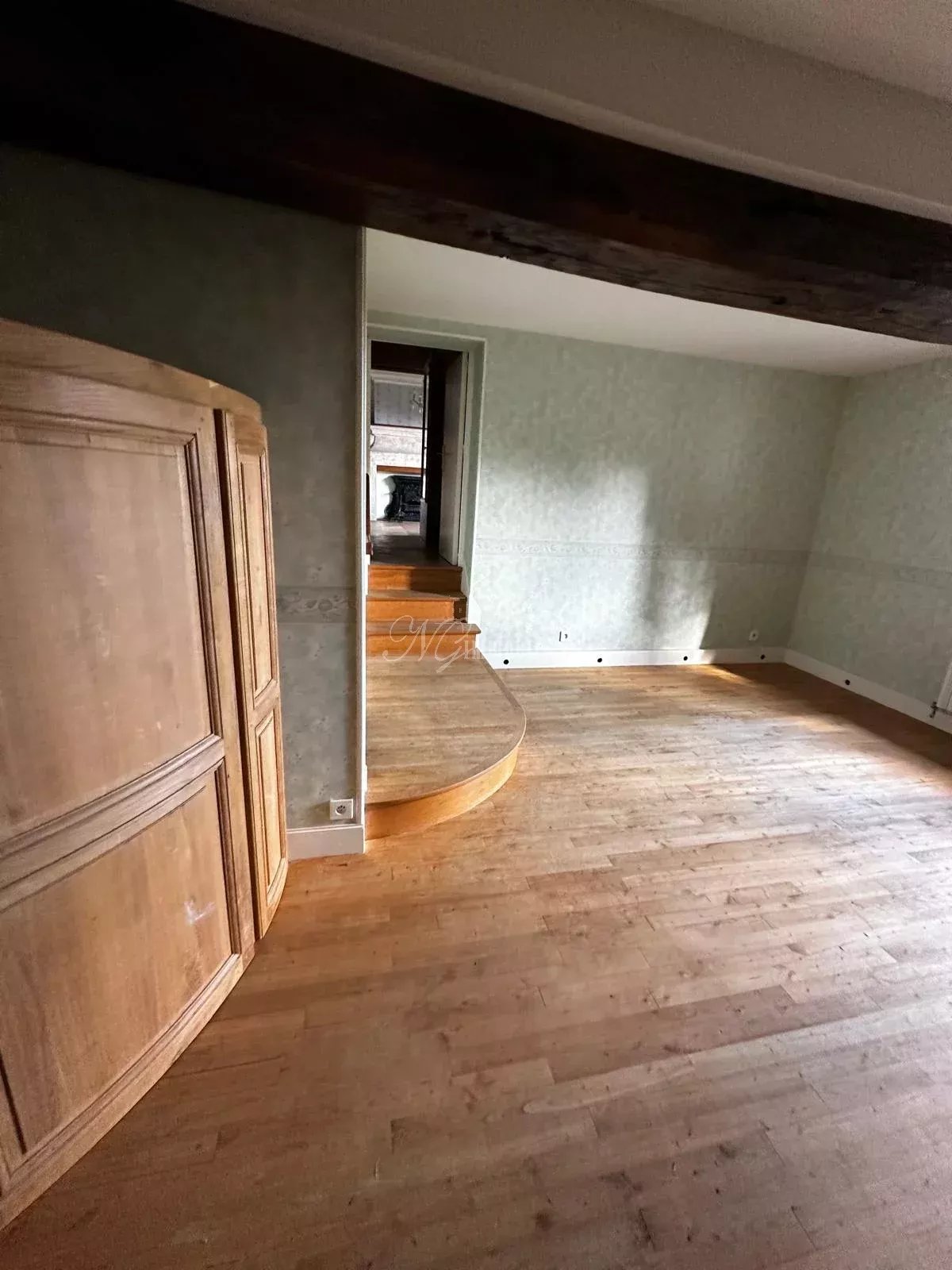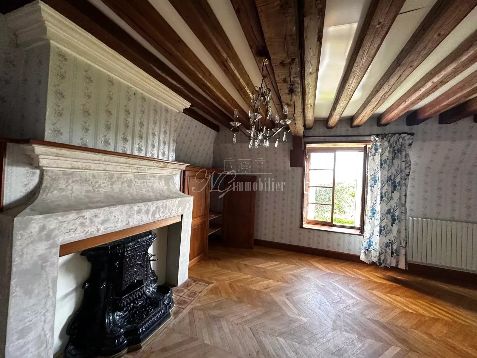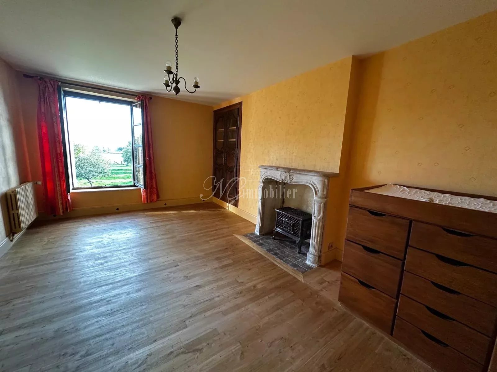 La maison se compose d'une entrée menant à une cuisine équipée et d'un séjour-salon agrémenté d'une cheminée, avec des portes doubles en bois. Le salon, doté d'une cheminée ouverte en chêne, est un espace chaleureux idéal pour se détendre. Vous trouverez également une chambre à rafraîchir, offrant une vue sur la campagne et un parquet en chêne massif. La maison dispose d'une salle d'eau, d'un WC séparé, ainsi qu'une arrière-cuisine et une chaufferie, avec un espace dédié au rangement.