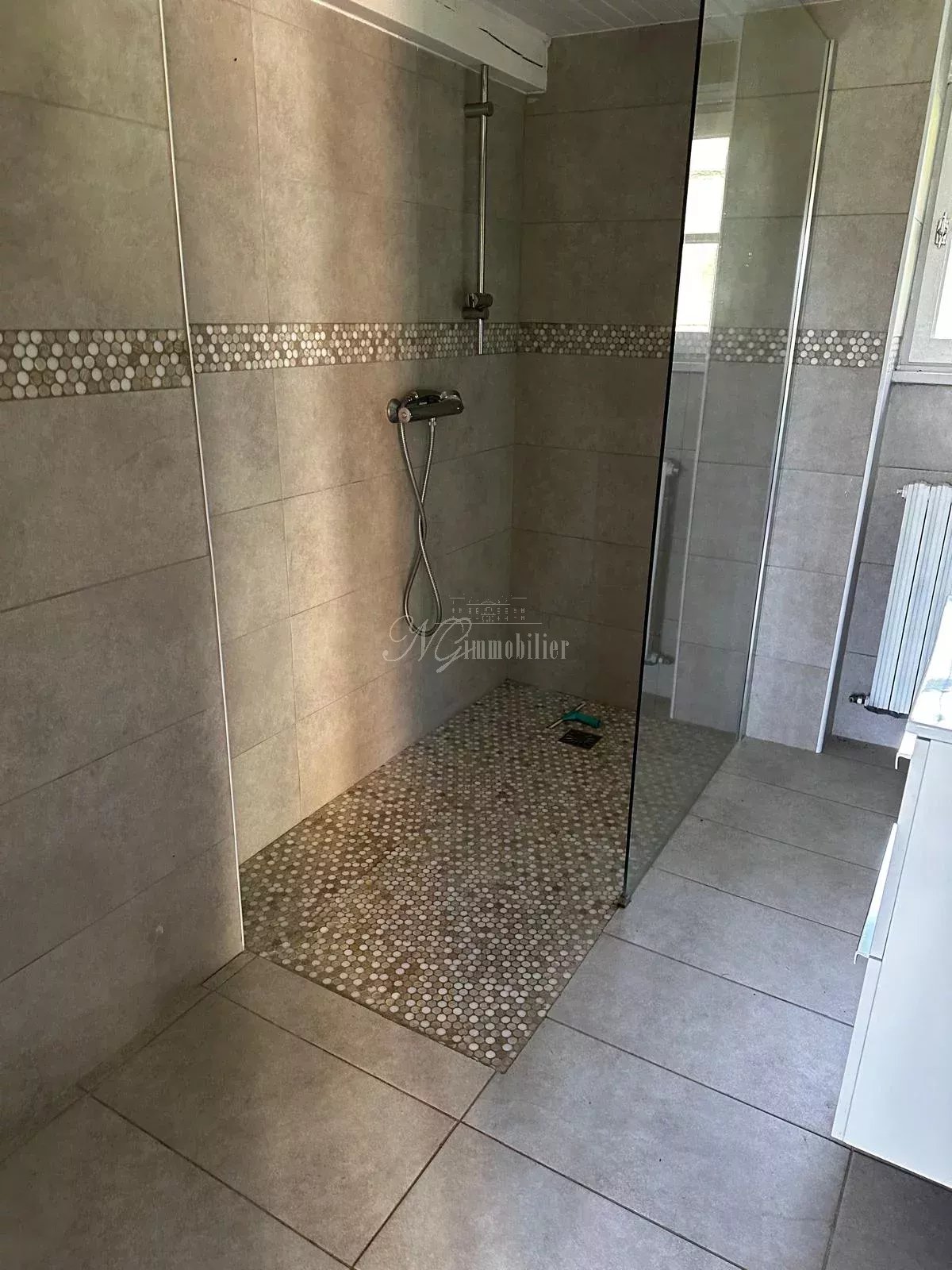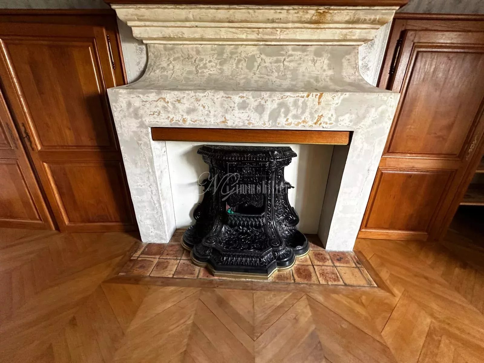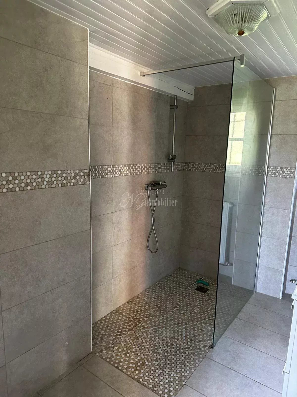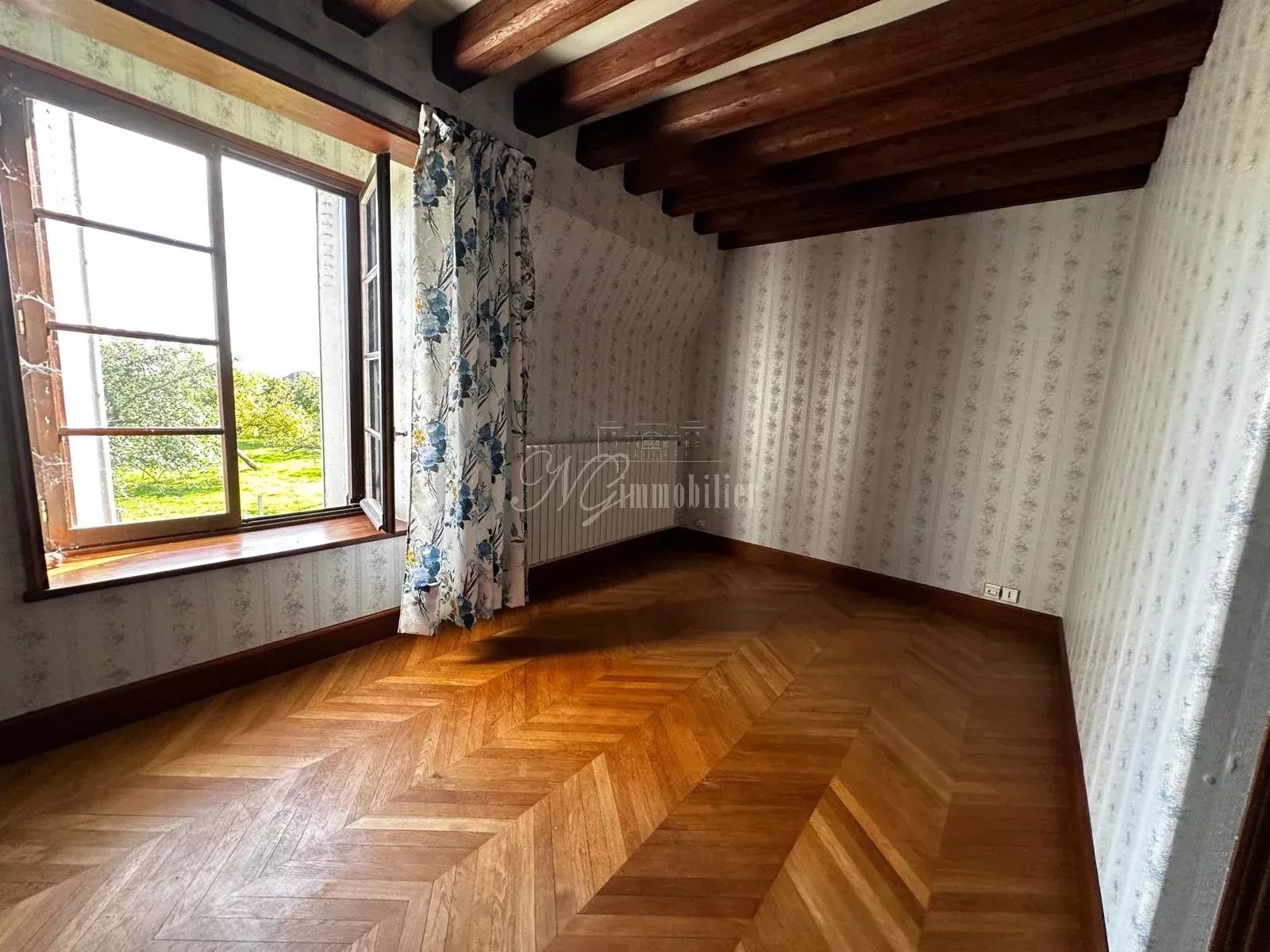 À l'étage, vous découvrirez trois chambres, dont une avec salle d'eau et WC, équipée d'un meuble en chêne et frêne. Le parquet, également en chêne, s'étend à l'étage, où un escalier élégant mène à une pièce palière.