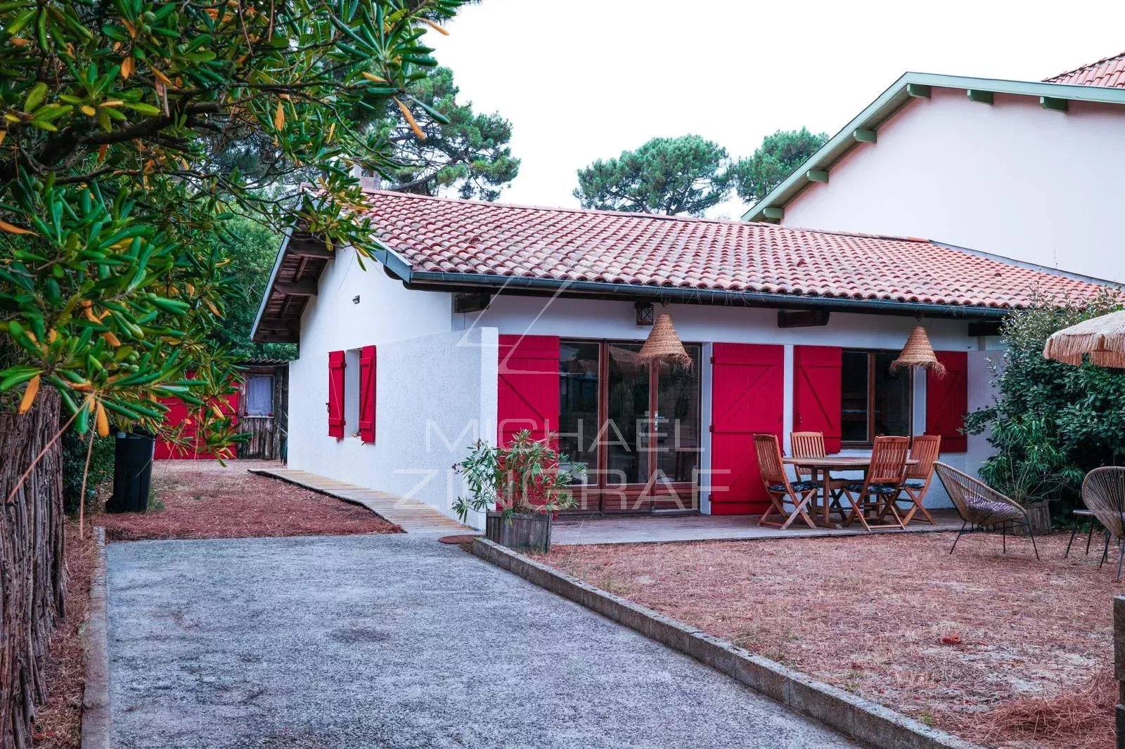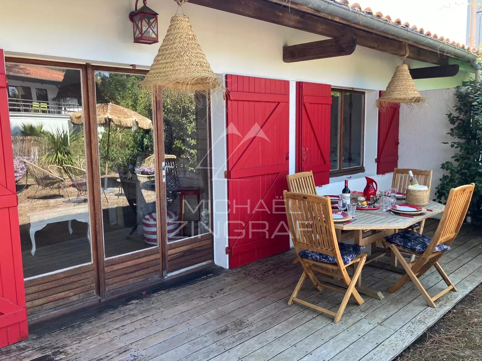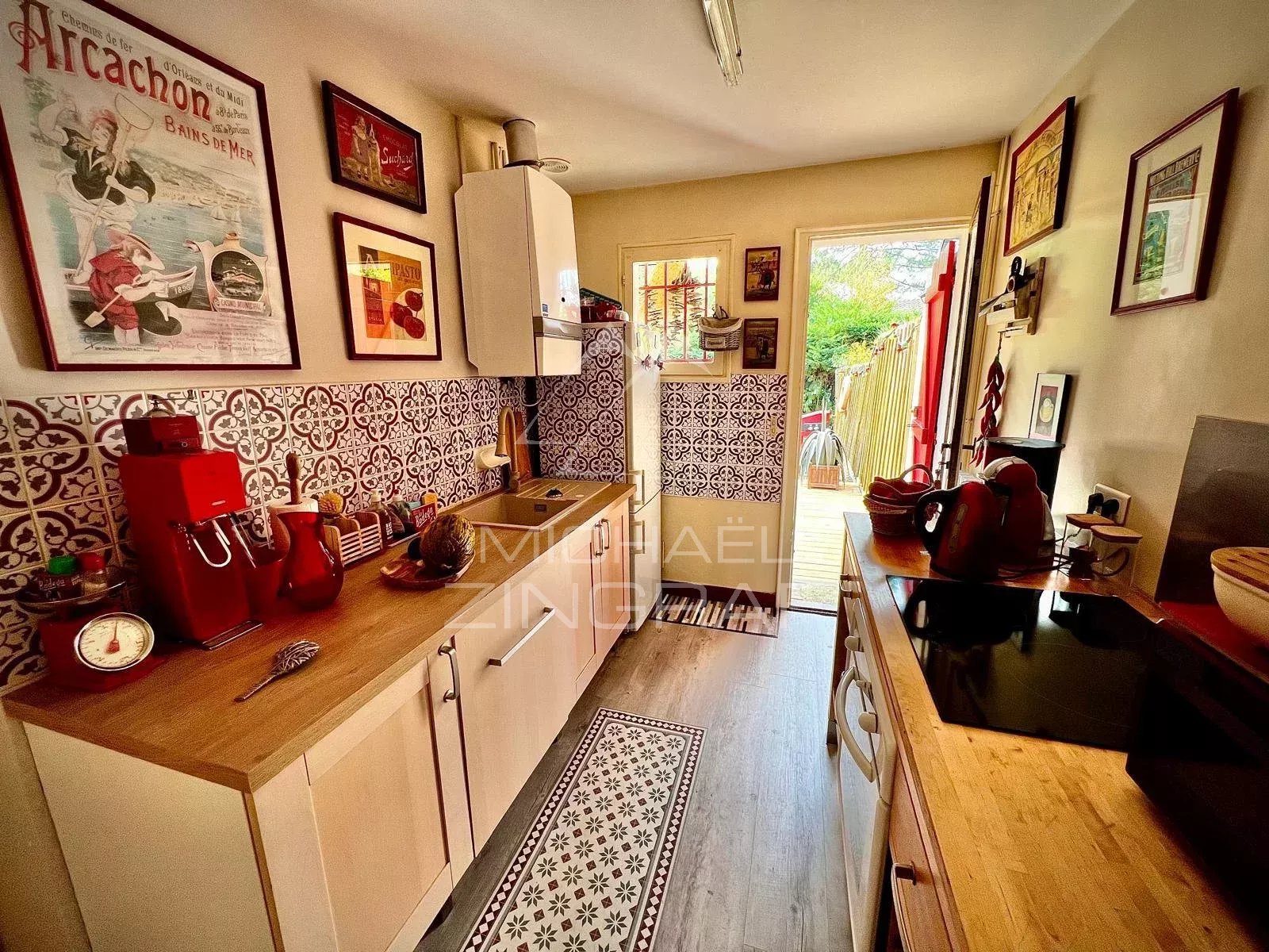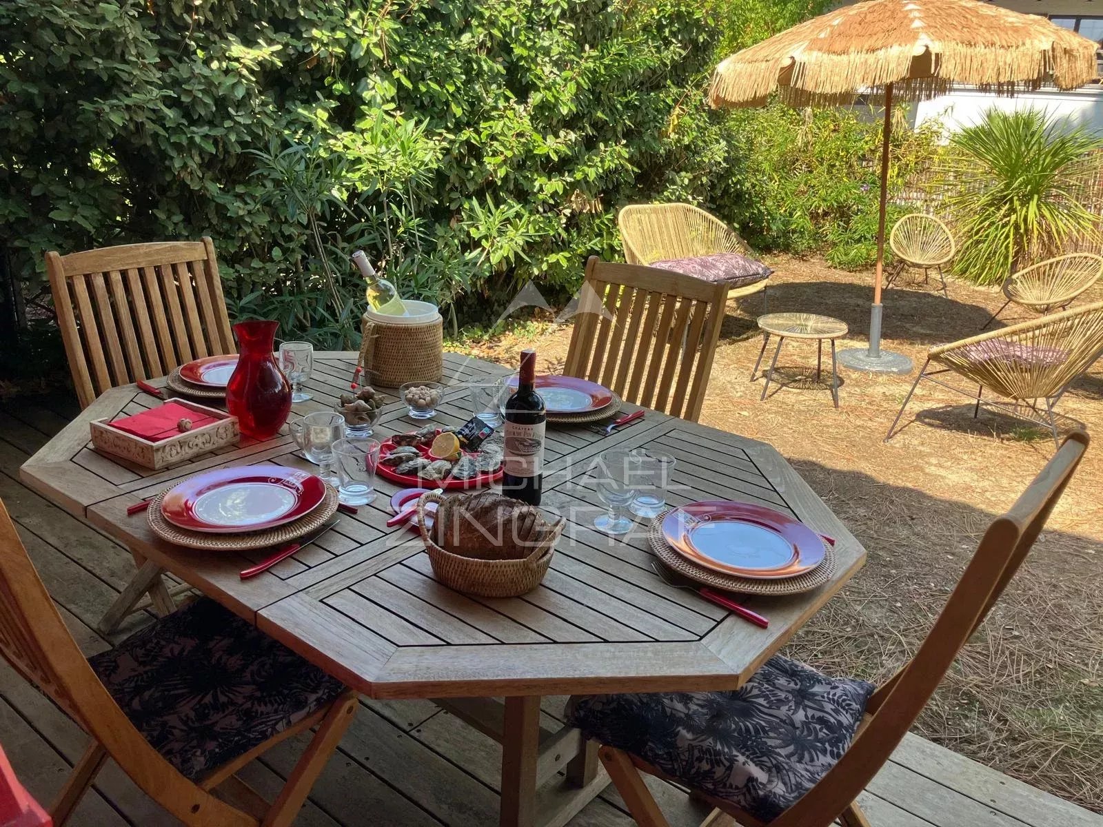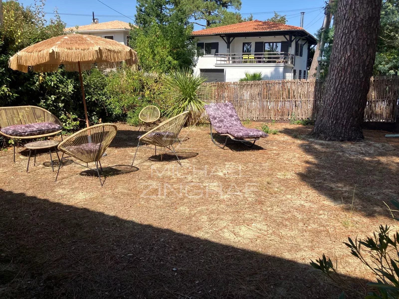 La maison des Pins... Cette charmante maison mitoyenne de 70 m2 et de plain-pied, dotée d'une double exposition Sud et Nord, est située dans le quartier résidentiel particulièrement calme des Abatilles à Arcachon. Côté intérieur... - Une cuisine indépendante entièrement équipée donnant directement sur la terrasse côté Sud. - Une chambre avec un lit en 160, une armoire/penderie, un porte-bagages, deux tables de nuit. - Une deuxième chambre avec 2 X 2 lits superposés de 90, un fauteuil, une commode, une table de nuit, des tiroirs de rangements sous les lits, un porte-bagages et une enceinte connectée. - Un séjour donnant sur le jardin côté Nord, comprenant côté salon un canapé, un pouf, deux fauteuils en osier et côté repas, une table avec deux bancs et une console. - Un WC indépendant. - Une salle d'eau entièrement rénovée avec douche à l'italienne et double vasques. - Une buanderie avec machine à laver, planche à repasser, centrale vapeur, étendoir et baignoire pour bébé. Côté extérieur... Un jardin côté Sud, avec une douche extérieur pour les retours de plage, une table à manger avec chaises et une plancha. Un jardin côté Nord, avec une table, des chaises, un salon de jardin et un parasol. Possibilité de garer deux véhicules sur la parcelle. Cette maison est idéale pour des vacances en famille. Quatre vélos sont à disposition pour les locations de juillet et août.