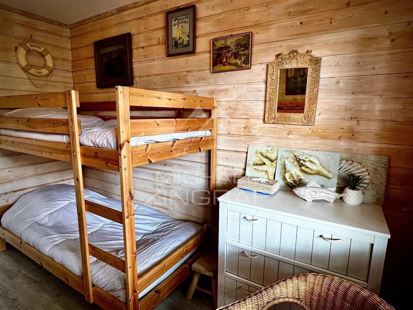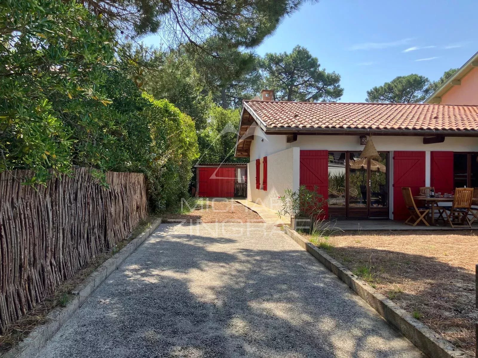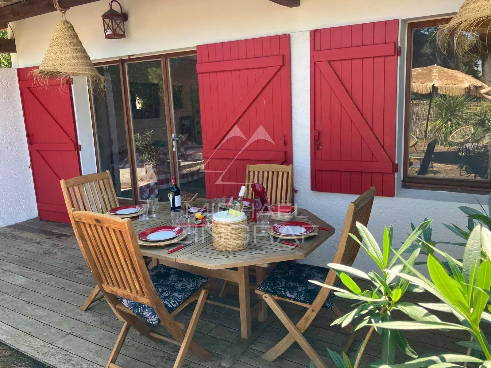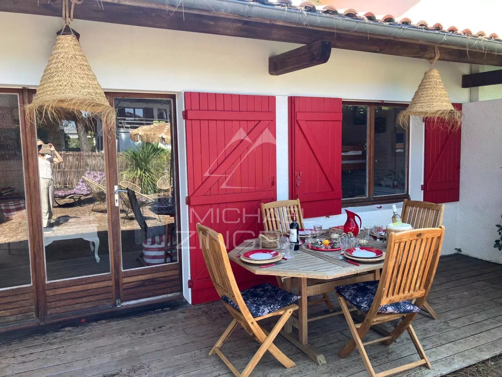 La maison des Pins... Cette charmante maison mitoyenne de 70 m2 et de plain-pied, dotée d'une double exposition Sud et Nord, est située dans le quartier résidentiel particulièrement calme des Abatilles à Arcachon. Côté intérieur... - Une cuisine indépendante entièrement équipée donnant directement sur la terrasse côté Sud. - Une chambre avec un lit en 160, une armoire/penderie, un porte-bagages, deux tables de nuit. - Une deuxième chambre avec 2 X 2 lits superposés de 90, un fauteuil, une commode, une table de nuit, des tiroirs de rangements sous les lits, un porte-bagages et une enceinte connectée. - Un séjour donnant sur le jardin côté Nord, comprenant côté salon un canapé, un pouf, deux fauteuils en osier et côté repas, une table avec deux bancs et une console. - Un WC indépendant. - Une salle d'eau entièrement rénovée avec douche à l'italienne et double vasques. - Une buanderie avec machine à laver, planche à repasser, centrale vapeur, étendoir et baignoire pour bébé. Côté extérieur... Un jardin côté Sud, avec une douche extérieur pour les retours de plage, une table à manger avec chaises et une plancha. Un jardin côté Nord, avec une table, des chaises, un salon de jardin et un parasol. Possibilité de garer deux véhicules sur la parcelle. Cette maison est idéale pour des vacances en famille. Quatre vélos sont à disposition pour les locations de juillet et août.