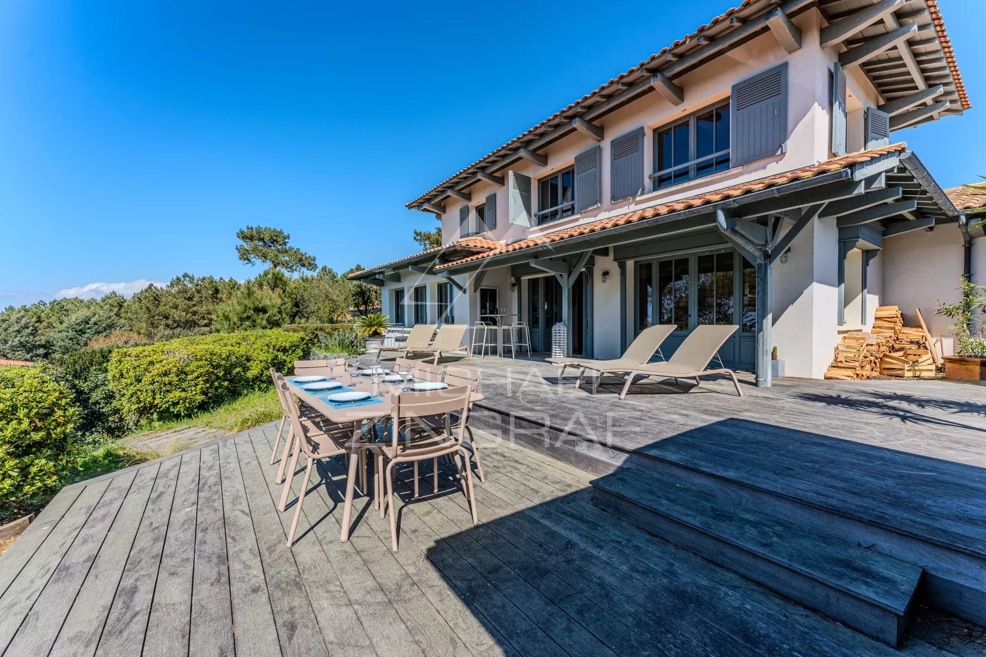 - Une terrasse avec espace repos équipé de transats et espace repas.