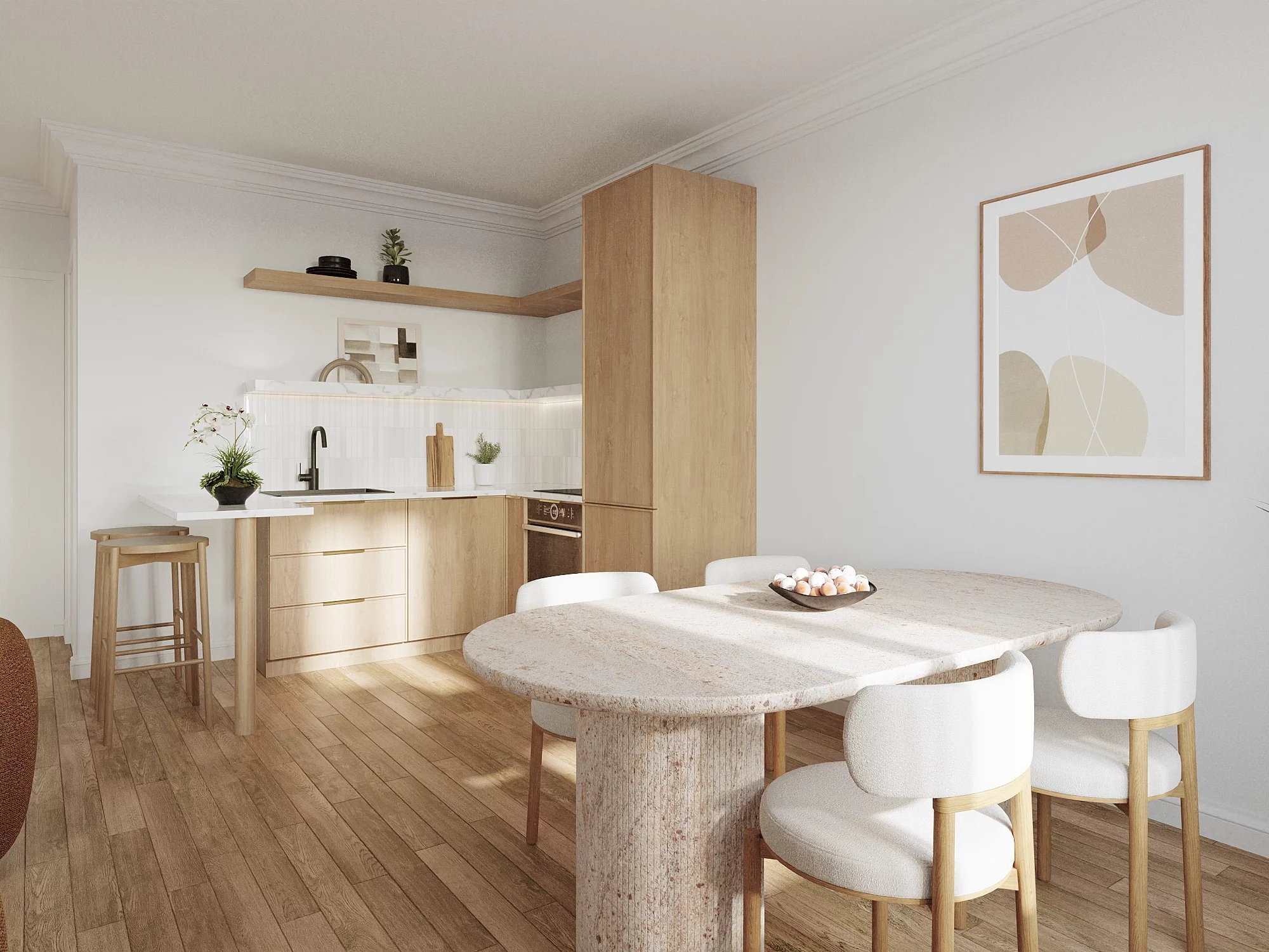 - Une grande pièce de vie de 31m2 avec une cuisine ouverte ou semi ouverte bénéficiant de deux grandes fenêtres donnant sur une cours exposée sud-ouest.