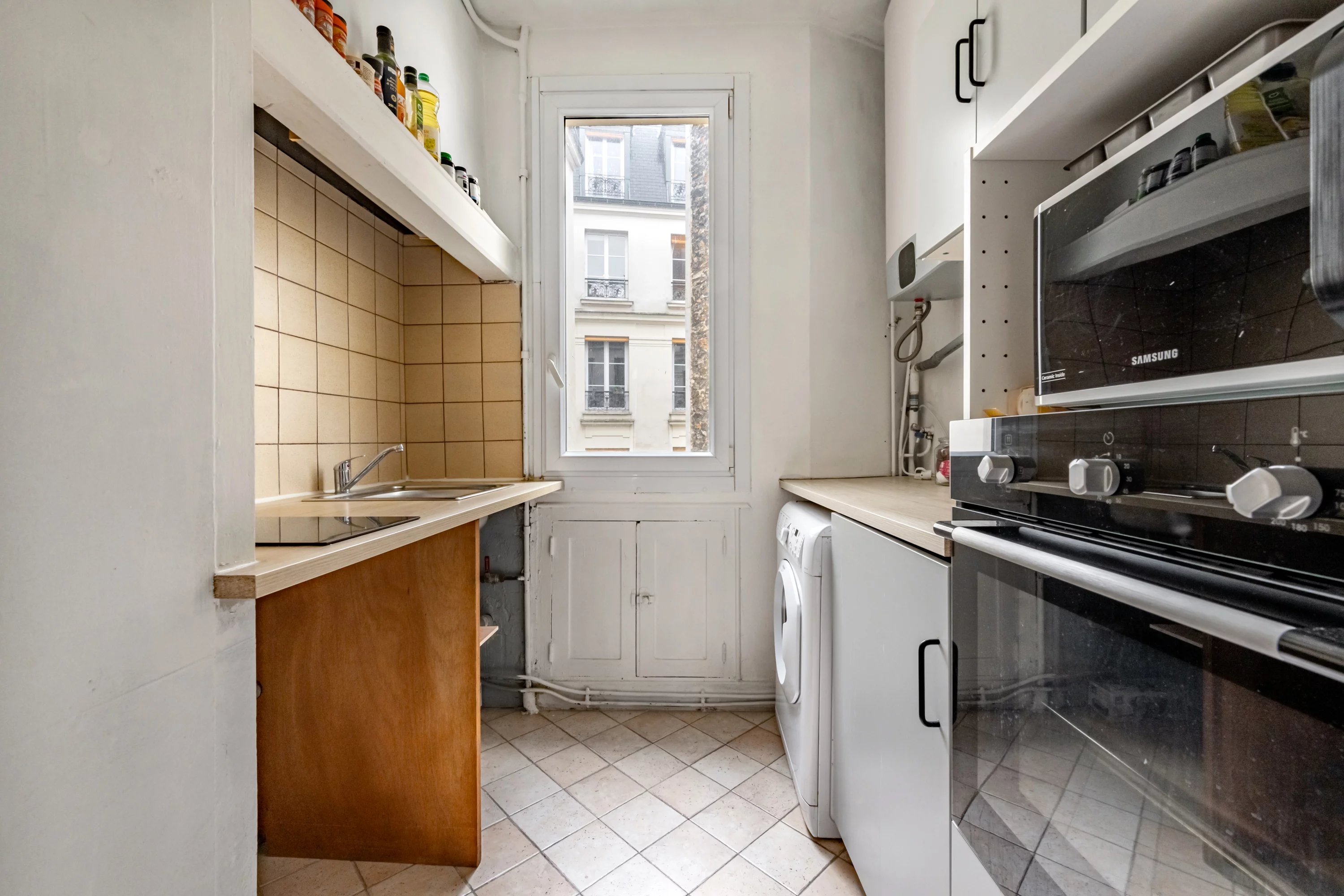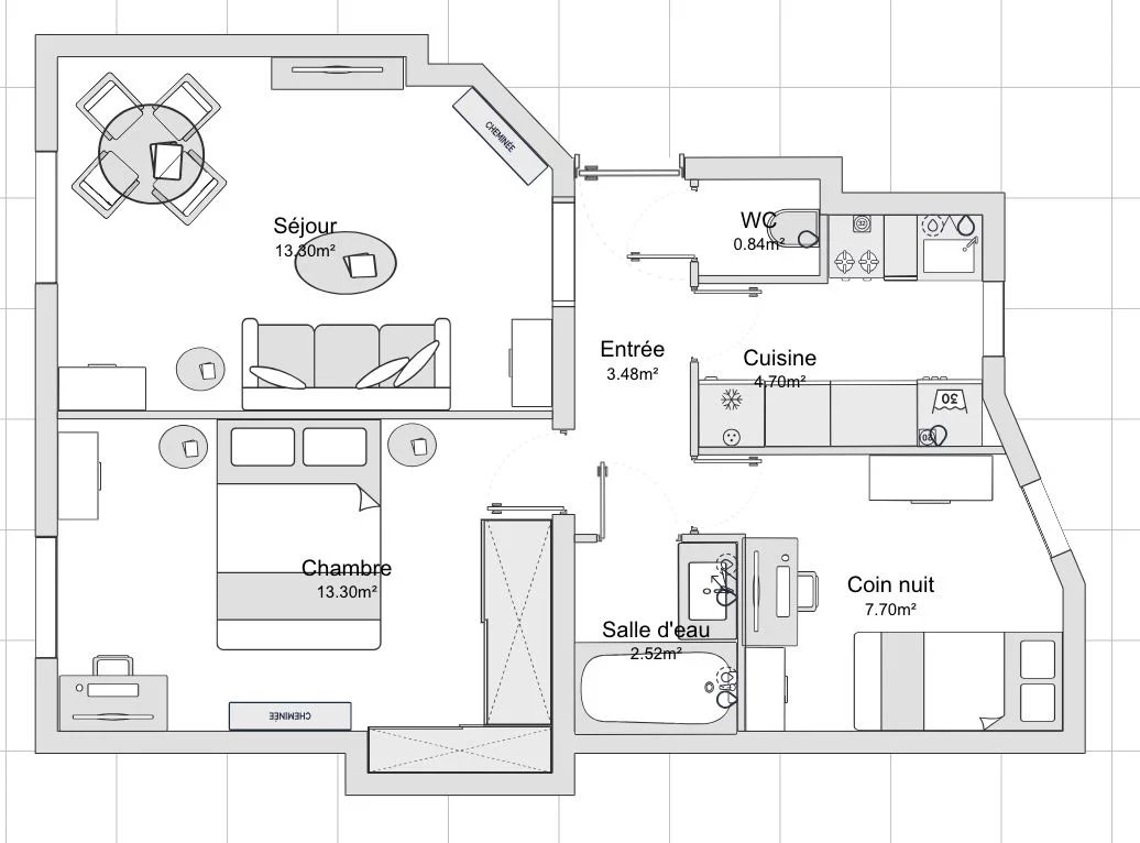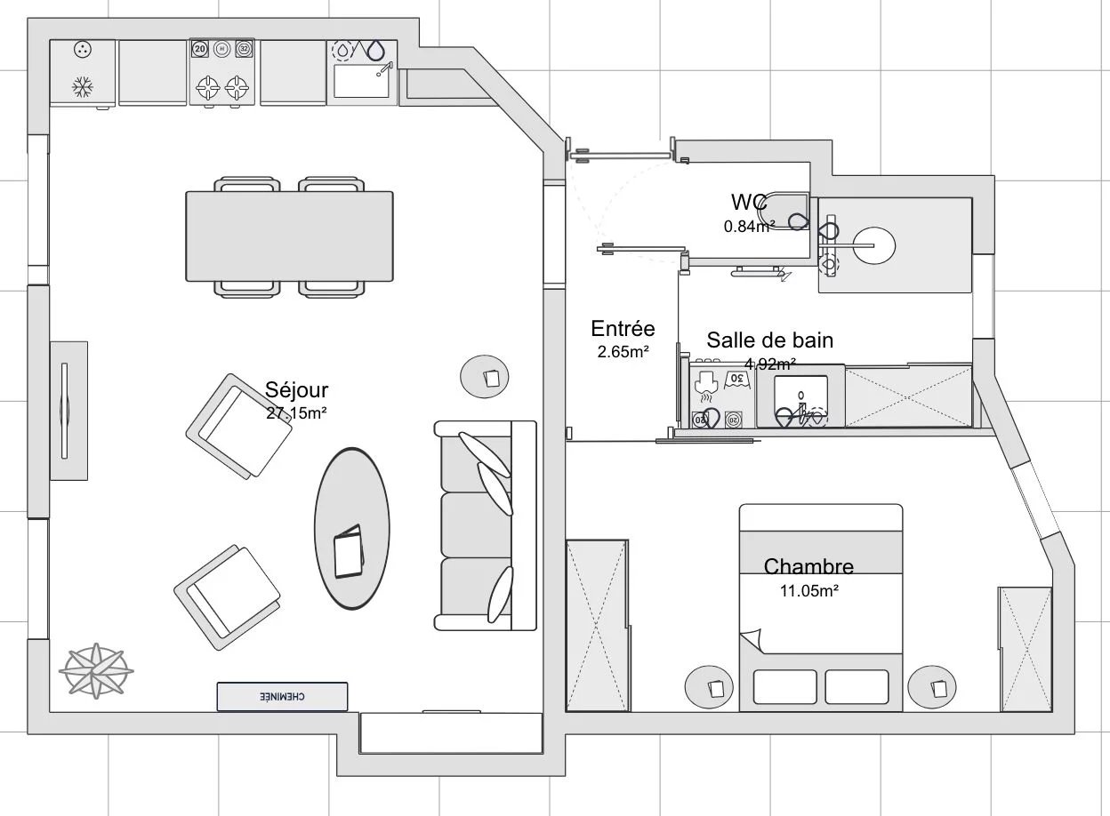L'appartement est à rénover partiellement et peut-être optimisé soit avec avec la possibilité de créer un double séjour de 27m2 en T2 soit en T2bis avec une chambre d'enfant/coin nuit d'un peu moins de 8m2.