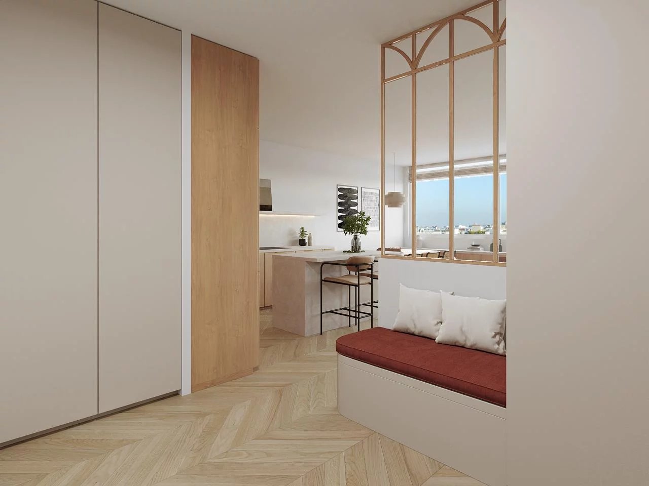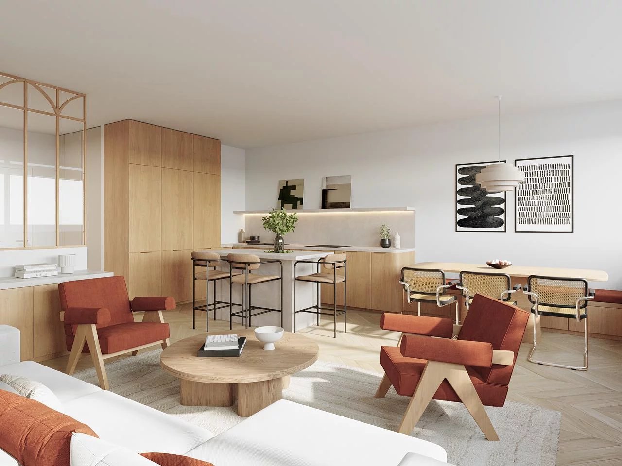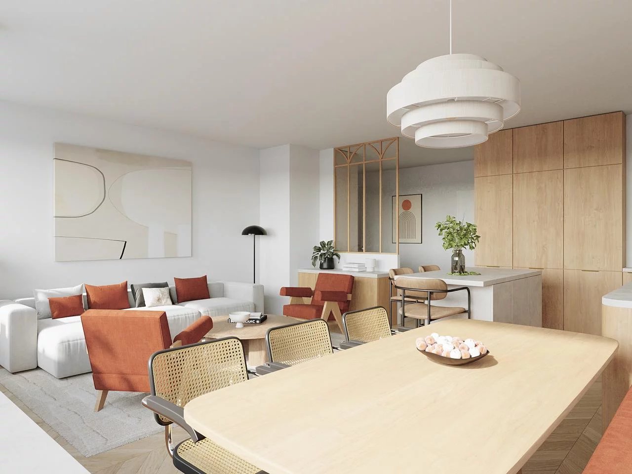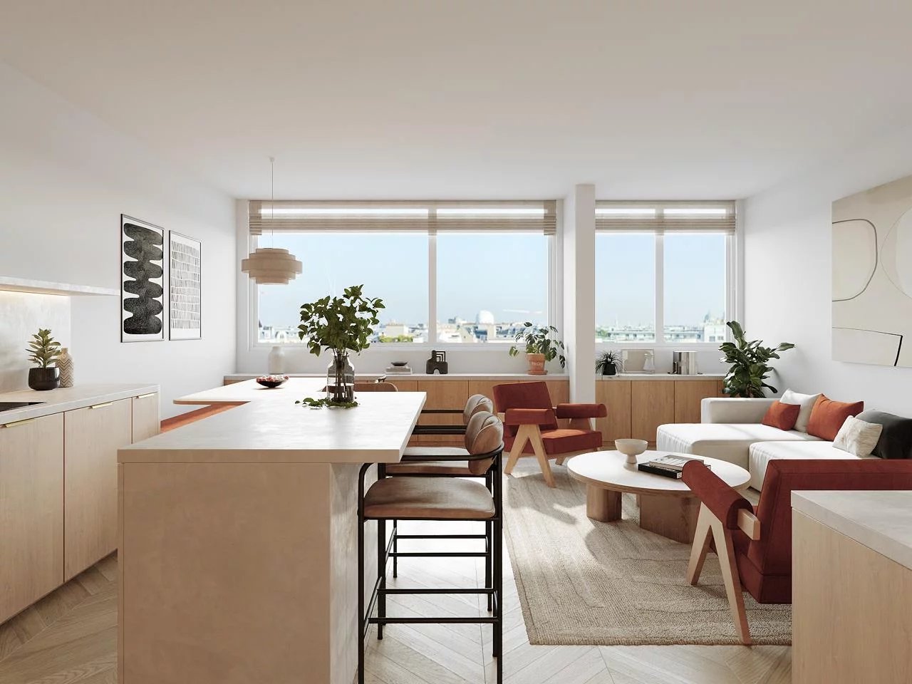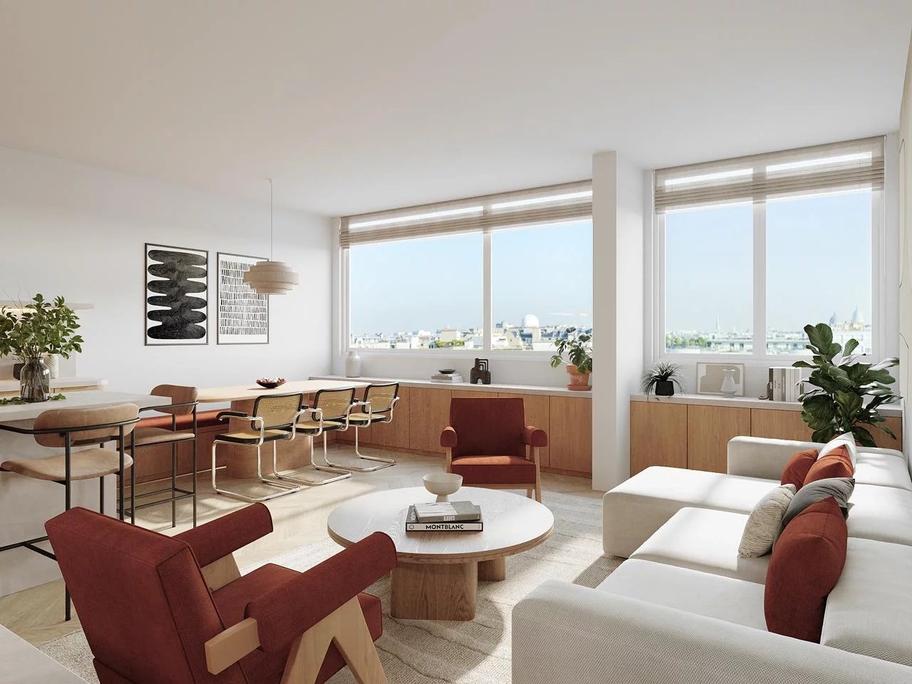 - Une grande pièce de vie de 44m2 avec cuisine ouverte ou semi-ouverte très lumineuse bénéficiant de deux baies vitrées offrant une vue à couper le souffle sur de nombreux monuments de Paris dont la Tour Eiffel.