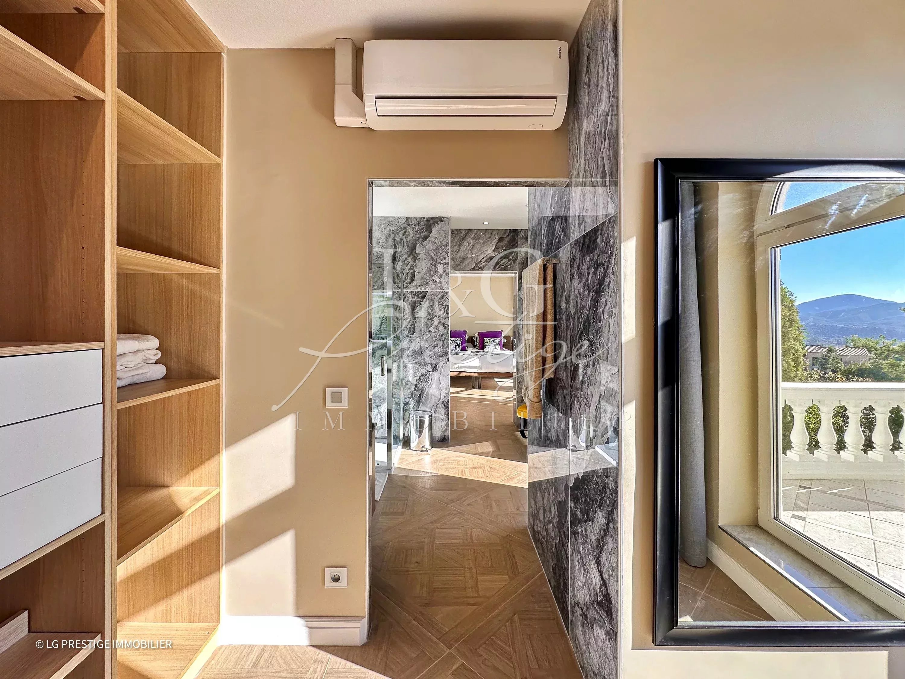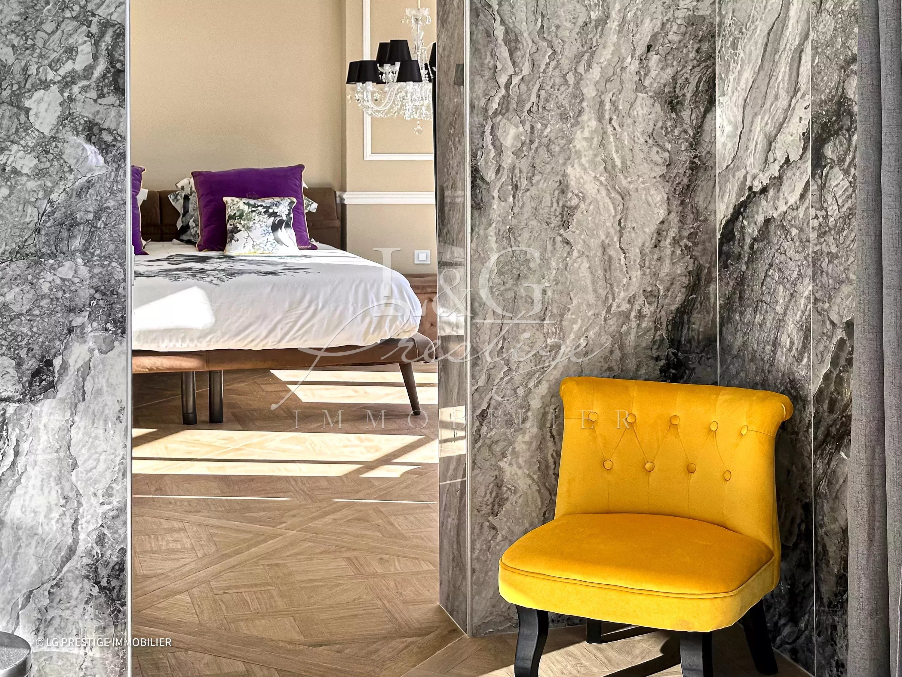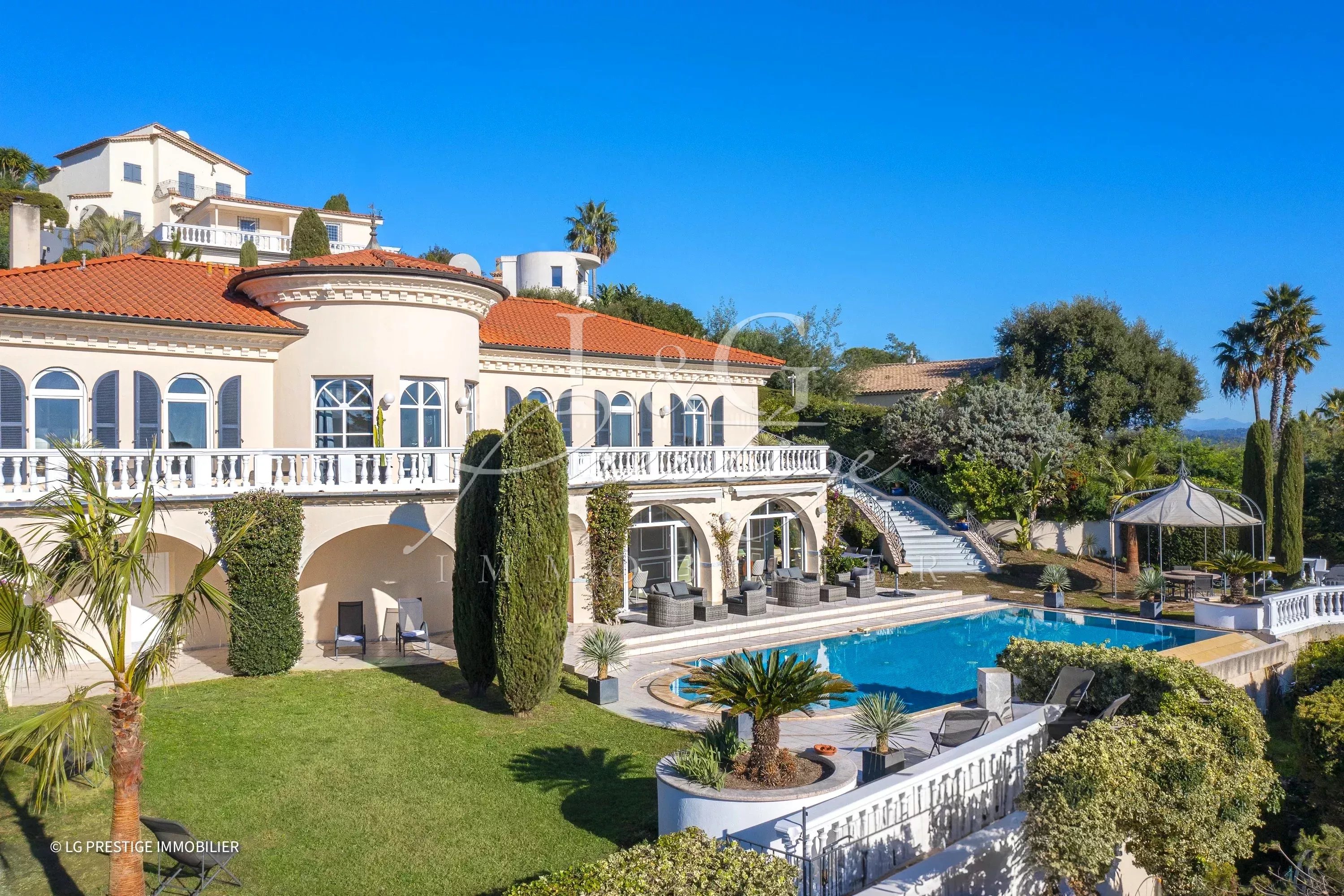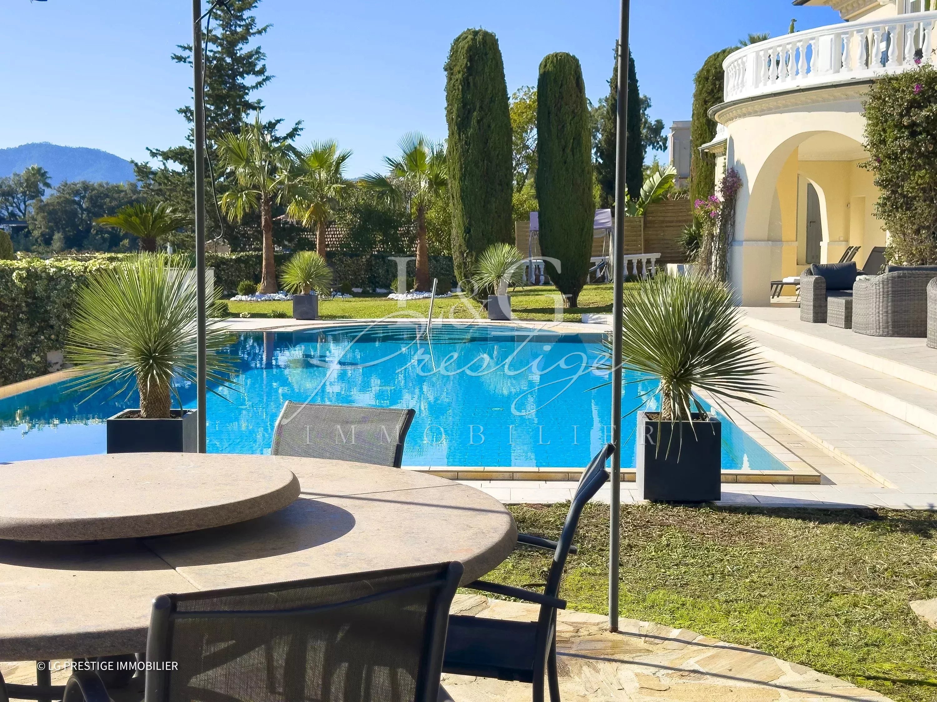 L’agence LG Prestige Immobilier de Mandelieu-La Napoule vous propose cette somptueuse villa de 250 m² aux prestations haut de gamme, nichée sur un terrain paysagé de 1 591 m². Située dans un environnement privilégié, cette propriété offre un cadre de vie unique grâce à son architecture raffinée et ses espaces baignés de lumière. Dès l’entrée, vous serez séduit par le charme et l’élégance de cette demeure qui s’organise sur plusieurs niveaux. À l’étage, la villa dispose de quatre chambres en suite, chacune équipée de sa salle de bain ou salle d’eau privative. Ces chambres lumineuses s’ouvrent sur une vaste terrasse qui révèle une très belle vue mer. Le niveau principal est conçu pour accueillir en toute convivialité. La pièce de vie, composée d’un grand séjour-salle à manger, sublimée par une cuisine ouverte moderne, et d’une arrière-cuisine. Cet espace s’étend naturellement vers l’extérieur, où une grande terrasse avec un coin barbecue, une piscine à débordement et un jardin plat offrent un cadre idyllique pour se détendre ou recevoir. La villa bénéficie également de prestations supplémentaires qui viennent parfaire son confort. Une maison de gardien indépendante de 65,78 m² garantit une autonomie parfaite pour des invités ou du personnel. Un garage double, facilement accessible. Depuis chaque pièce de la maison, vous pourrez profiter d’une vue mer panoramique exceptionnelle qui confère à cette propriété un charme inégalé. Bien que située en position dominante, la villa reste à proximité des commerces, permettant de combiner le plaisir d’un cadre intime et la facilité d’accès aux commodités. Pour plus d’informations ou pour organiser une visite, n’hésitez pas à nous contacter. Cette villa unique vous attend pour concrétiser vos rêves.