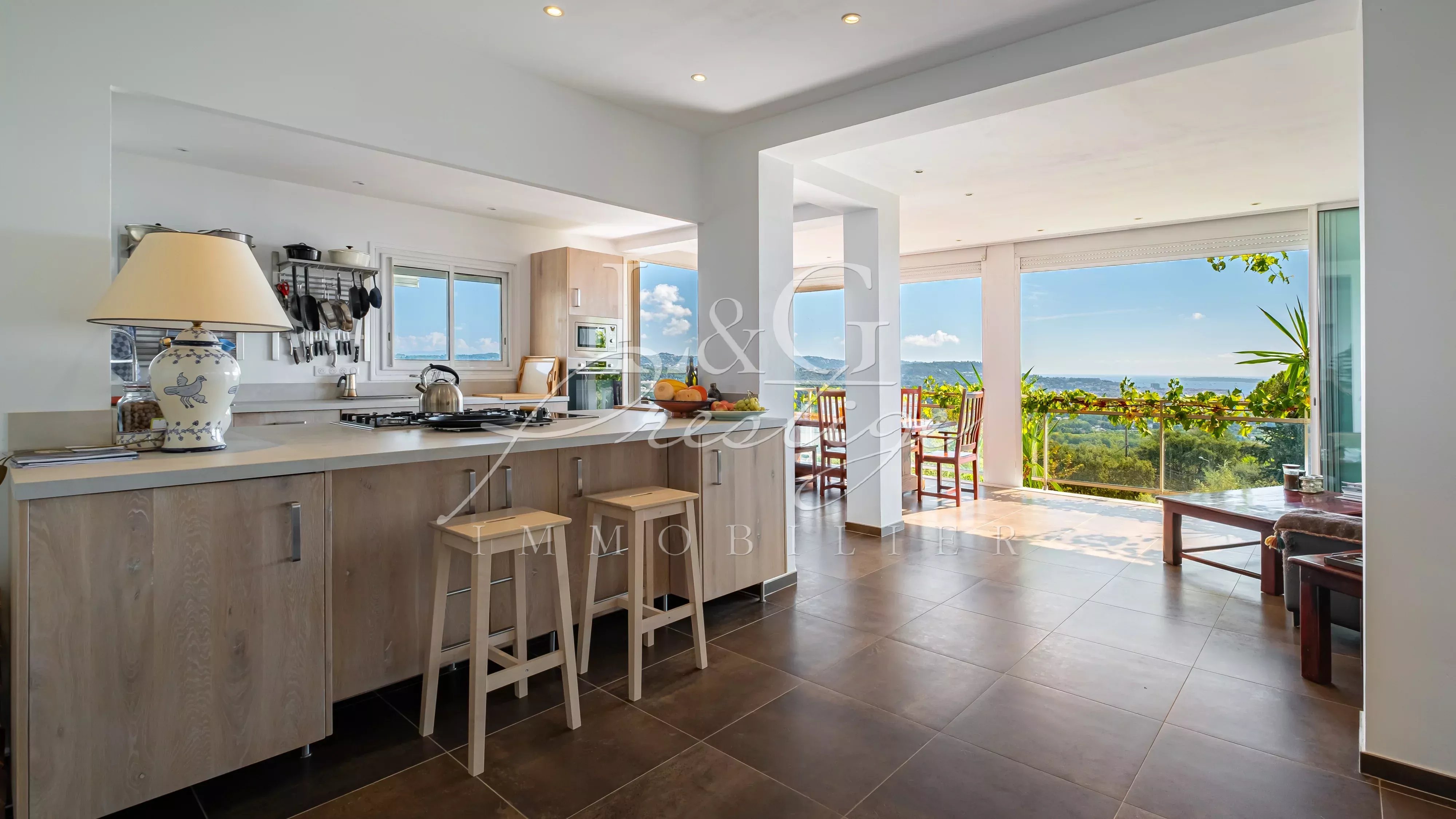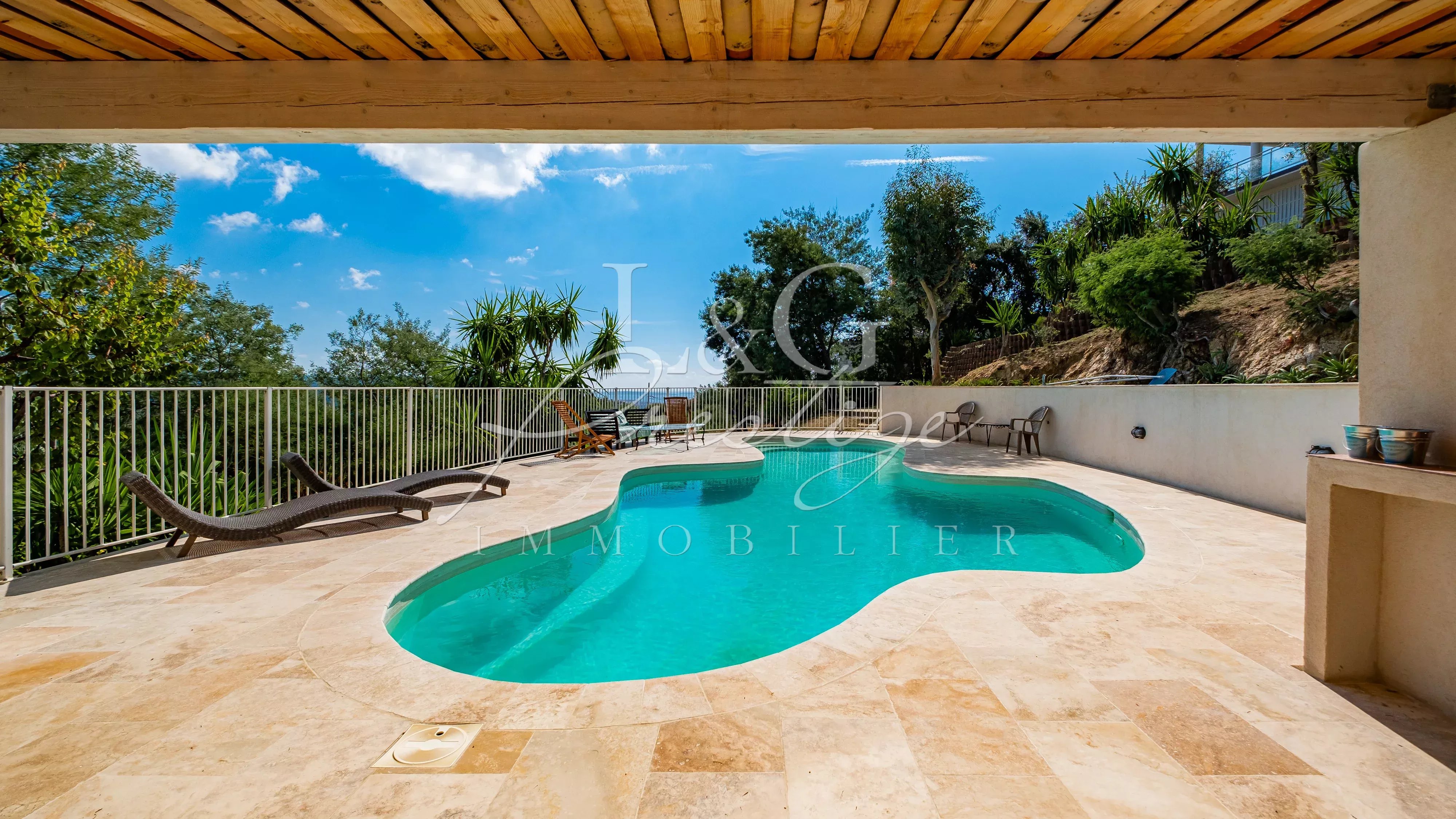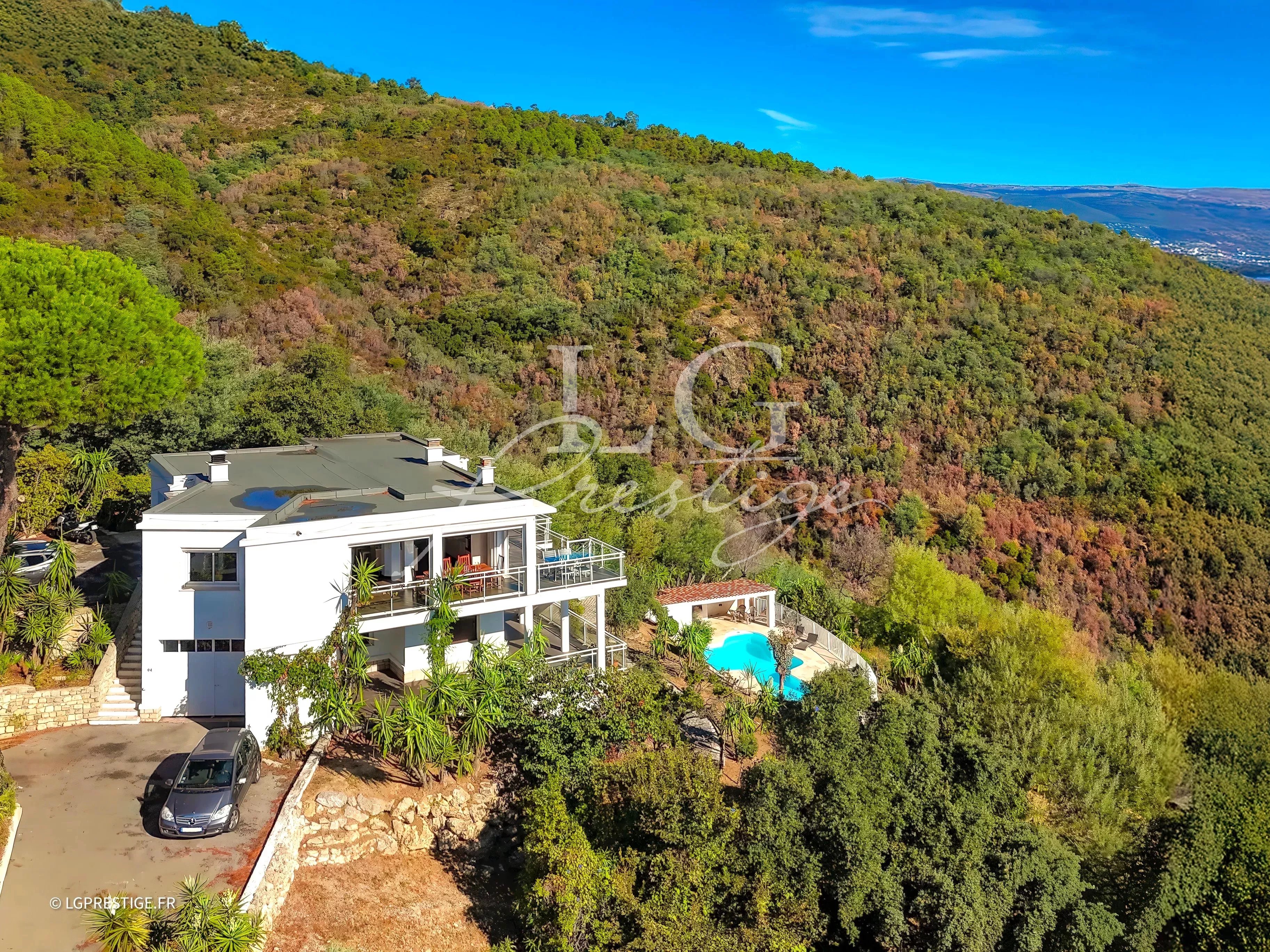 - SOUS PROMESSE DE VENTE SIGNEE - L’agence LG Prestige de Mandelieu est ravie de vous présenter à la vente cette magnifique villa contemporaine, idéalement située en position dominante, offrant une vue panoramique imprenable sur le massif de l’Esterel jusqu’à la mer. Édifiée sur deux niveaux, la propriété propose au rez-de-chaussée un vaste espace avec fenêtres, pouvant accueillir jusqu’à six véhicules ou être aménagé en appartement selon vos besoins et projets. À l’étage, vous découvrirez une superbe pièce de vie baignée de lumière avec cuisine ouverte entièrement équipée, trois chambres, deux salles de bains, des toilettes indépendantes, ainsi que de vastes terrasses permettant de profiter pleinement du cadre environnant. Le terrain paysager, soigneusement entretenu, comprend un charmant potager et une splendide piscine accompagnée de sa cuisine d’été. Des possibilités d’agrandissement et de construction supplémentaire viennent parfaire les nombreux atouts de ce bien d’exception.