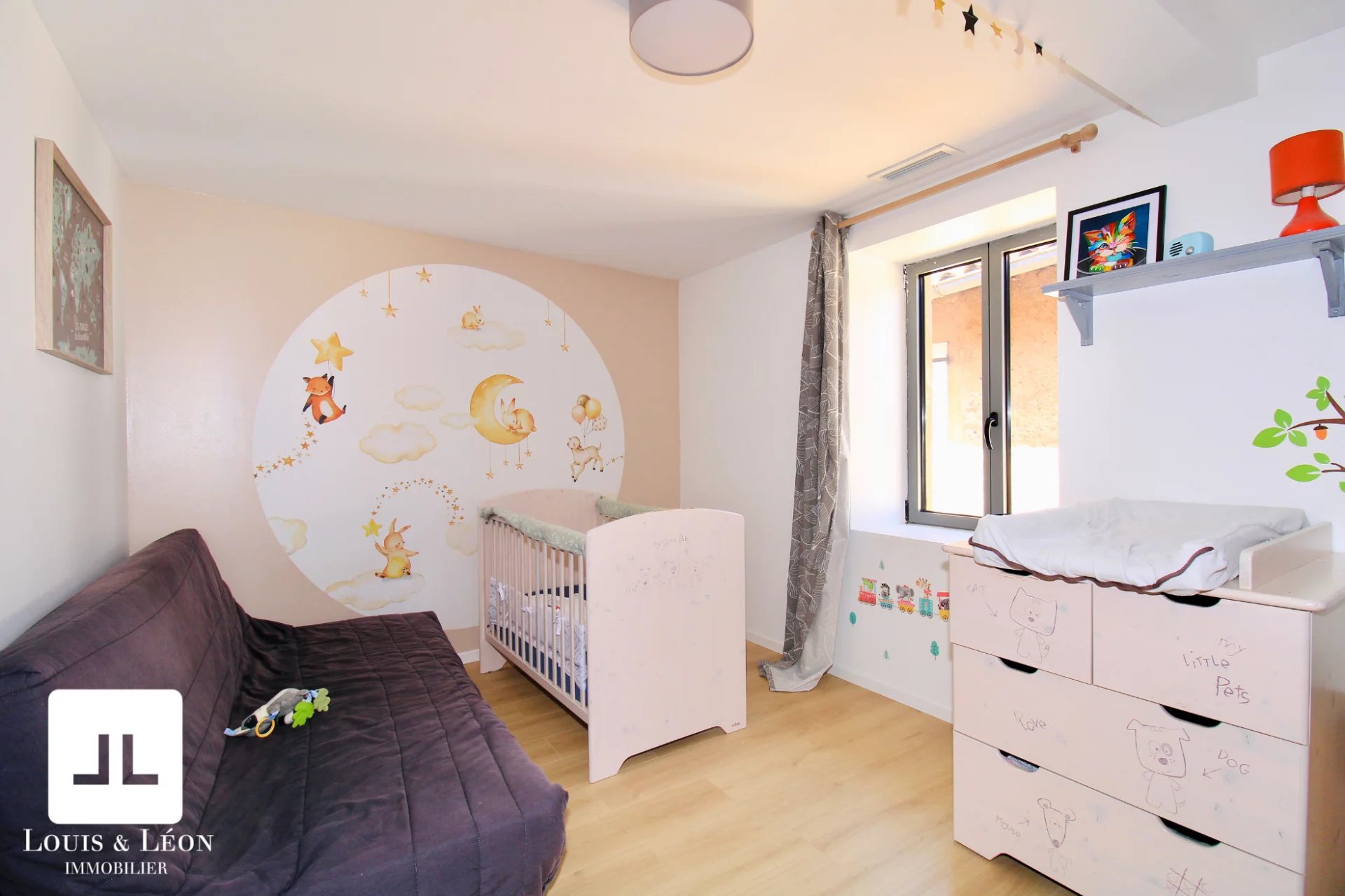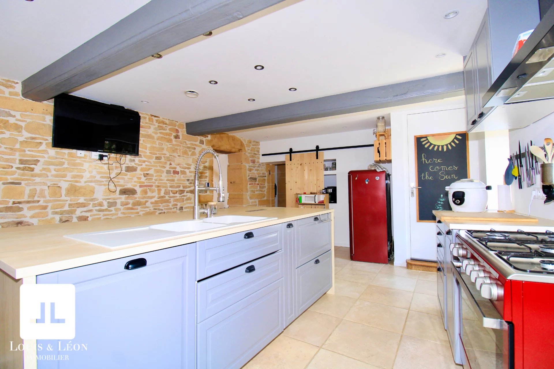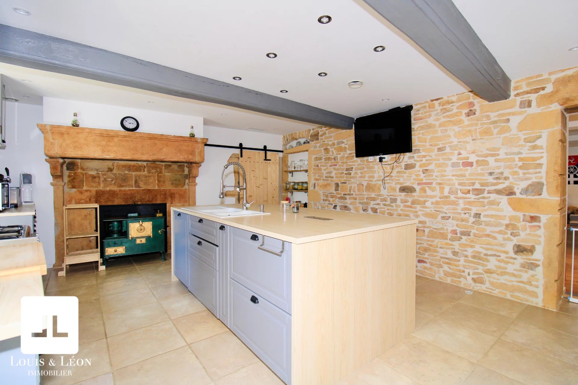 Louis & Léon Immobilier vous propose en exclusivité à Frontenas cette charmante maison de village en pierres de 155m2 entièrement rénovée en 2020, avec cour et jardin. Vous serez séduits par les volumes de cette rénovation mêlant confort de la modernité et cachet de l’ancien, son DPE en B, ainsi que par sa belle luminosité (exposition ouest / sud-est). Son DPE en B est également un très bel atout! L'entrée dessert un grand bureau et vous permet d’accéder à la cuisine de 26m2 communiquant avec une buanderie et donnant sur le séjour / salle à manger de 40m2 avec poêle à bois. Une première salle de bain avec toilettes est accessible par ce dernier. L’espace nuit propose deux chambres de plus de 11m2 (dont une avec dressing) communiquant avec une salle d’eau. Vous y trouverez également une troisième chambre de plus de 21m2 laissant la possibilité de création d’une suite parentale, ainsi que des toilettes séparées. La maison est entièrement équipée d’une CLIMATISATION REVERSIBLE GAINABLE. Côté extérieur, vous découvrirez une jolie cour ainsi qu’un jardin privatif face à la maison. Un grenier, 3 caves et un atelier complètent les prestations de ce bien idéal pour une mise au vert dans un environnement calme et proche des commodités. Informations techniques : Mode de chauffage : Climatisation réversible / Poêle à bois Fenêtres en aluminium oscillo-battantes Fibre optique : Oui Prix de vente : 379 000euros FAI Surface : 155 m2 DPE : B/A Pour toute demande d’informations complémentaires, contactez Elodie LEFEVRE – Agent Commercial immatriculé au RSAC de Villefranche - Tarare sous le numéro 789 141 025