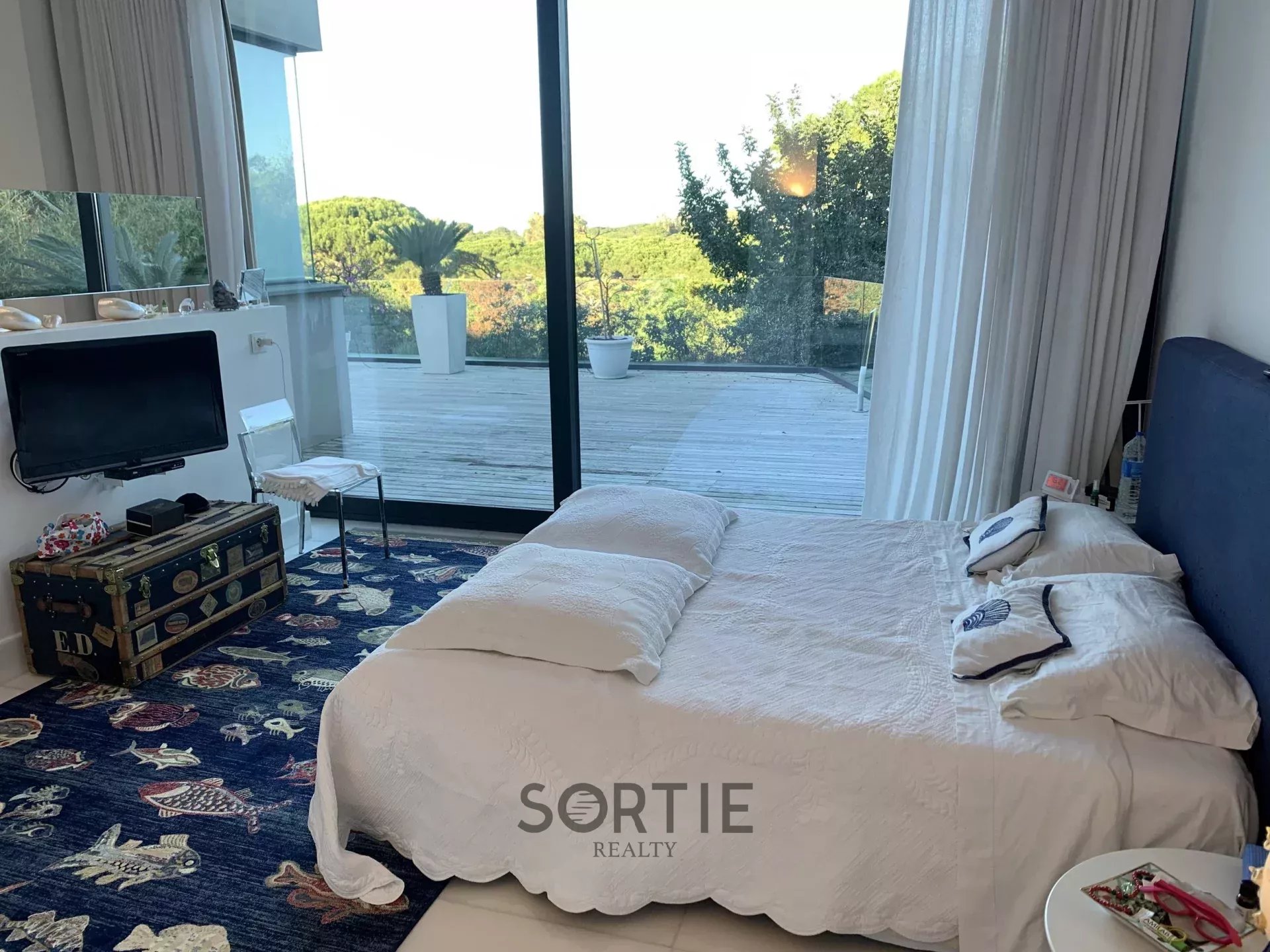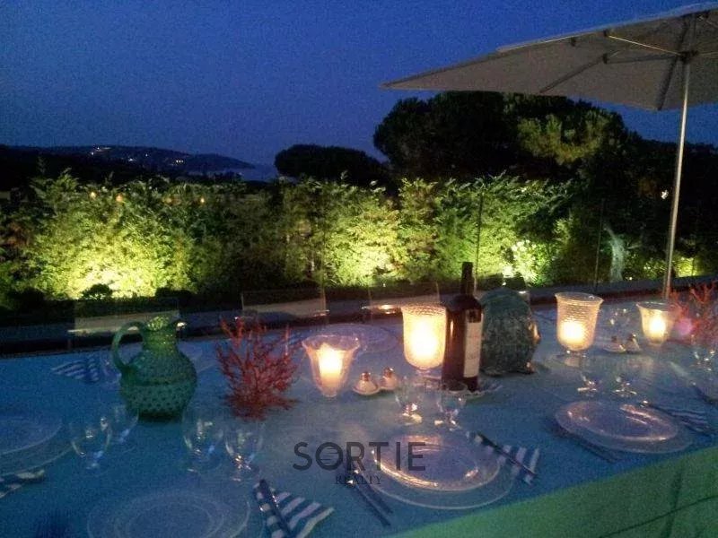 Cette villa moderne fait partie de mes préférées pour plusieurs raisons. Elle est située à proximité de la plage de Pampelonne, à quelques pas du Club 55 et des magnifiques clubs de plage de la Route de l’Epi. Son atout majeur est un mur vitré de 15 mètres dans le salon, qui semble flotter et descend jusqu’au niveau inférieur. Cela crée un espace de vie ouvert sur une grande terrasse en bois avec une vue imprenable sur la mer. C’est pour cette raison que je l’ai appelée Villa Bond. Vous comprenez ? La terrasse est l’endroit idéal pour profiter des couchers de soleil, d’un dîner en plein air ou d’un apéritif à la française. La villa se divise sur deux niveaux. Au niveau principal, vous trouverez l’entrée, la salle à manger, le salon, la cuisine, ainsi qu’une toilette invités. La chambre principale dispose d’un dressing et d’une salle de bains. Il y a aussi deux chambres doubles avec chacune sa propre salle de bains et terrasse. En plus, une chambre séparée avec salle de bains et dressing bénéficie d’un accès privé. Au niveau inférieur, un grand studio comprend une cuisine, un salon, une chambre et une salle de bains, ainsi qu’une buanderie. Ce niveau dispose également de deux chambres de service avec leurs propres salles de bains. Un hammam avec douche et espace dressing est également à votre disposition. L'accès au garage couvert se fait directement depuis ce niveau. Pour résumer les principales caractéristiques de cette propriété : Cinq chambres doubles, chacune avec sa salle de bains privative. Deux chambres de service avec salles de bains. Un mur vitré de 15 mètres qui s'étend jusqu’au niveau inférieur, agrandissant l’espace de vie et offrant une vue spectaculaire sur la mer, idéale pour apprécier les couchers de soleil. La villa peut accueillir confortablement jusqu’à 12 personnes. Parmi les autres équipements, on trouve un portail électrique, wifi, télévision satellite, système de divertissement, alarme, un terrain entièrement clos, un parking pour 4 à 5 voitures, un domaine privé avec gardien, et les animaux sont acceptés.