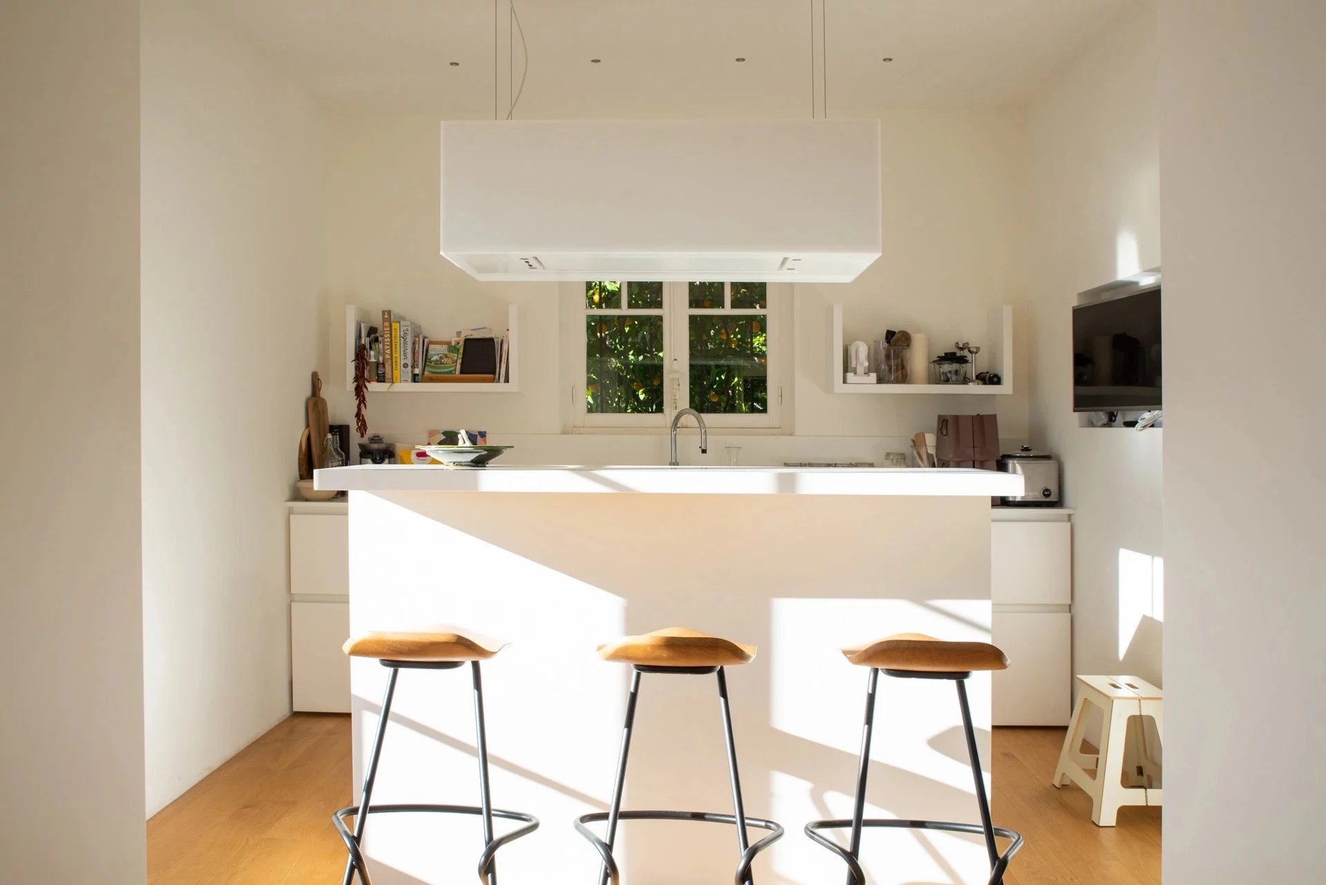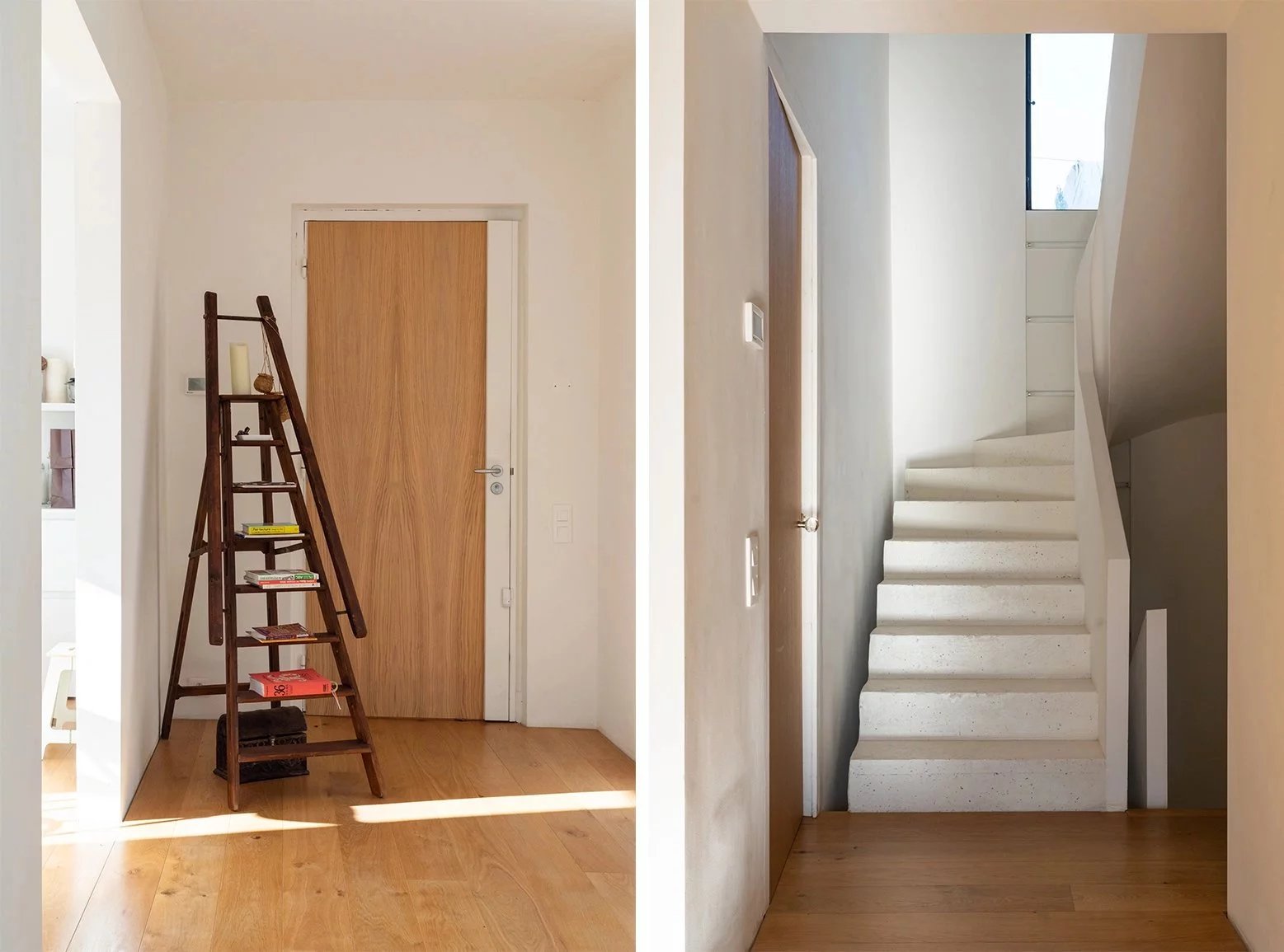 Un escalier très graphique, comme en suspension, mène au premier étage vers les espaces nuit de la maison. Un couloir dessert trois chambres en suite, avec dressings et salle d'eau, un petit bureau s’ouvrant sur une terrasse, idéale pour profiter de la vue sur les remparts.