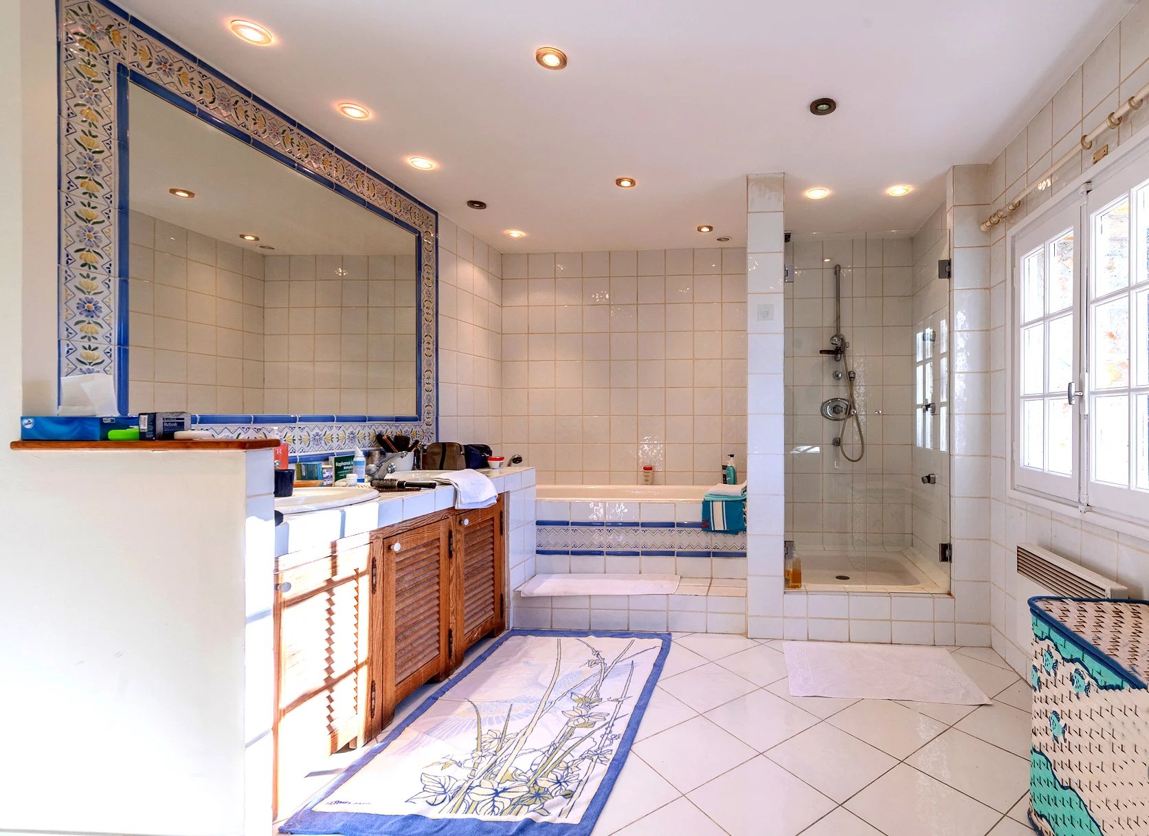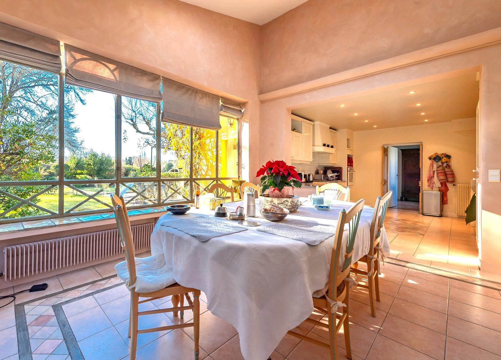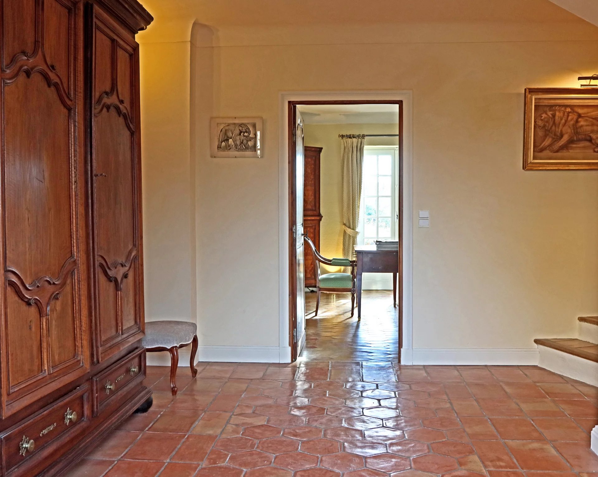 La bâtisse principale, d'une superficie de 250 m², se compose d'un hall d'entrée, d'un vaste salon agrémenté d'une cheminée et s'ouvrant sur un jardin avec bassin le tout orienté au SUD, d'une salle à manger conviviale, d'un bureau fonctionnel, ainsi que d'une cuisine avec son office.