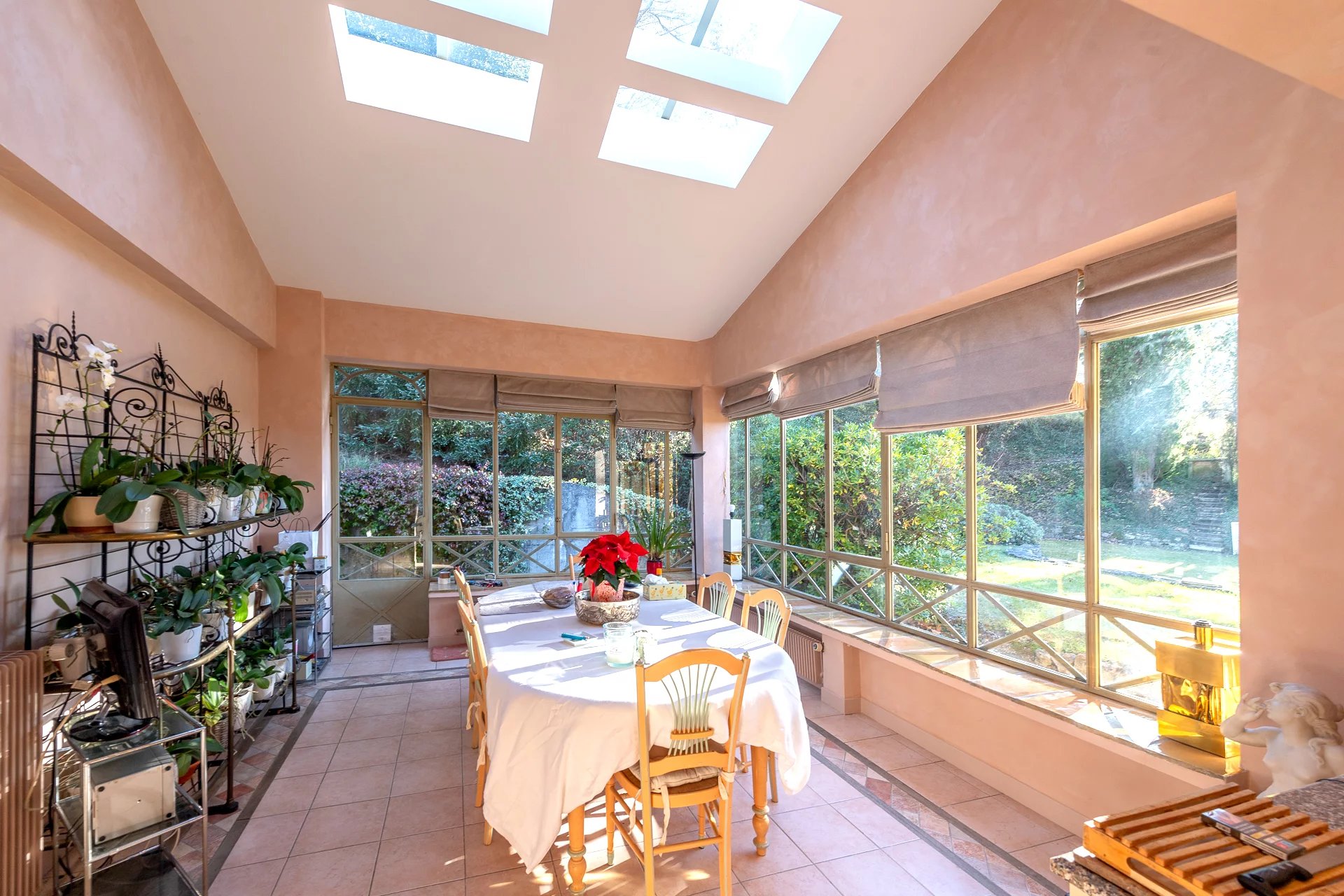 L'accès se fait par une cuisine aménagée sous la verrière d'un jardin d'hiver, parfait pour profiter du jardin tout au long de l'année.