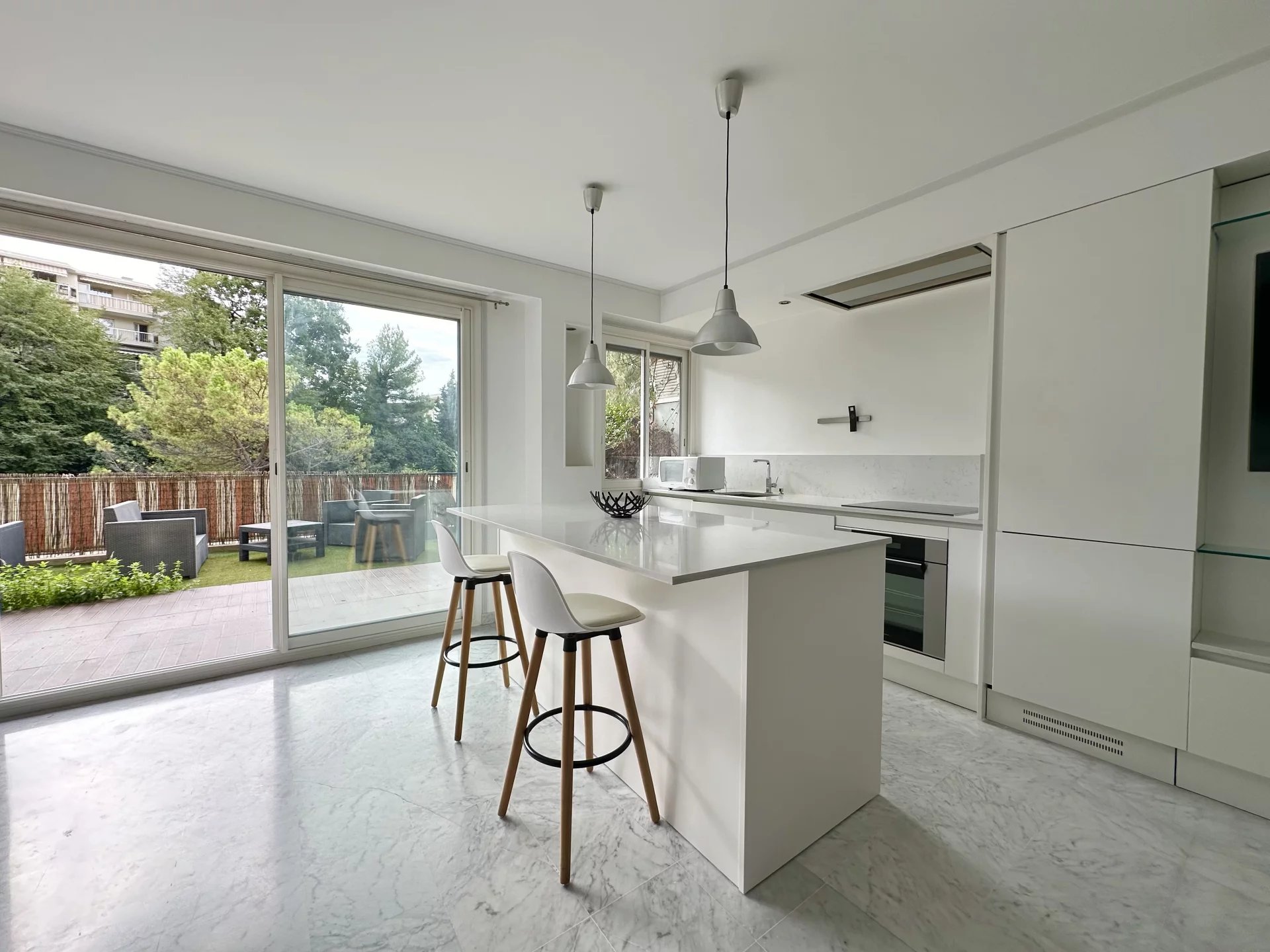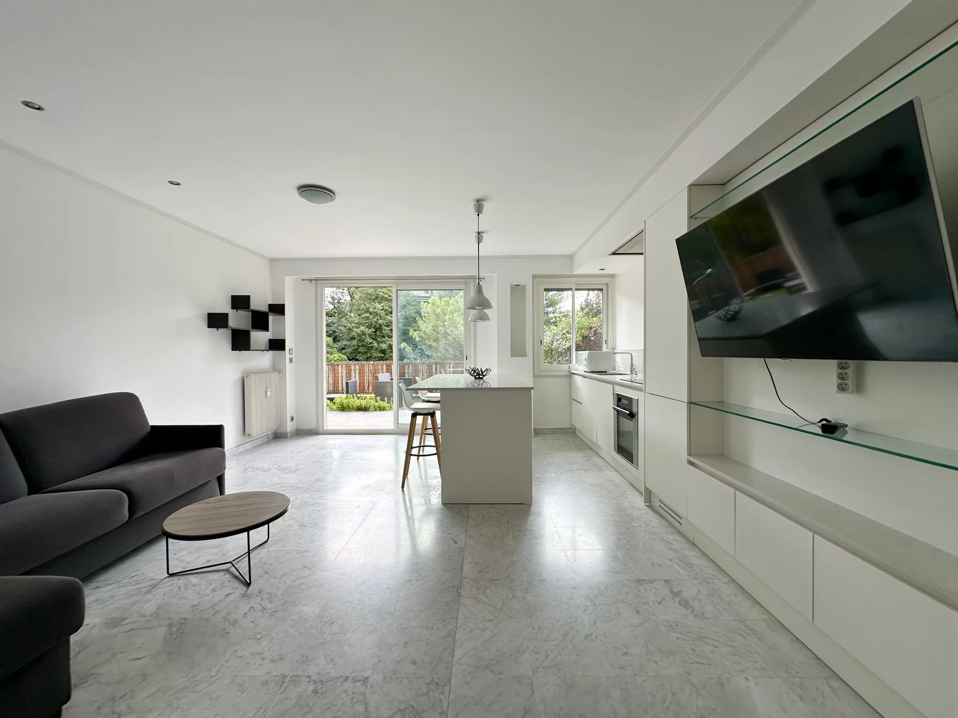 Les agences CIMIEZ RESIDENCES vous proposent la location d'un deux pièces en parfait état, situé dans une copropriété avec parc et gardiens. Cet appartement meublé comprend une entrée, un séjour avec cuisine américaine, un wc indépendant, une grande chambre en suite avec salle de douche et dressing. Les très belles prestations (double vitrage, matériaux...) de ce bien en font un produit rare sur le marché Une grande terrasse, accessible depuis la chambre et le séjour, offre une belle vue dégagée sur le parc, sans vis à vis. Les futurs locataires pourront stationner un véhicule dans un garage fermé en sous-sol.