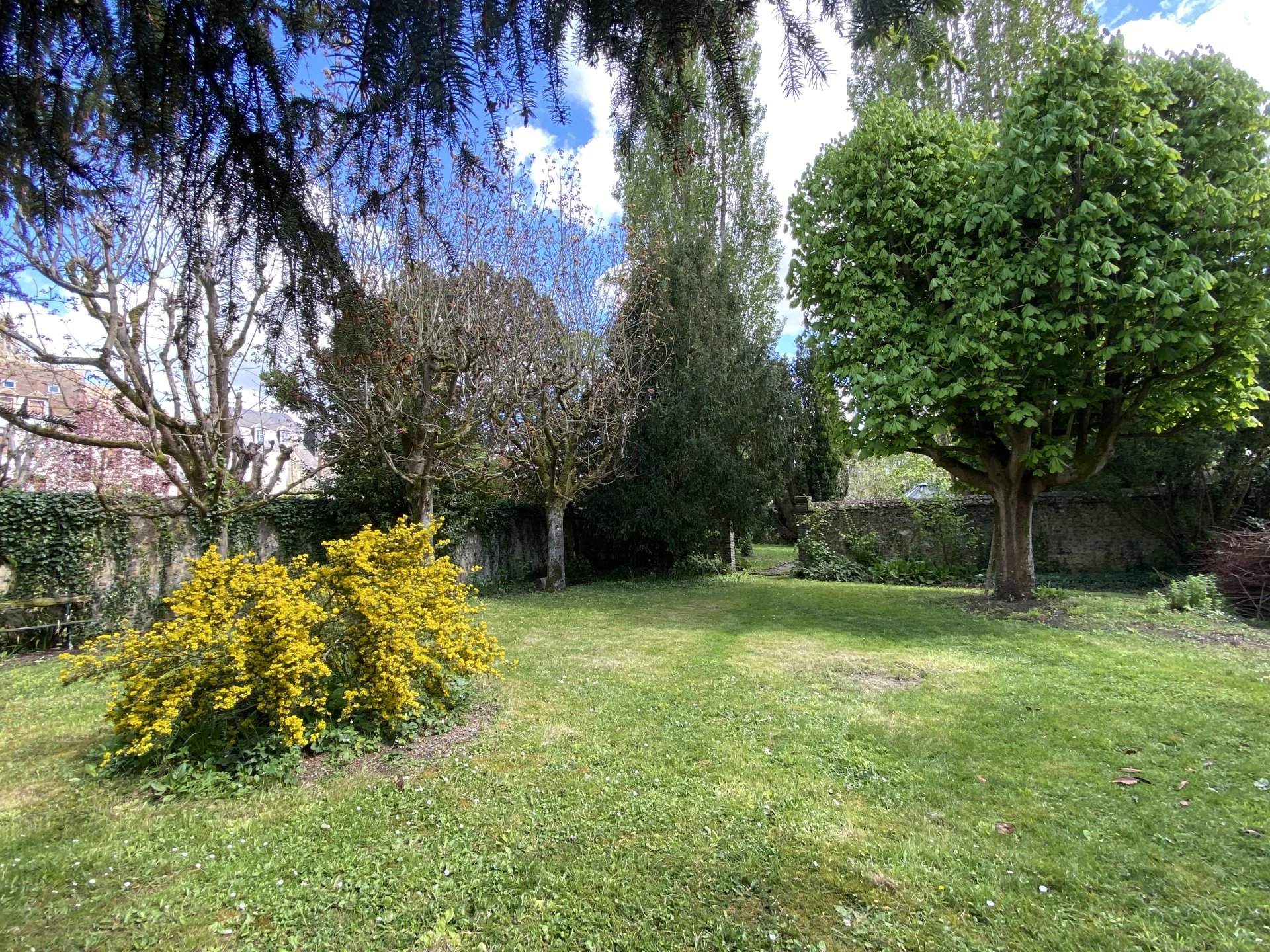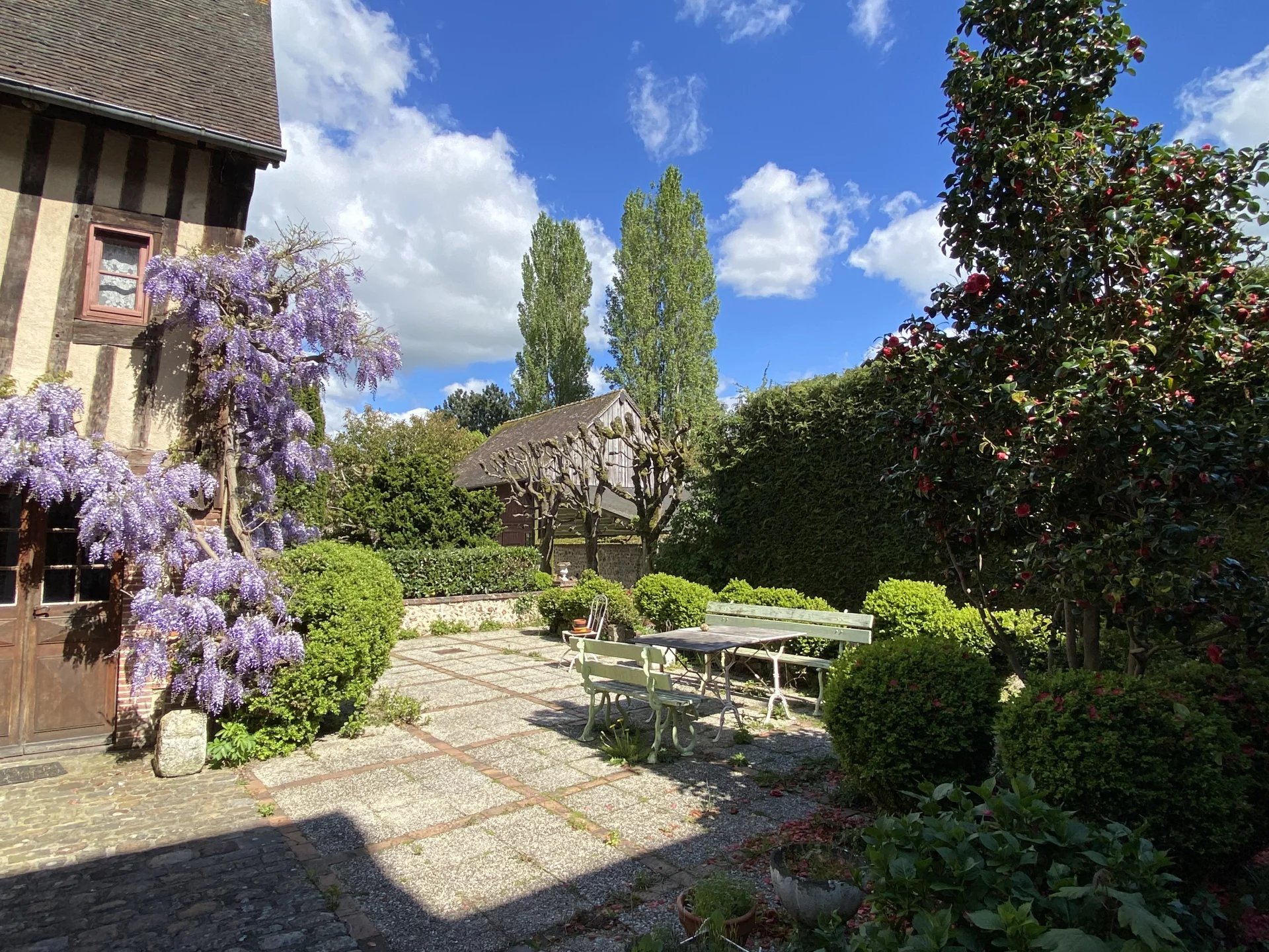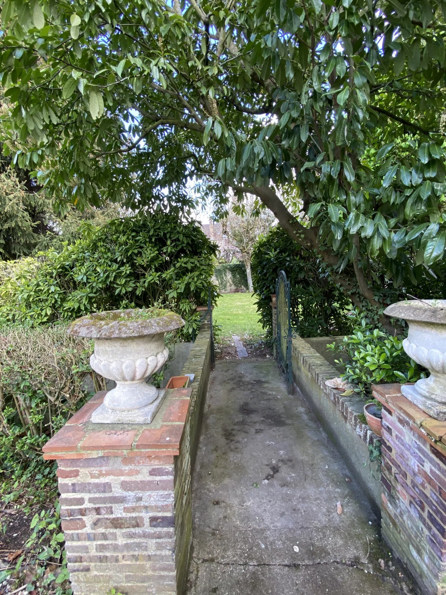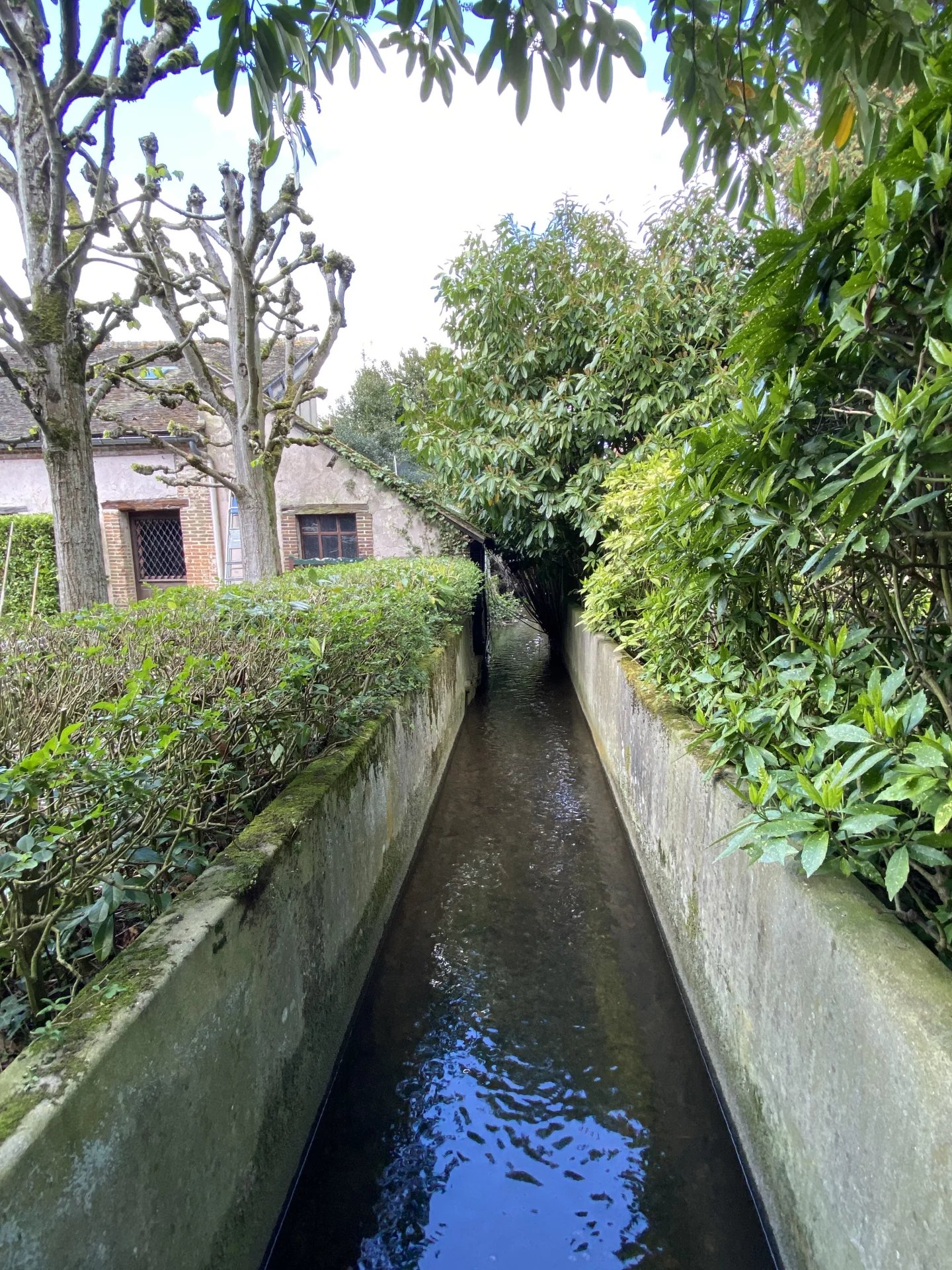 Jardin clos de 1560 m² traversé par un bras de l'Iton et plusieurs dépendances comprenant un grand garage, une salle de jeux, un lavoir, un atelier.