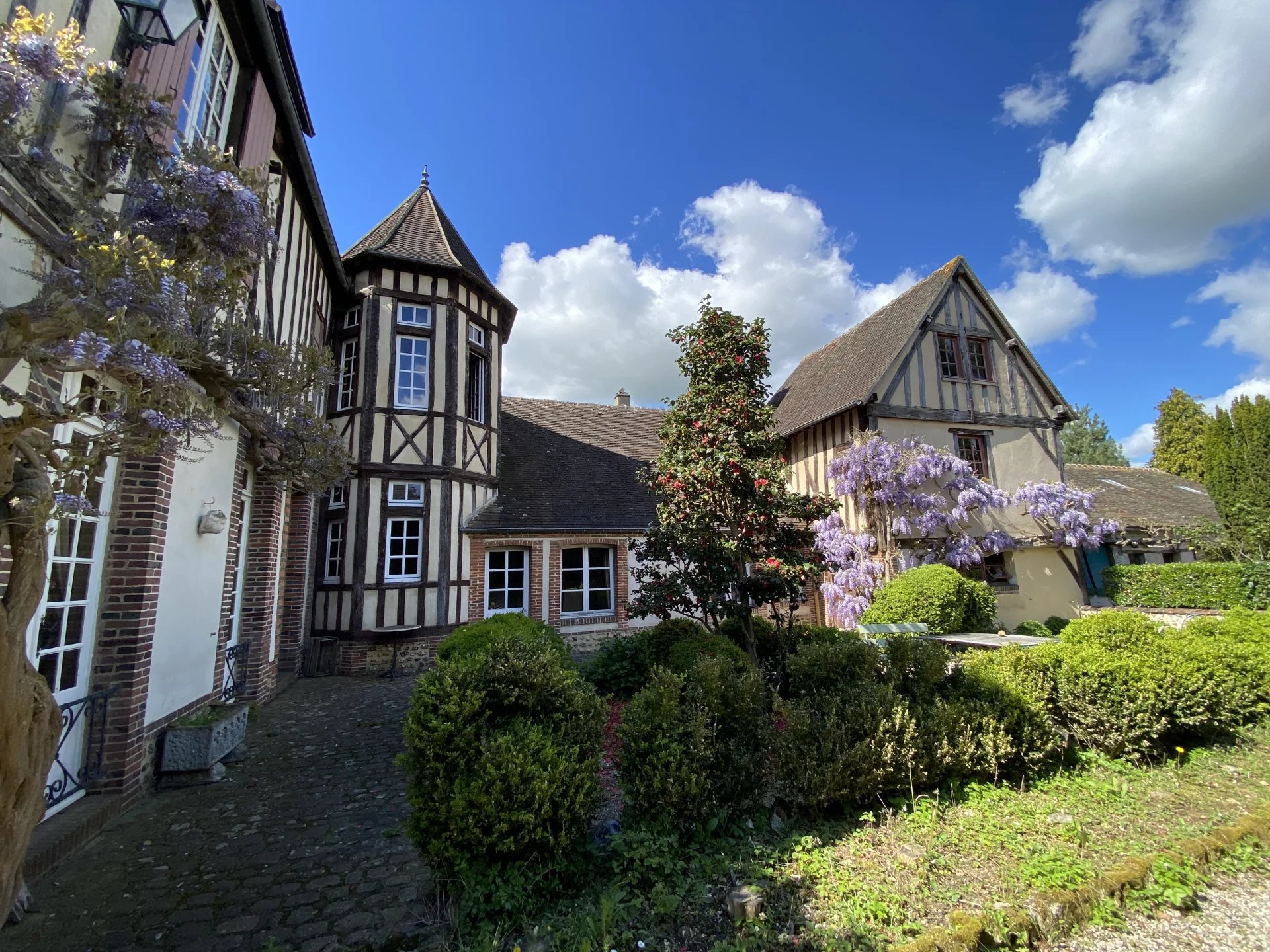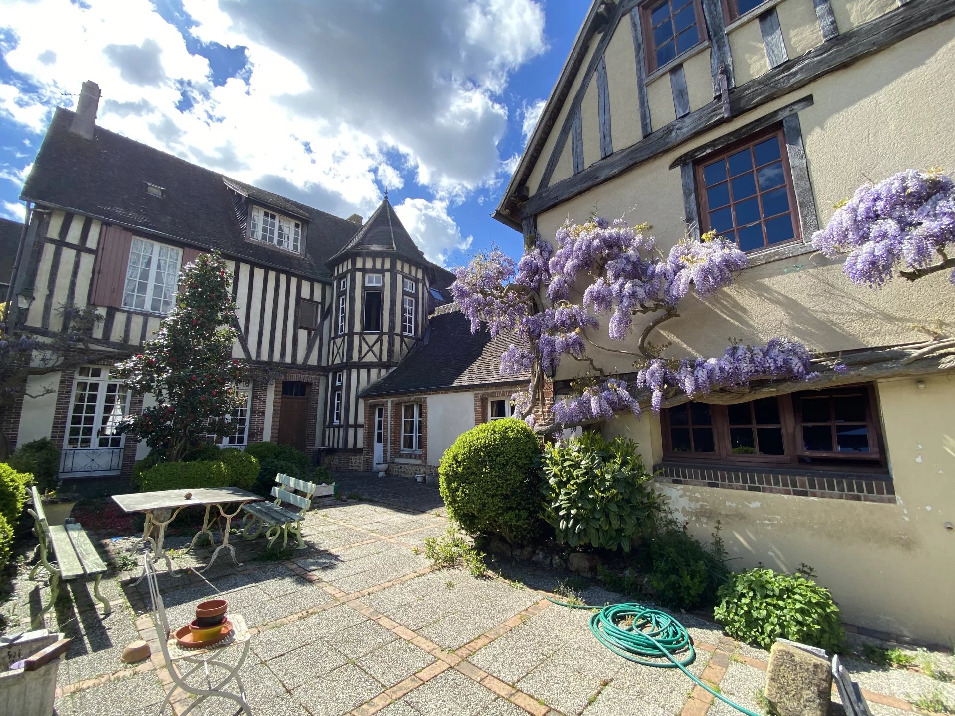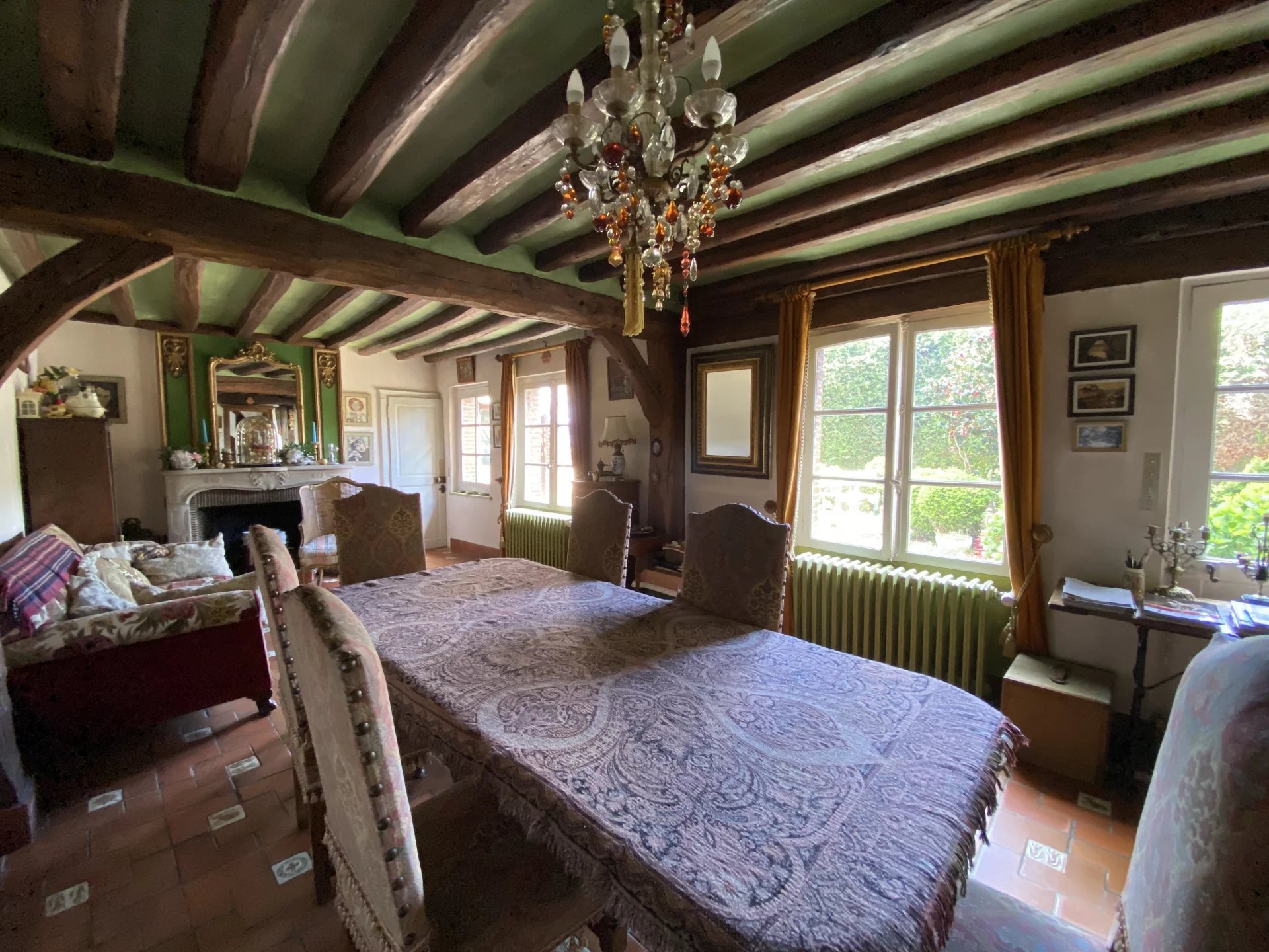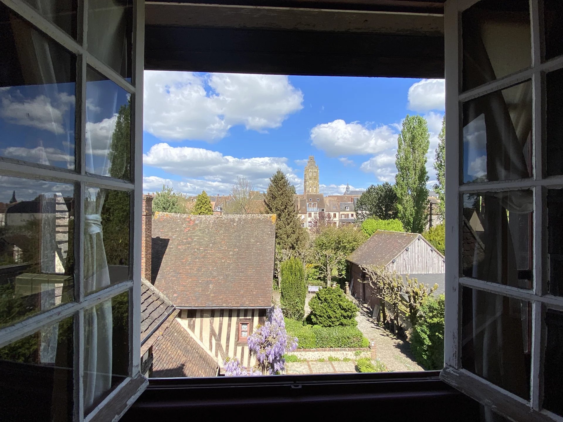 Eure. Maison de ville construite deuxième moitié du XVIII ème pour un bâtiment et première moitié du XIX ème pour une seconde partie offrant sur 264.80 m² et trois niveaux : au rez-de-chaussée, une entrée, un grand salon avec une cheminée, un couloir, un bureau bibliothèque avec cheminée, la tourelle menant à la salle à manger, la cuisine avec arrière-cuisine, chaufferie, wc, lingerie et accès au jardin ; à l'étage, une pièce (chambre-bureau) et un grenier ; au premier étage depuis la tourelle (de 1973), un couloir desservant trois chambres dont une avec point d'eau, une salle de bains, un wc; au deuxième étage, un couloir desservant une salle de bains et trois chambres; un grenier; une cave.