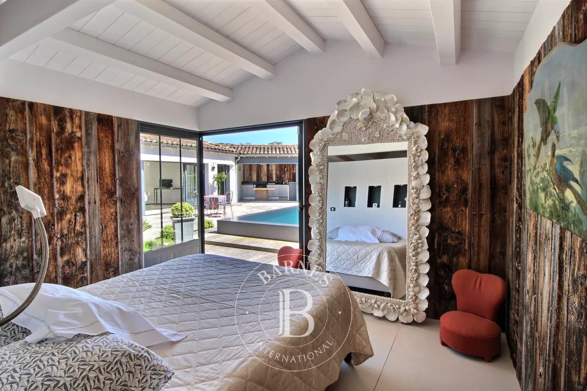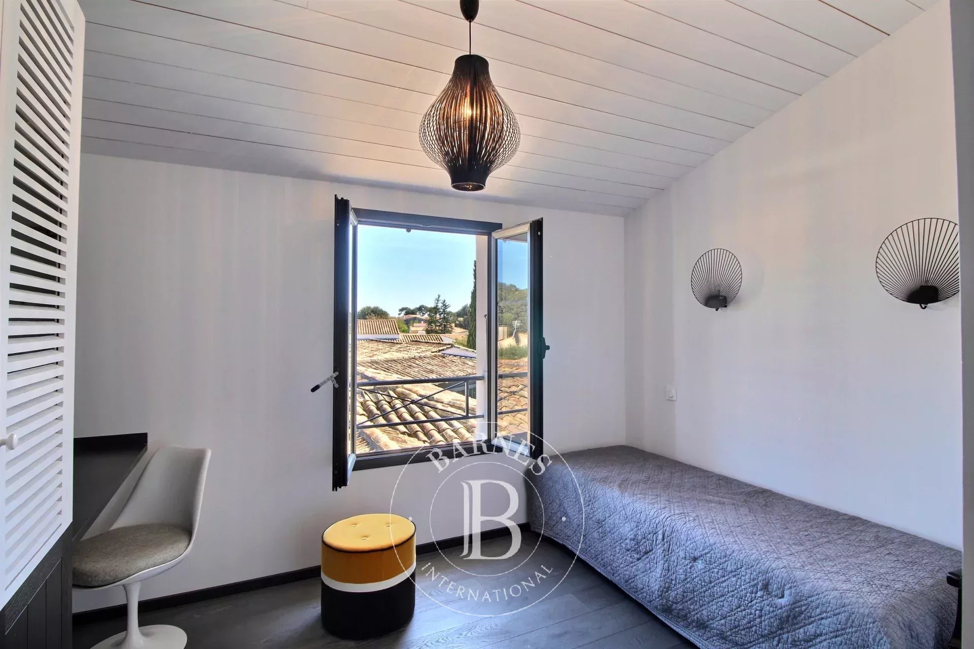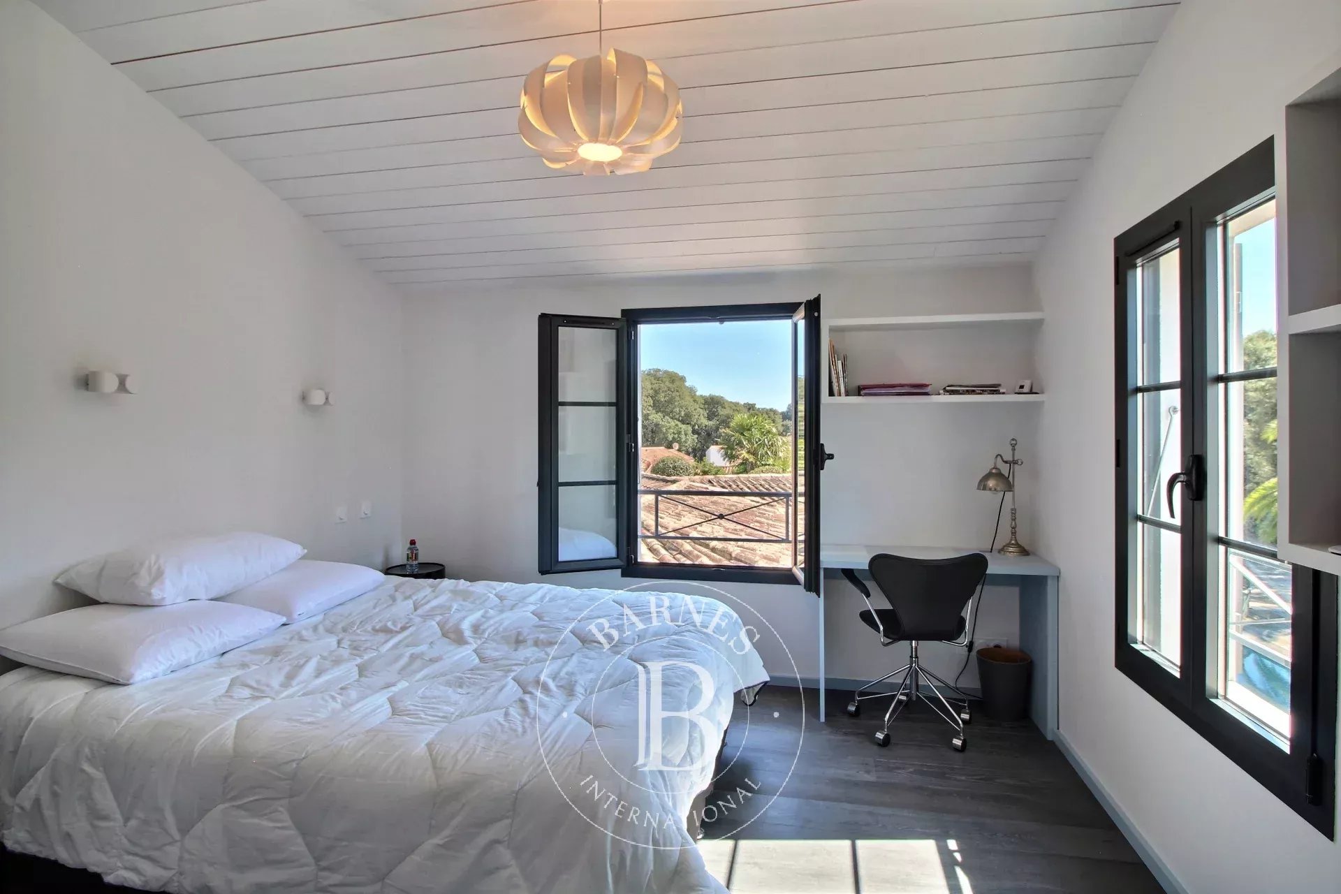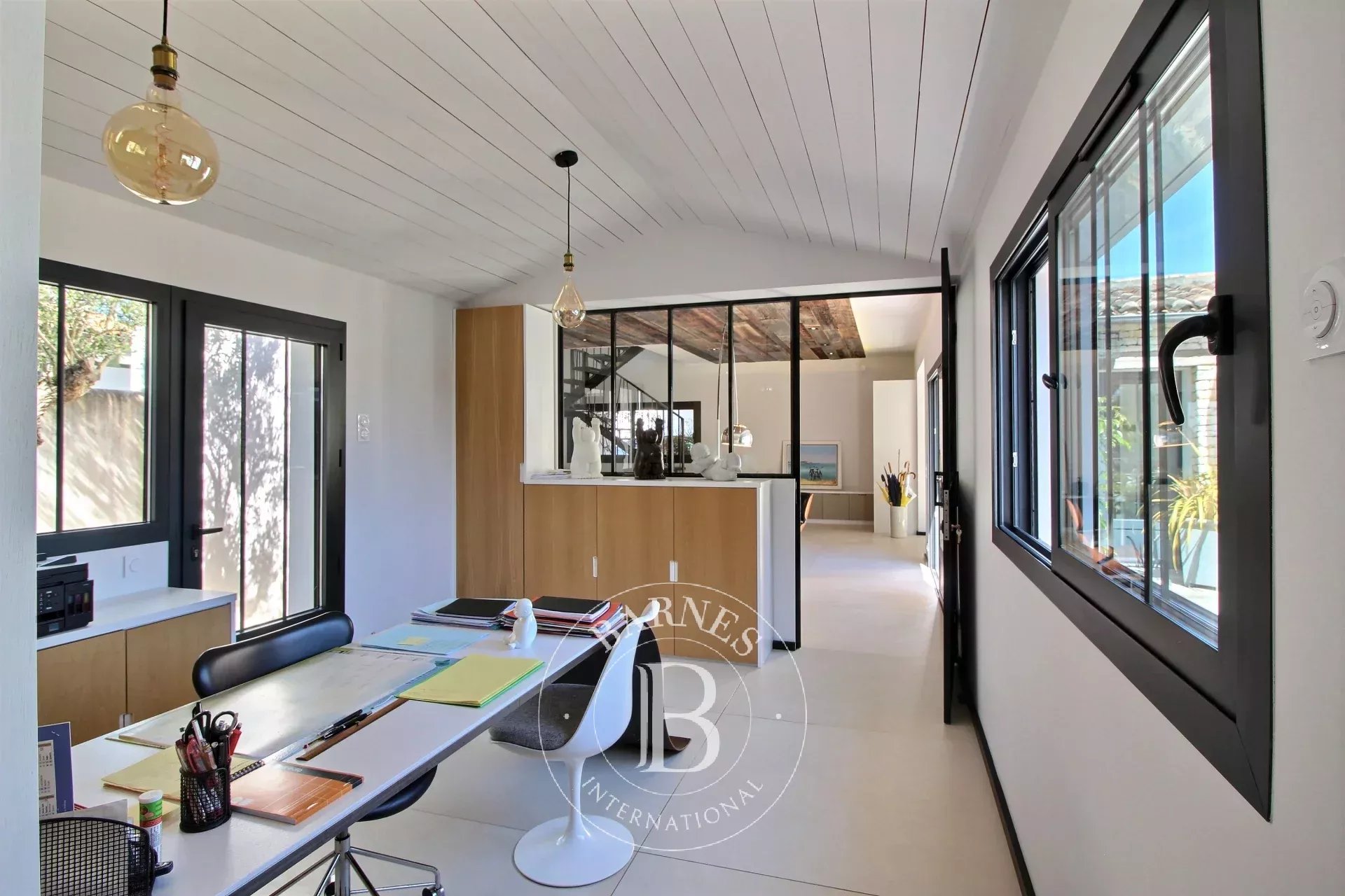 SOUS OFFRE D'ACHAT Parfaitement située entre commerces et pinède, maison d'environ 285 m2 habitables offrant une entrée, un double séjour lumineux avec une grande cuisine ouverte aménagée et équipée. Une buanderie, un bureau, une suite parentale avec salle d'eau et dressing ouvert sur la piscine et un patio. Une deuxième chambre avec sa salle d'eau. À l'étage, 2 autres chambres avec une salle d'eau et dressing. En annexe, une maison d'amis composée d'un salon avec une cuisine ouverte aménagée et équipée, une 5ème chambre et une salle d'eau. En extérieur jardin paysager et ensoleillé avec terrasse, piscine, préau et cuisine d'été. Double accès rue, 2 garages et stationnements.