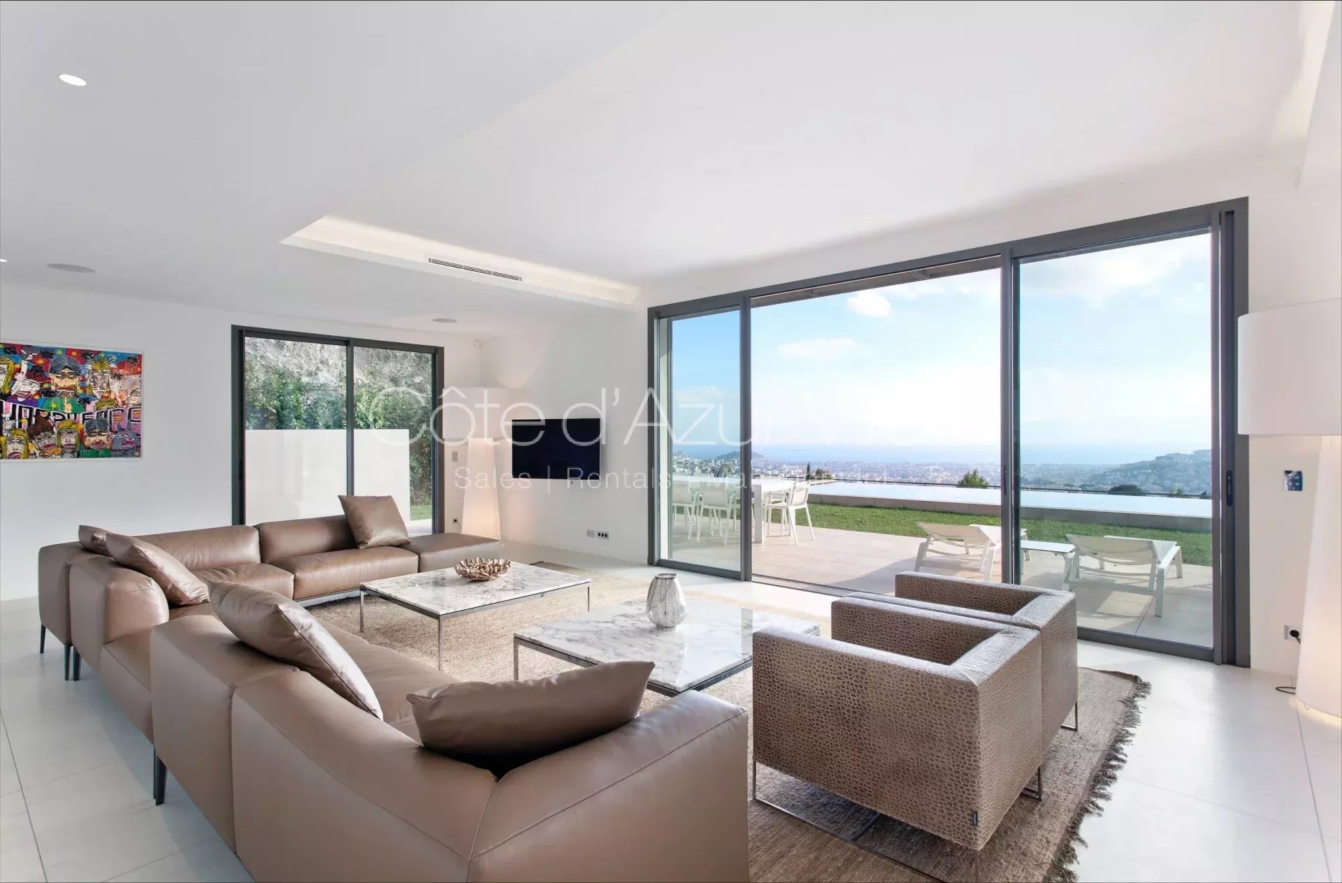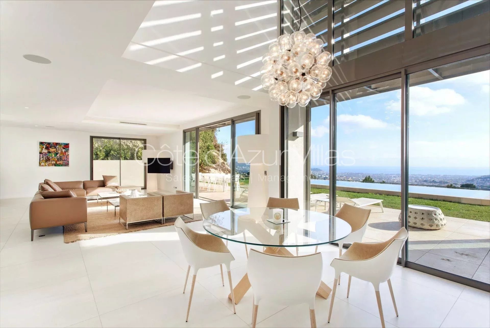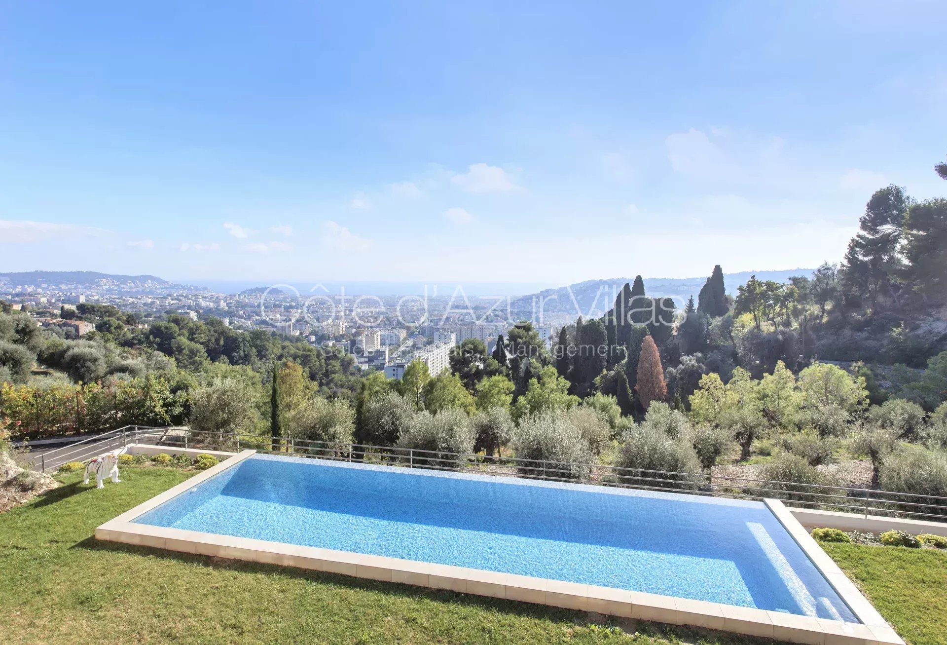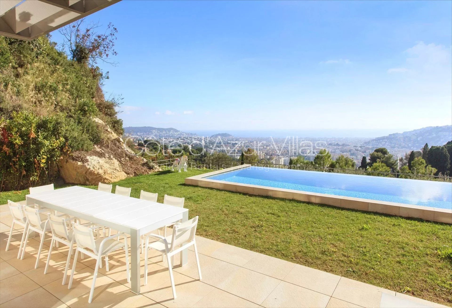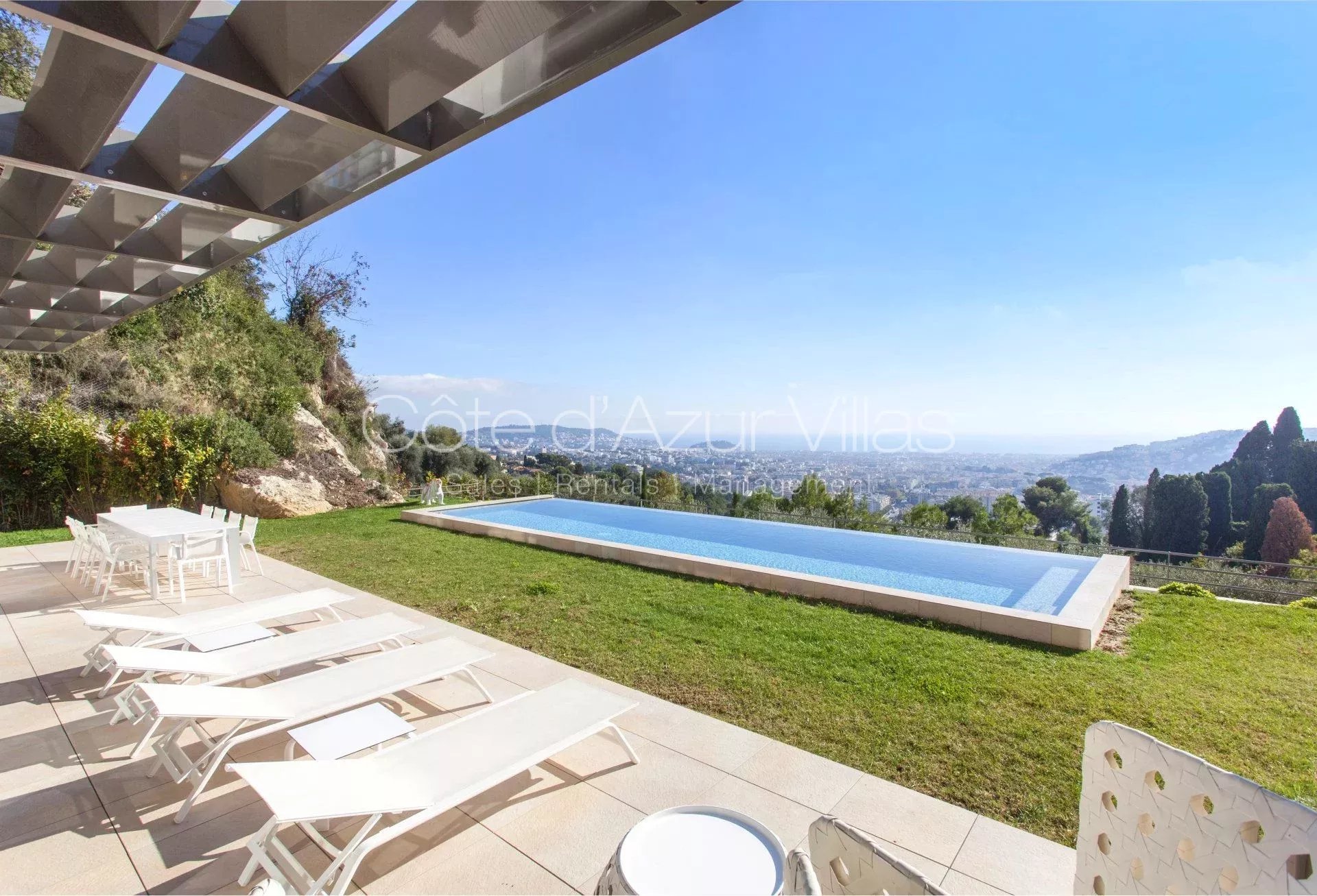 Magnifique villa contemporaine de 330 m² située dans un domaine sécurisé sur les hauteurs de Nice avec superbe vue panoramique de la Méditerranée.