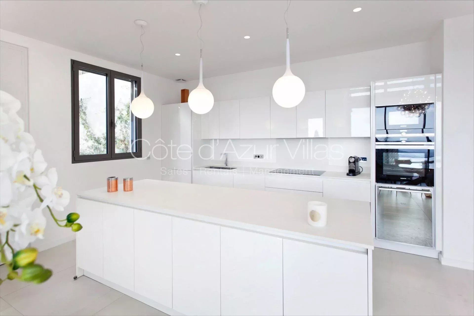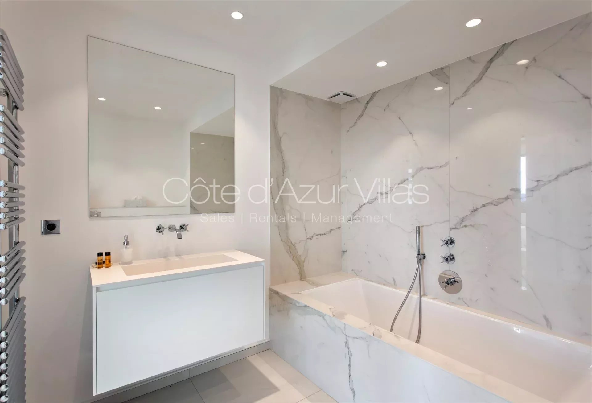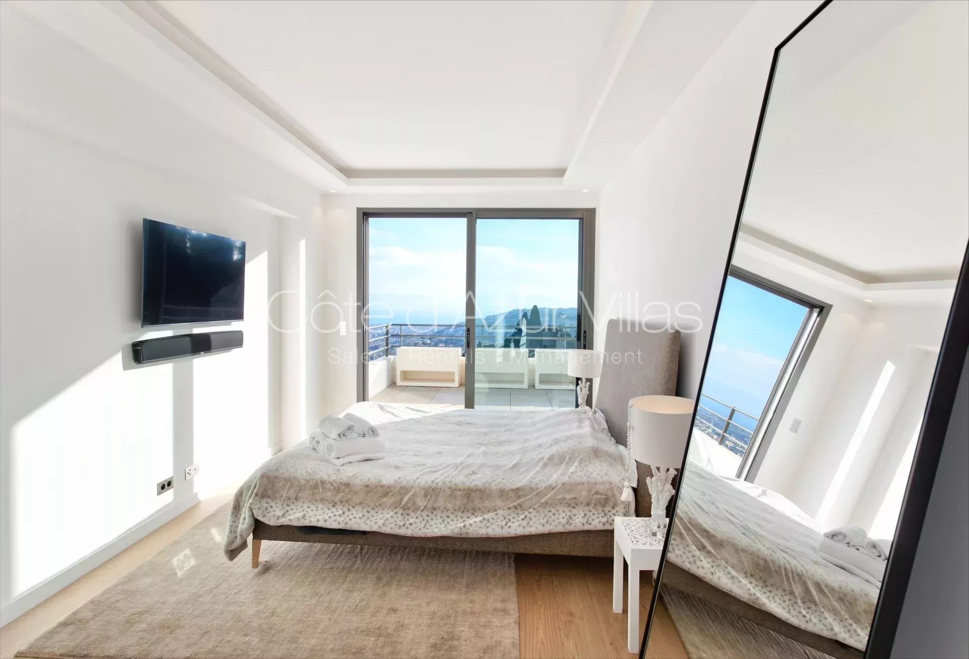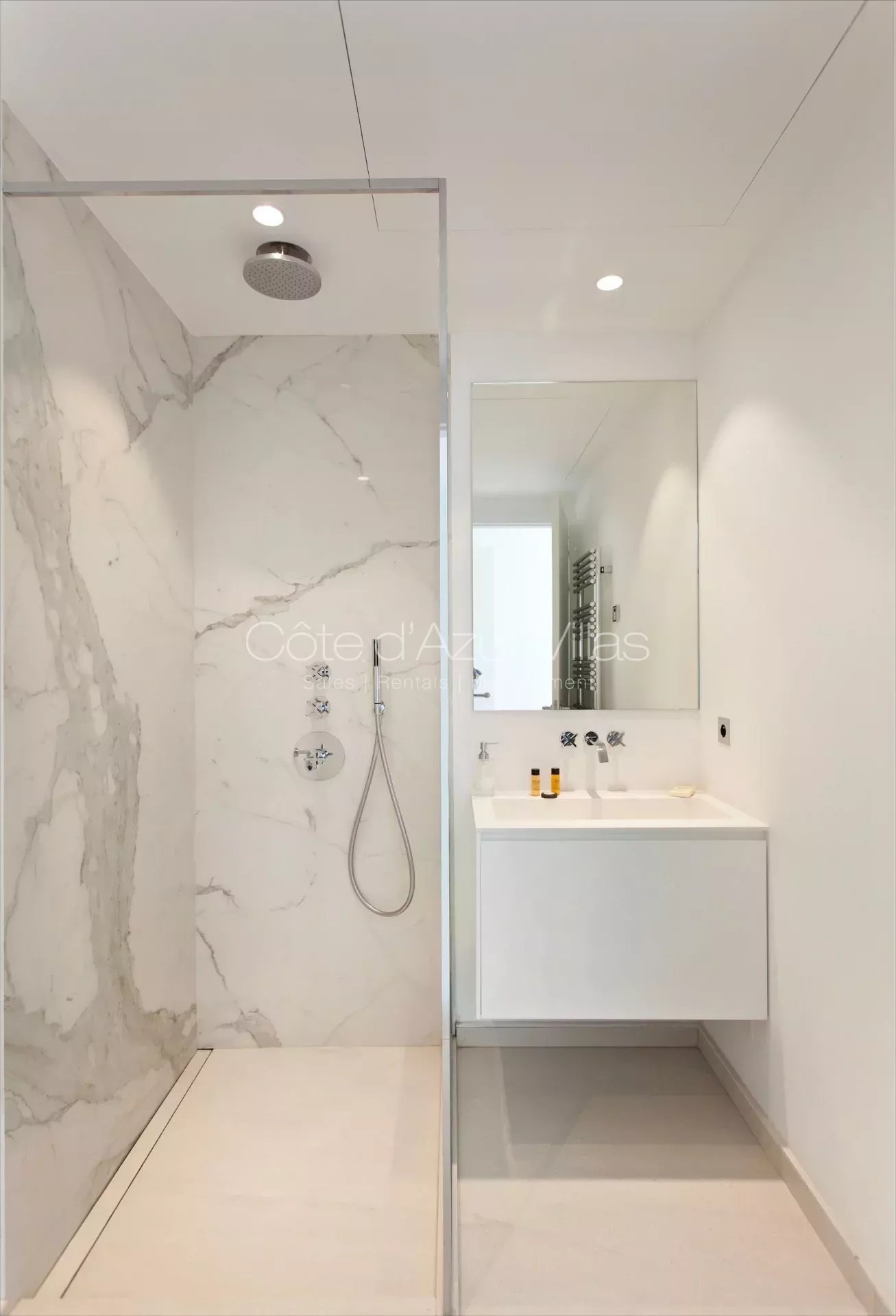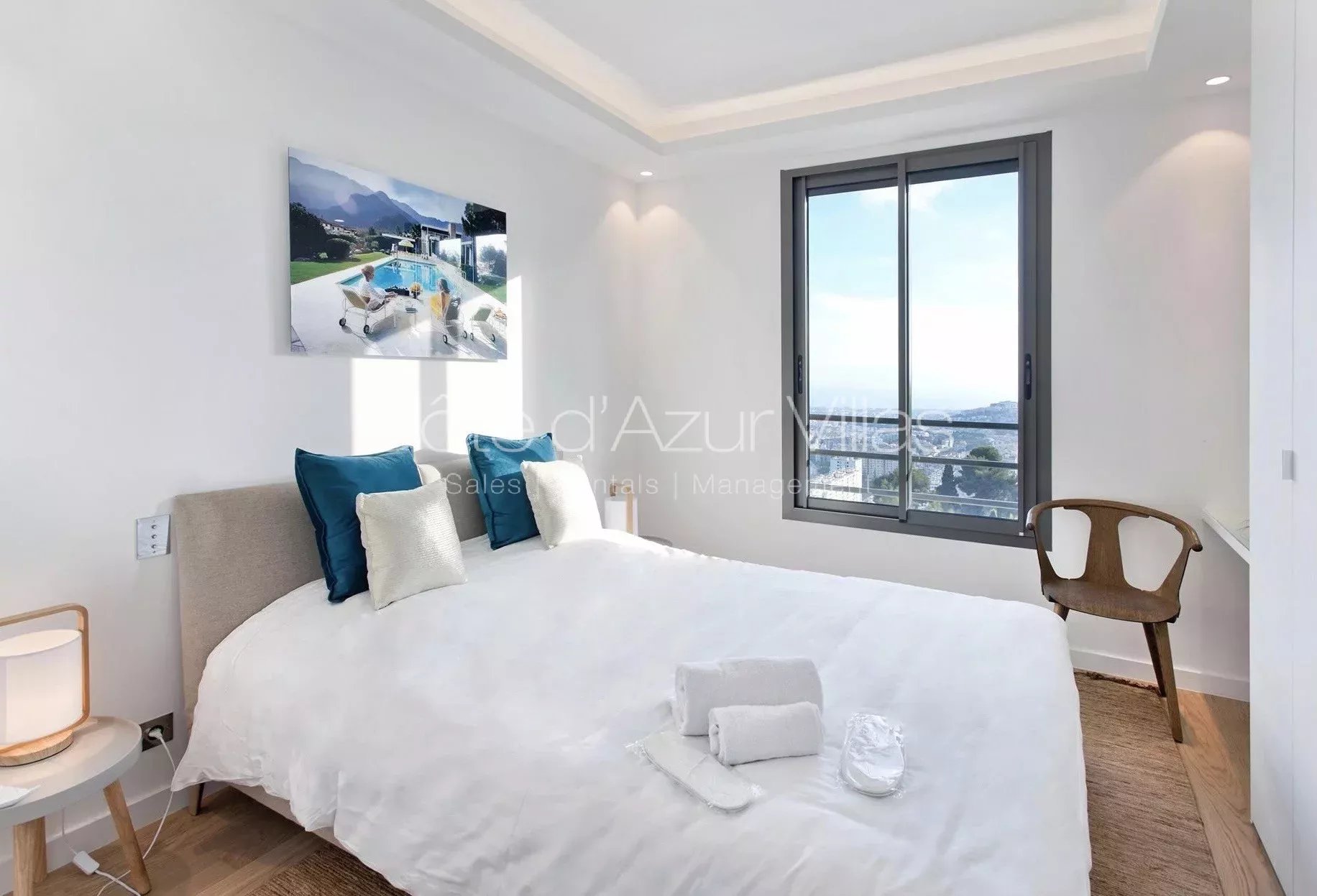 Grand espace de jour avec avec séjour, espace salle à manger et cuisine entièrement équipée, fenêtres coulissantes ouvrant sur terrasse, piscine chauffable à débordement, jardin et vue époustouflante sur la baie de Nice. Chambre avec dressing, salle d’eau attenante avec douche à l’italienne, double vasque et WC.