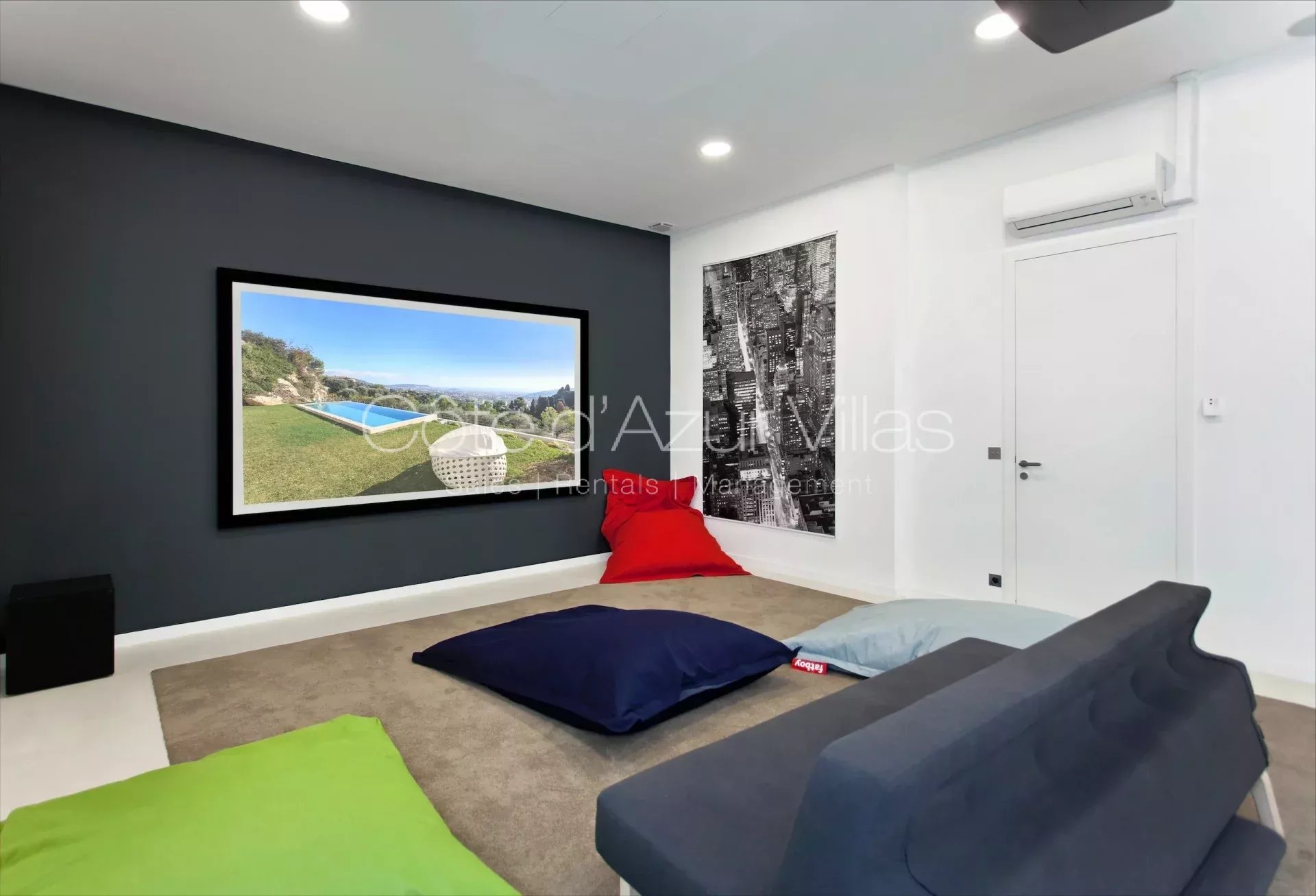 Home cinéma avec canapé convertible et salle de bains attenante (baignoire, double vasque et WC), pièce de rangement, buanderie avec lave linge et sèche linge, WC séparés, ascenseur et escaliers menant au rez de jardin
