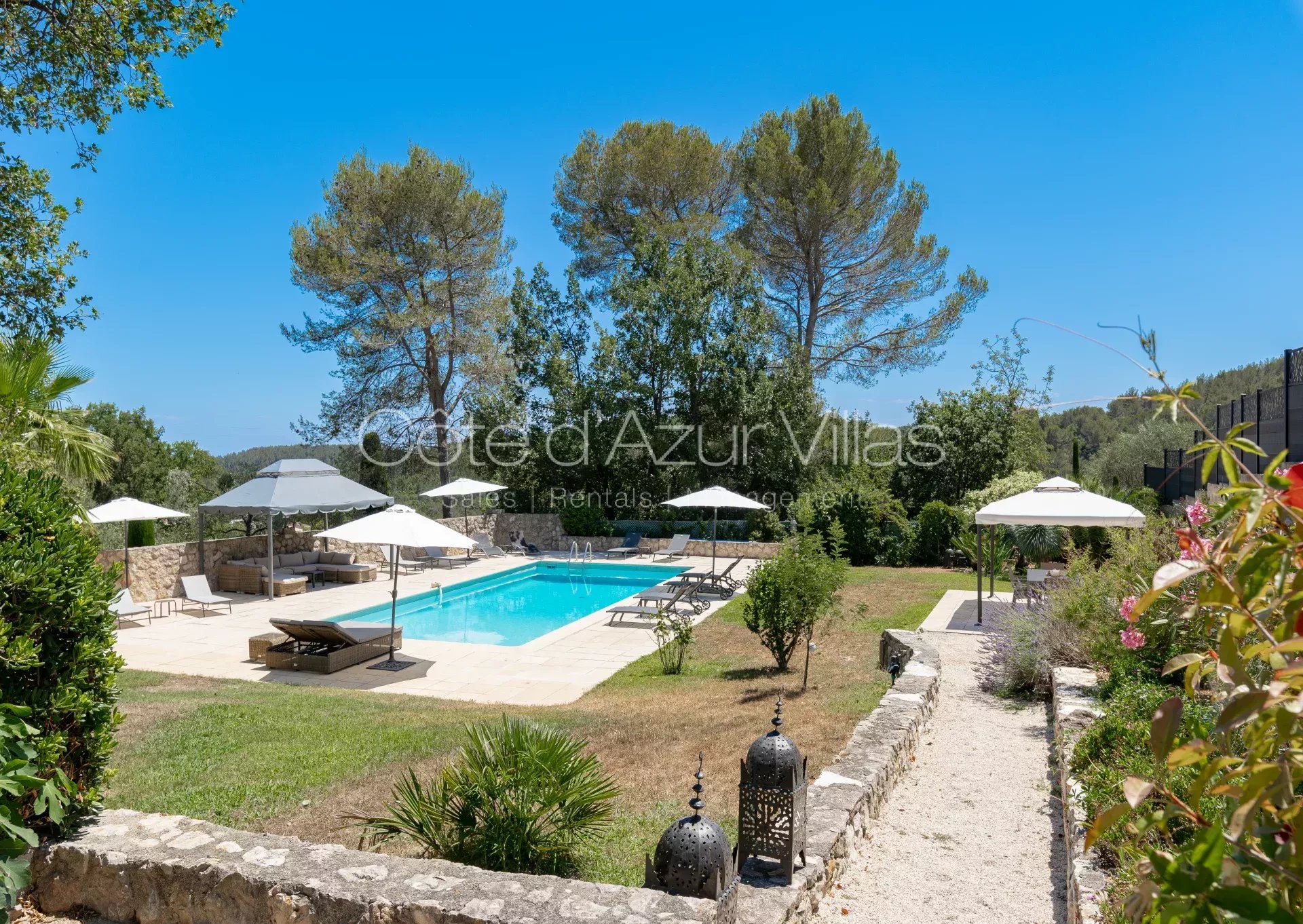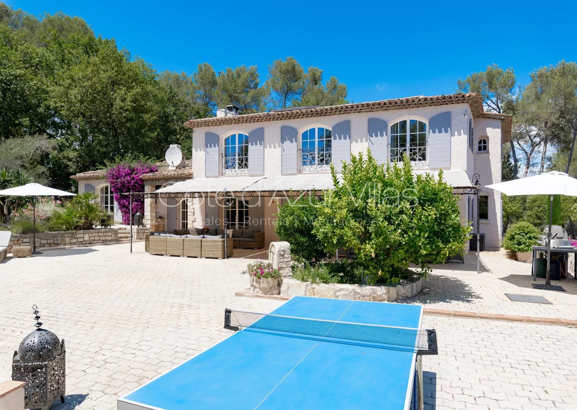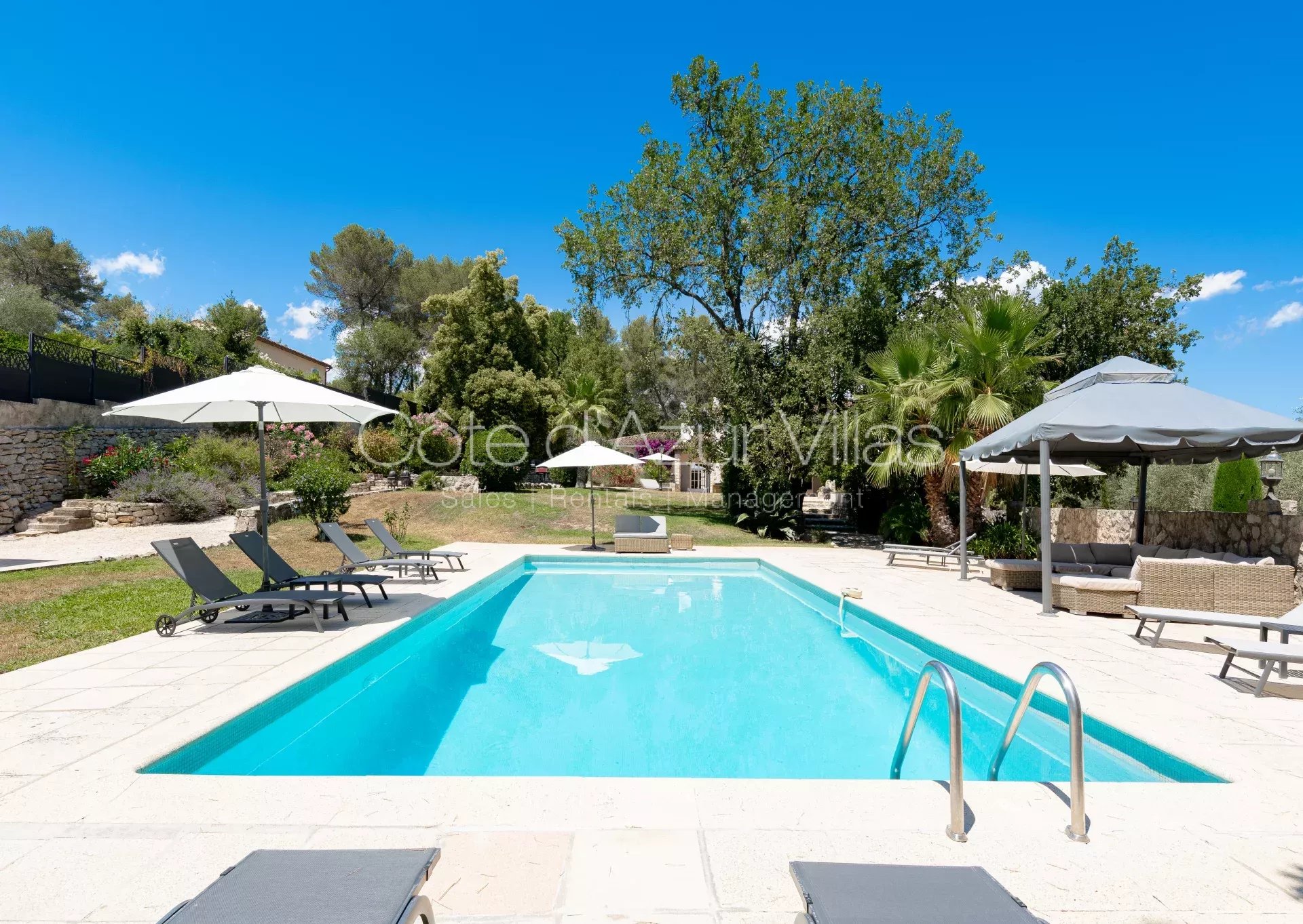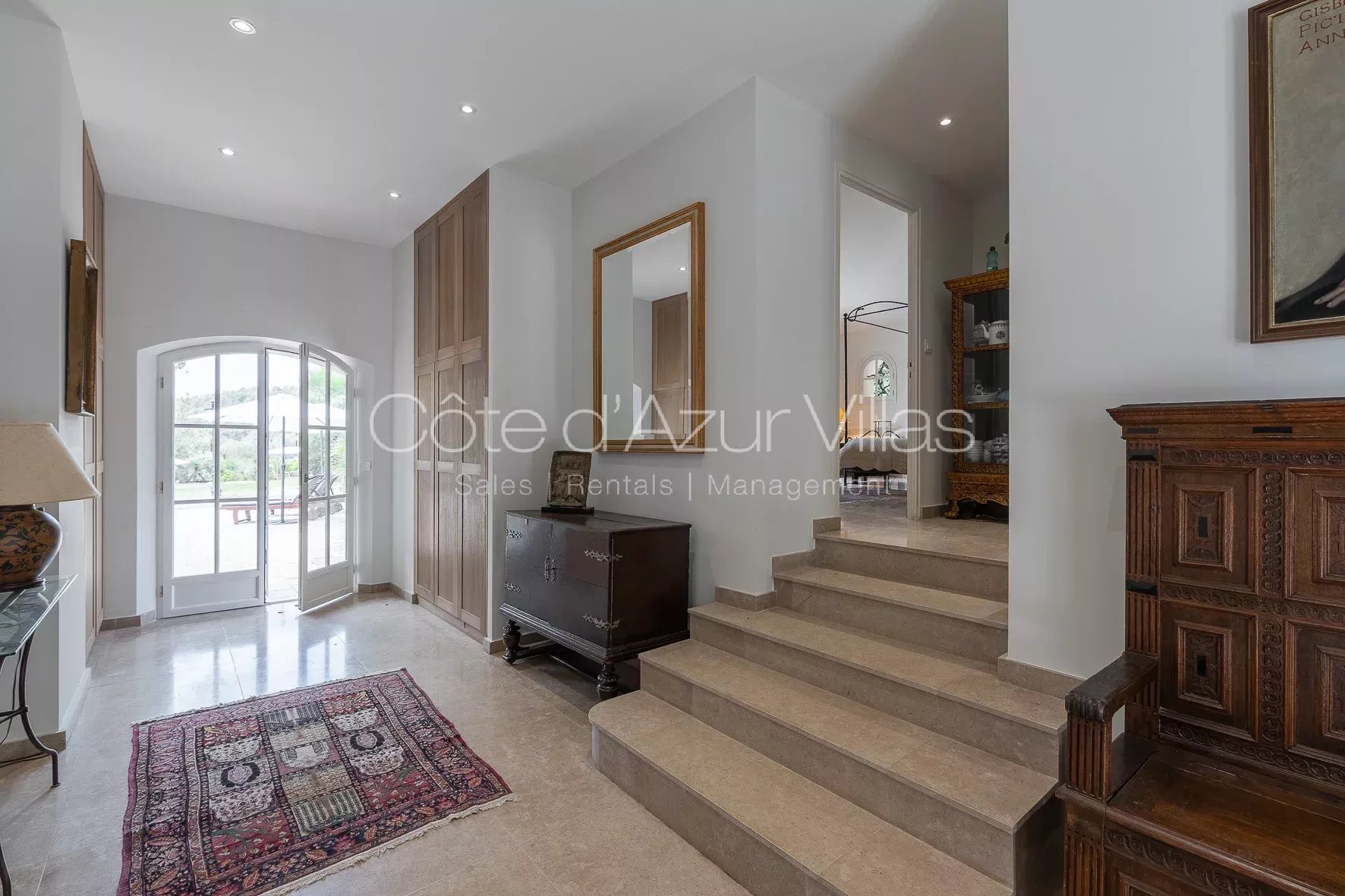 Magnifique résidence familiale avec jardin, piscine privée chauffée, 6 chambres et 5 salles de bain, climatisation, le tout sur un beau jardin méditerranéen de 4800m² avec oliviers. Localisation paisible à quelques pas du village de Valbonne.