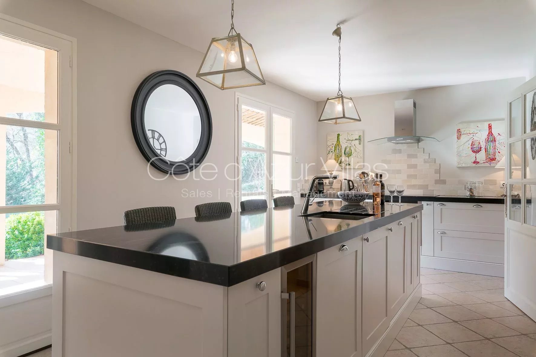 Grand Séjour et coin salle à manger ouvrant sur la terrasse couverte. Cuisine entièrement équipée ouvrant également sur la terrasse et le coin repas extérieur avec BBQ.