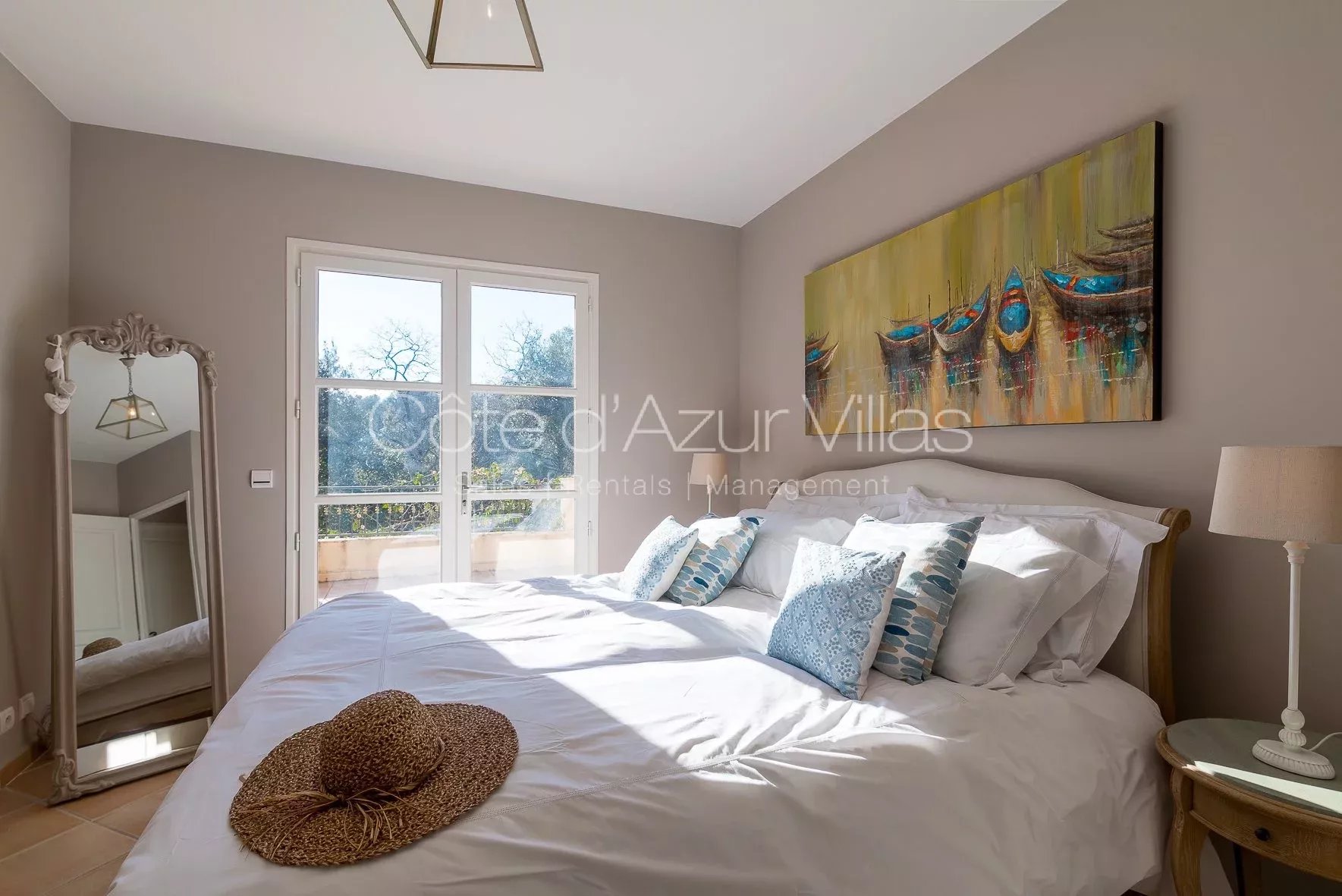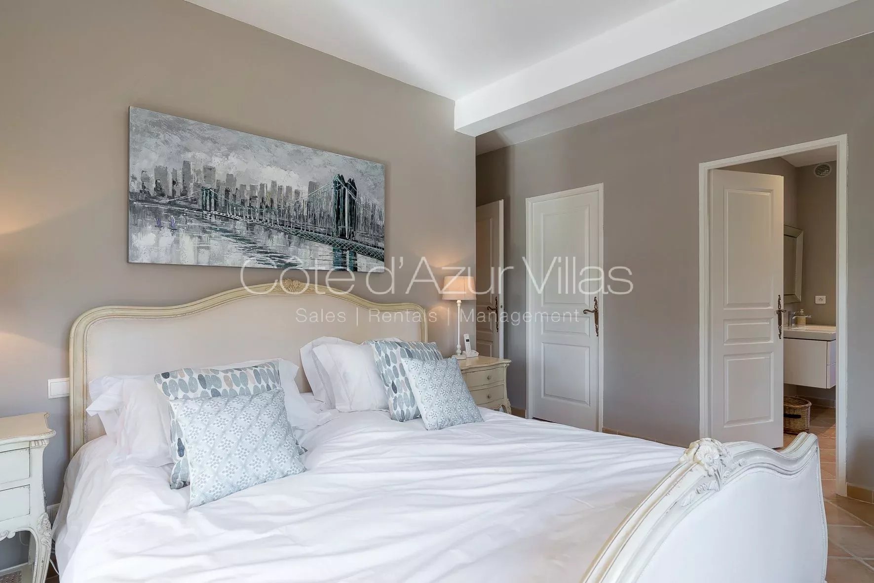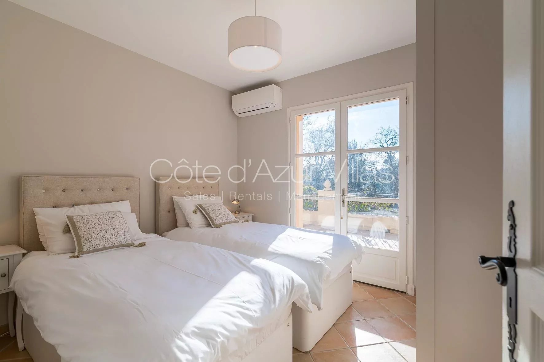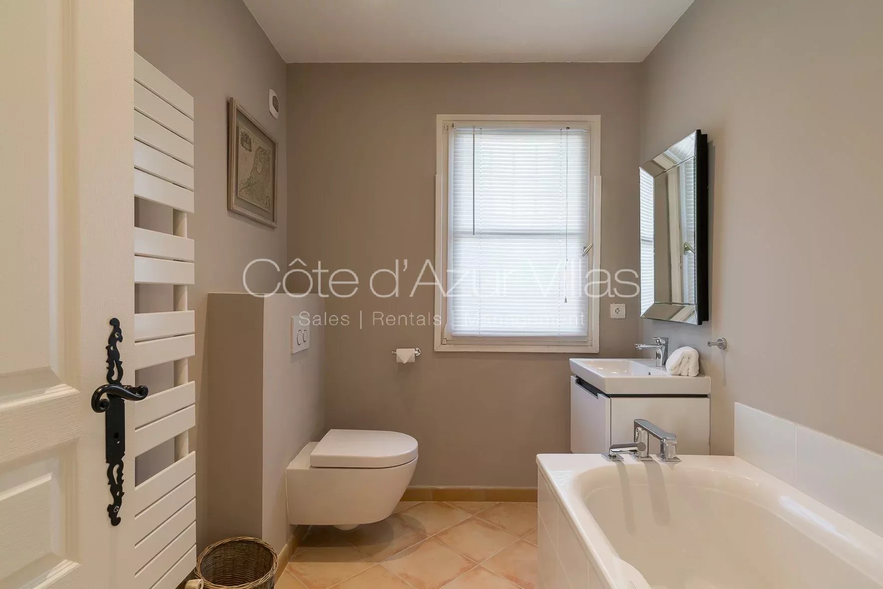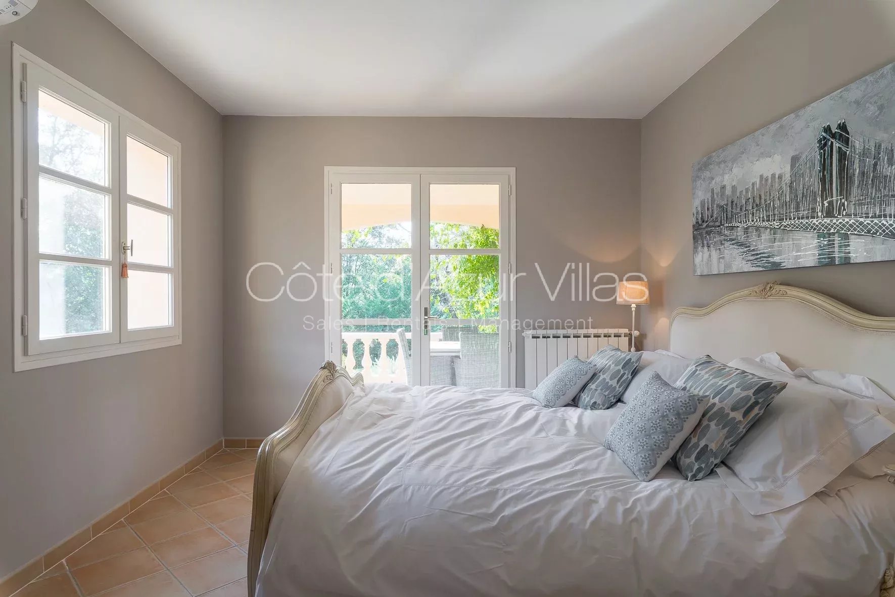 Trois chambres ouvrant sur une grande terrasse, deux salles de bains – une avec douche et l’autre avec baignoire.