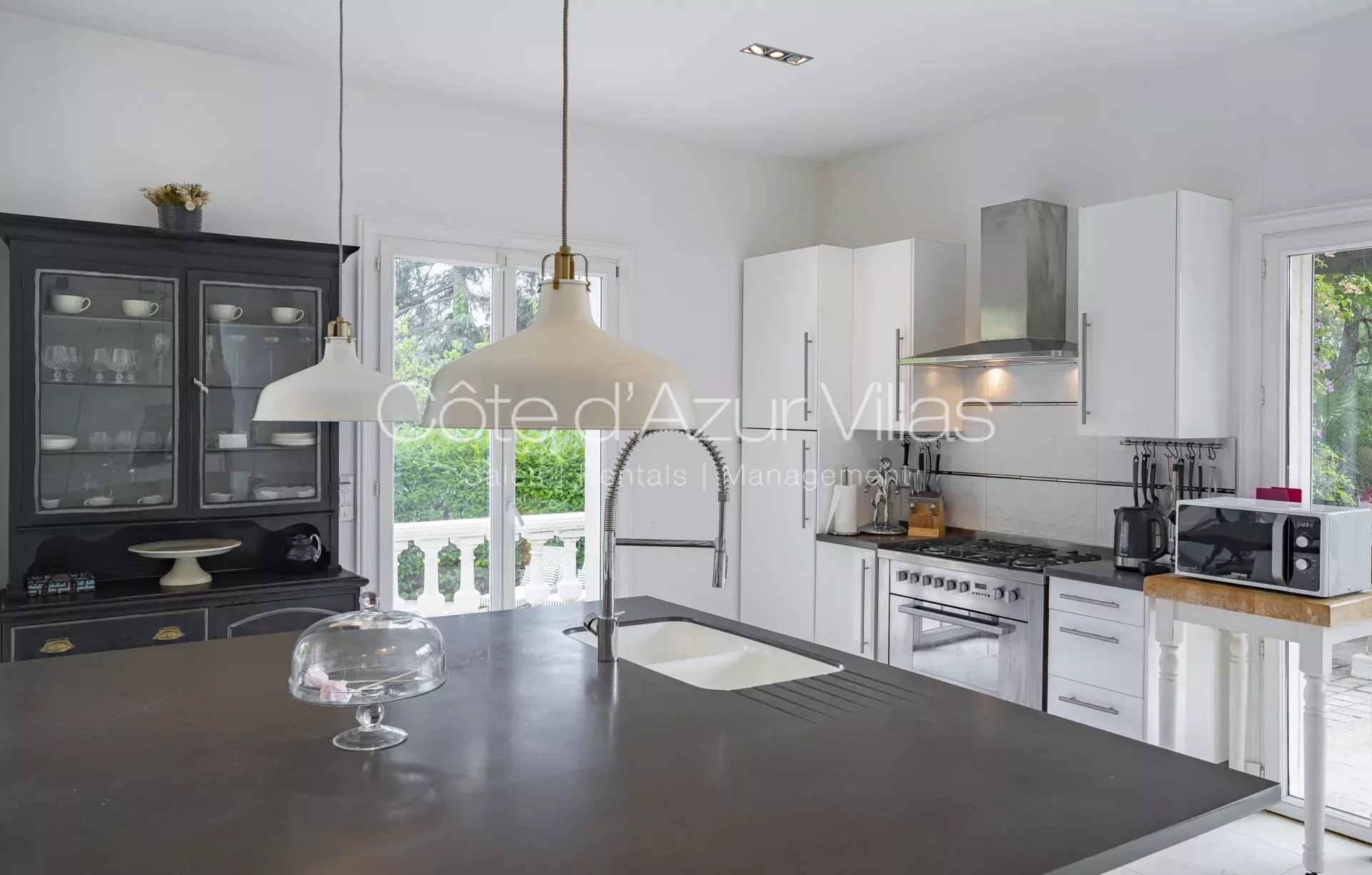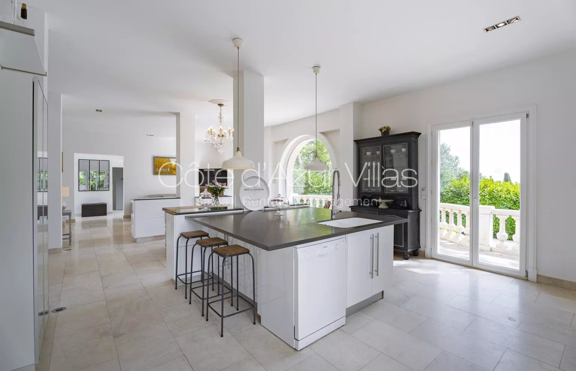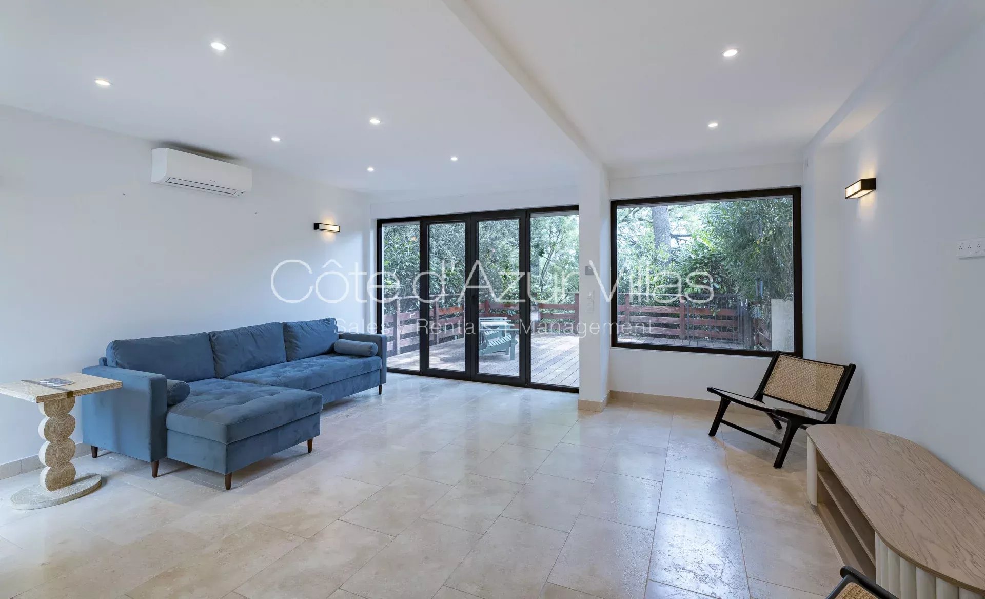 Entrée avec WC invités, espace ouvert avec cuisine entièrement équipée, coin repas, séjour avec portes-fenêtres. Pièce supplémentaire entièrement rénovée avec un canapé -lit et une salle de bain, pouvant servir de chambre, de salle de jeux, de salle de cinéma ou encore de pool house.