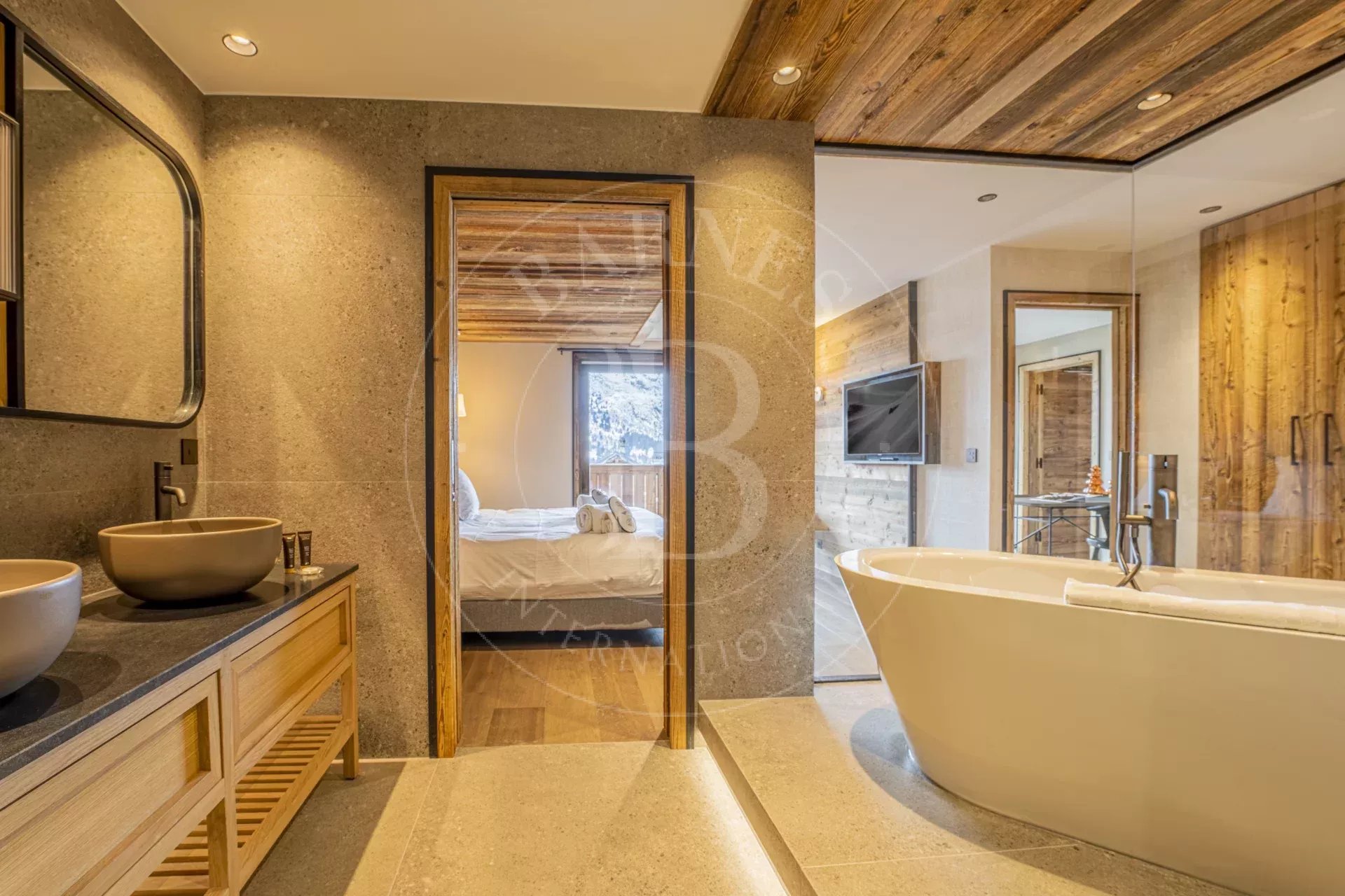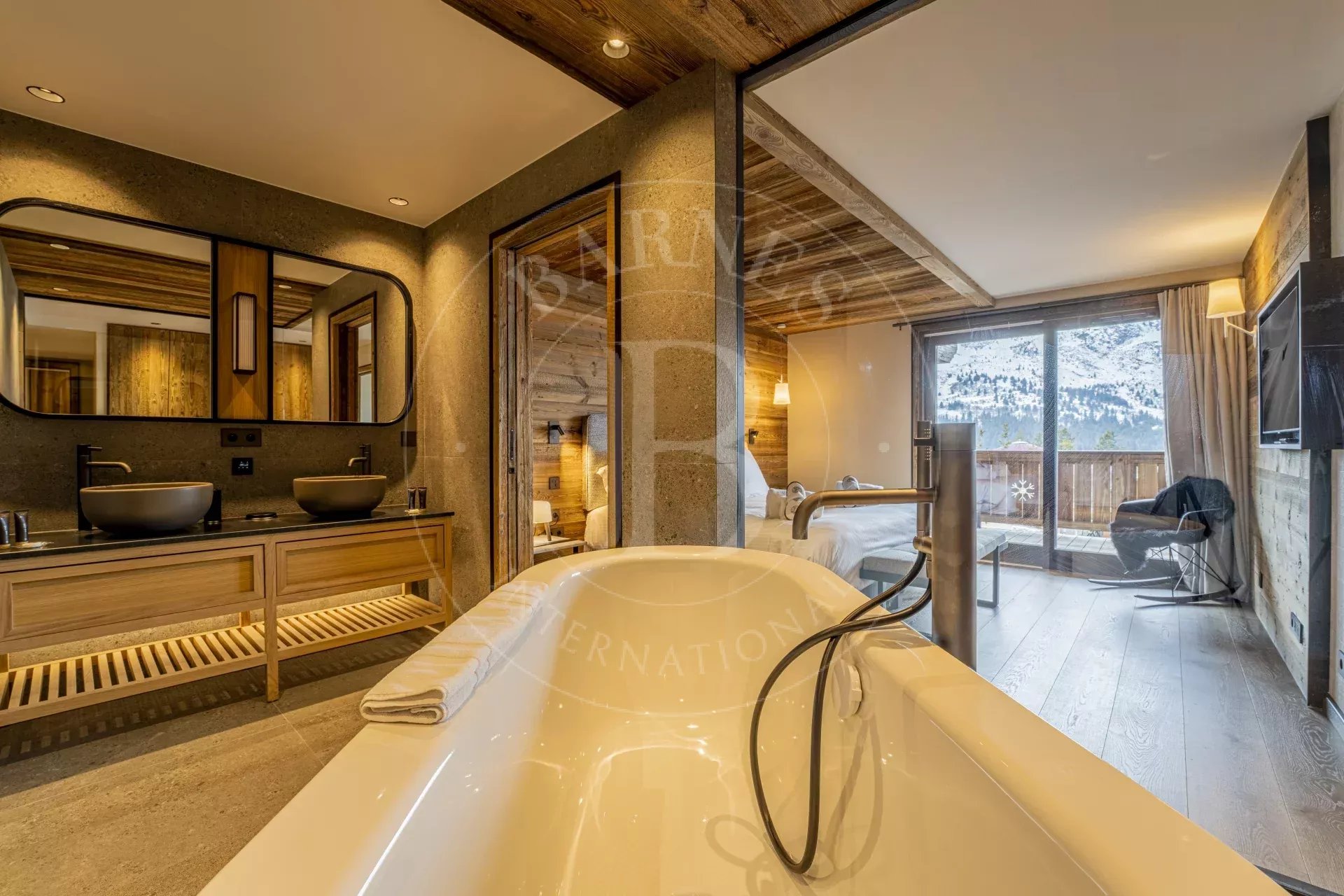 - Chambre 2 : Chambre master avec lit double 200x200, salle de bain double vasque, baignoire, douche et toilettes