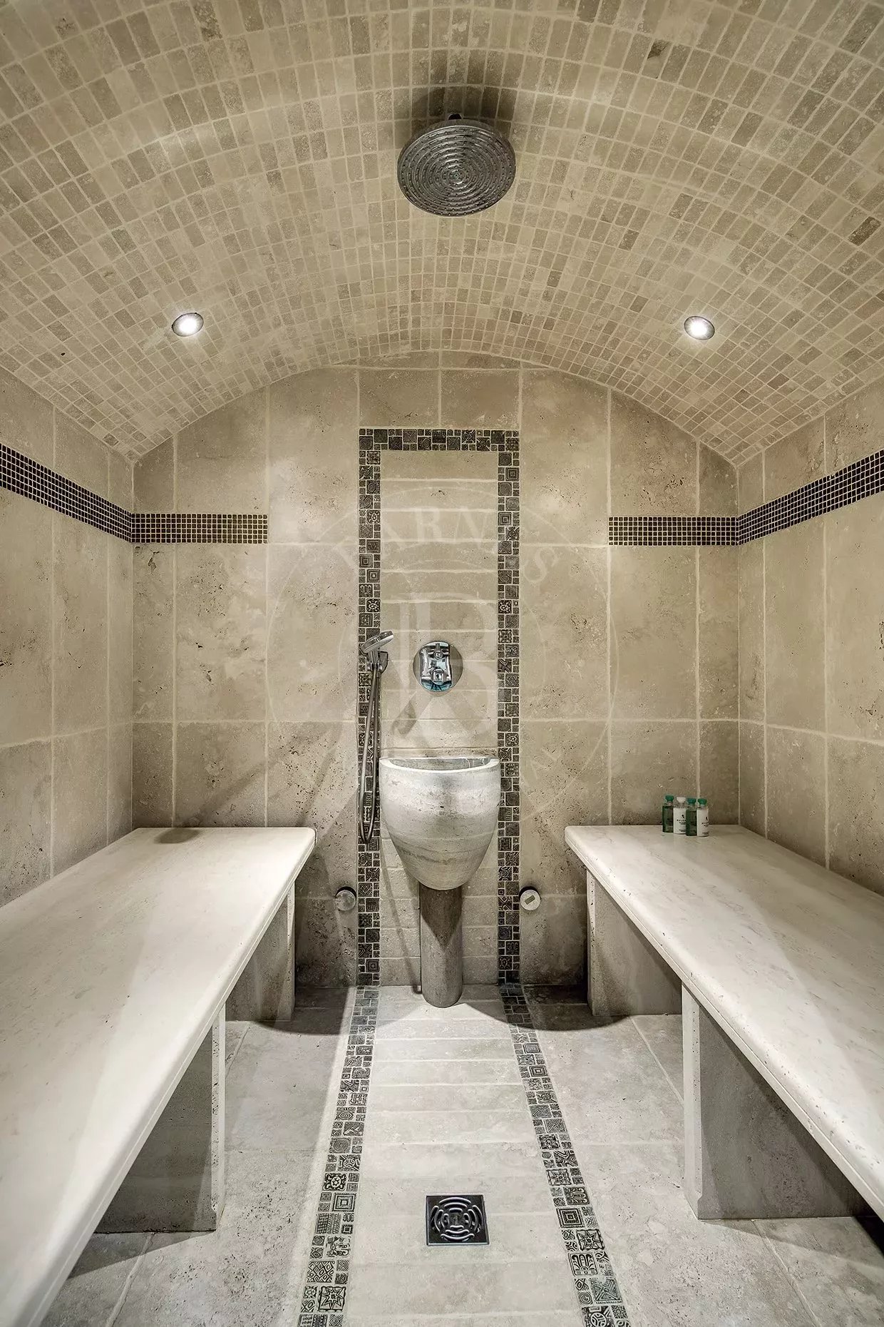 Le rez-de-chaussée abrite une grande piscine intérieure avec Jacuzzi et hammam, une salle de massage indépendante et une salle de jeux pour enfants.