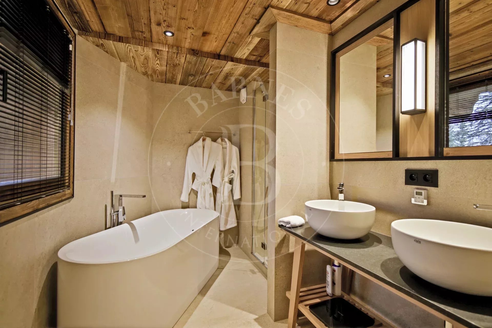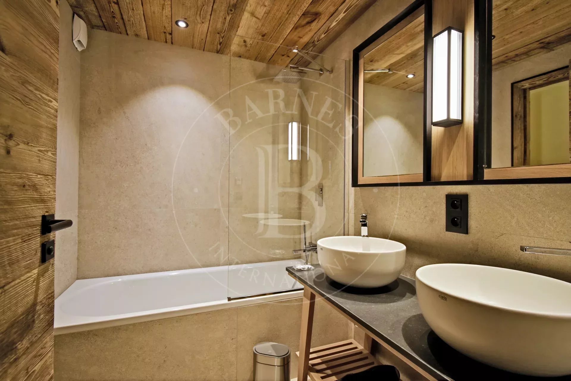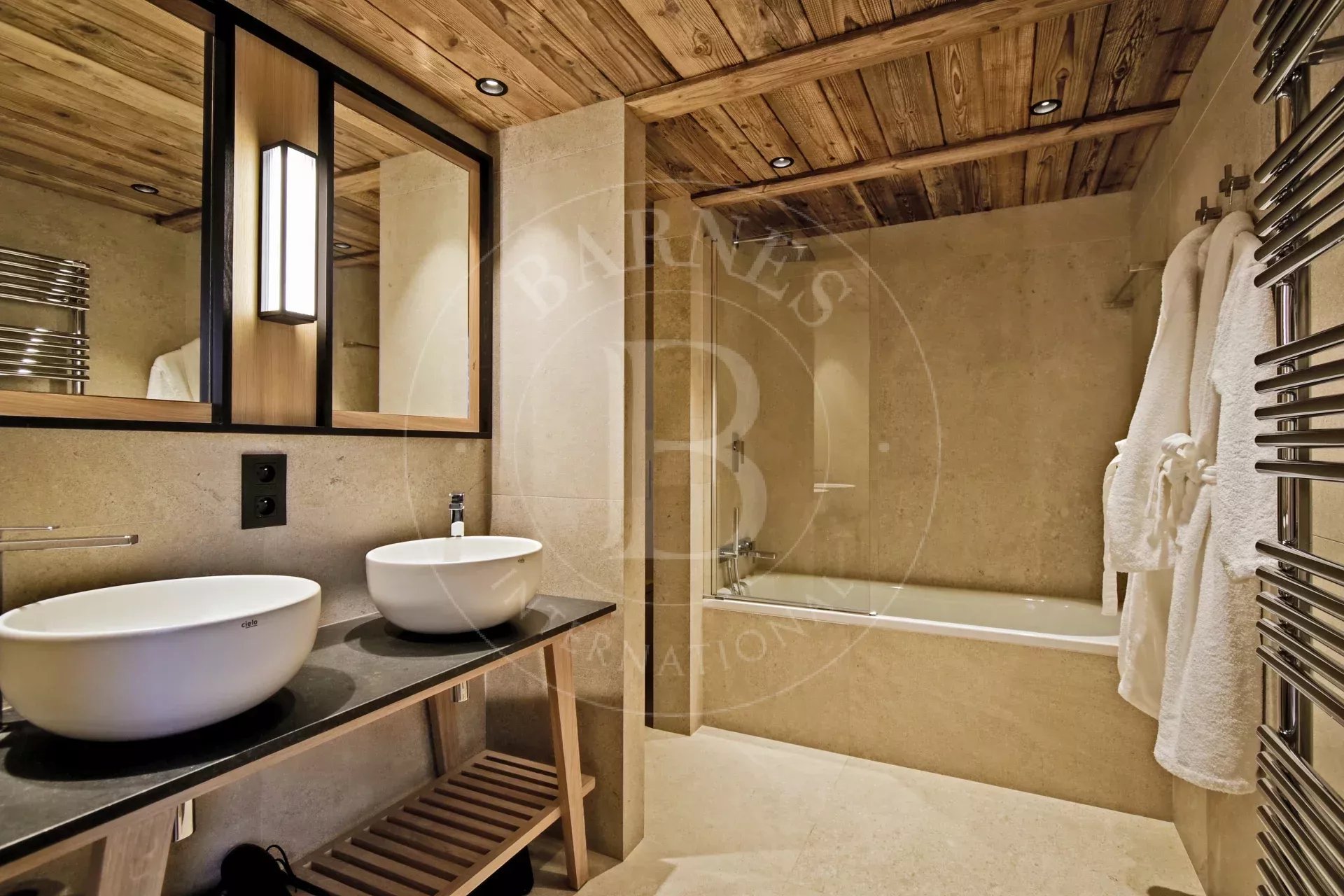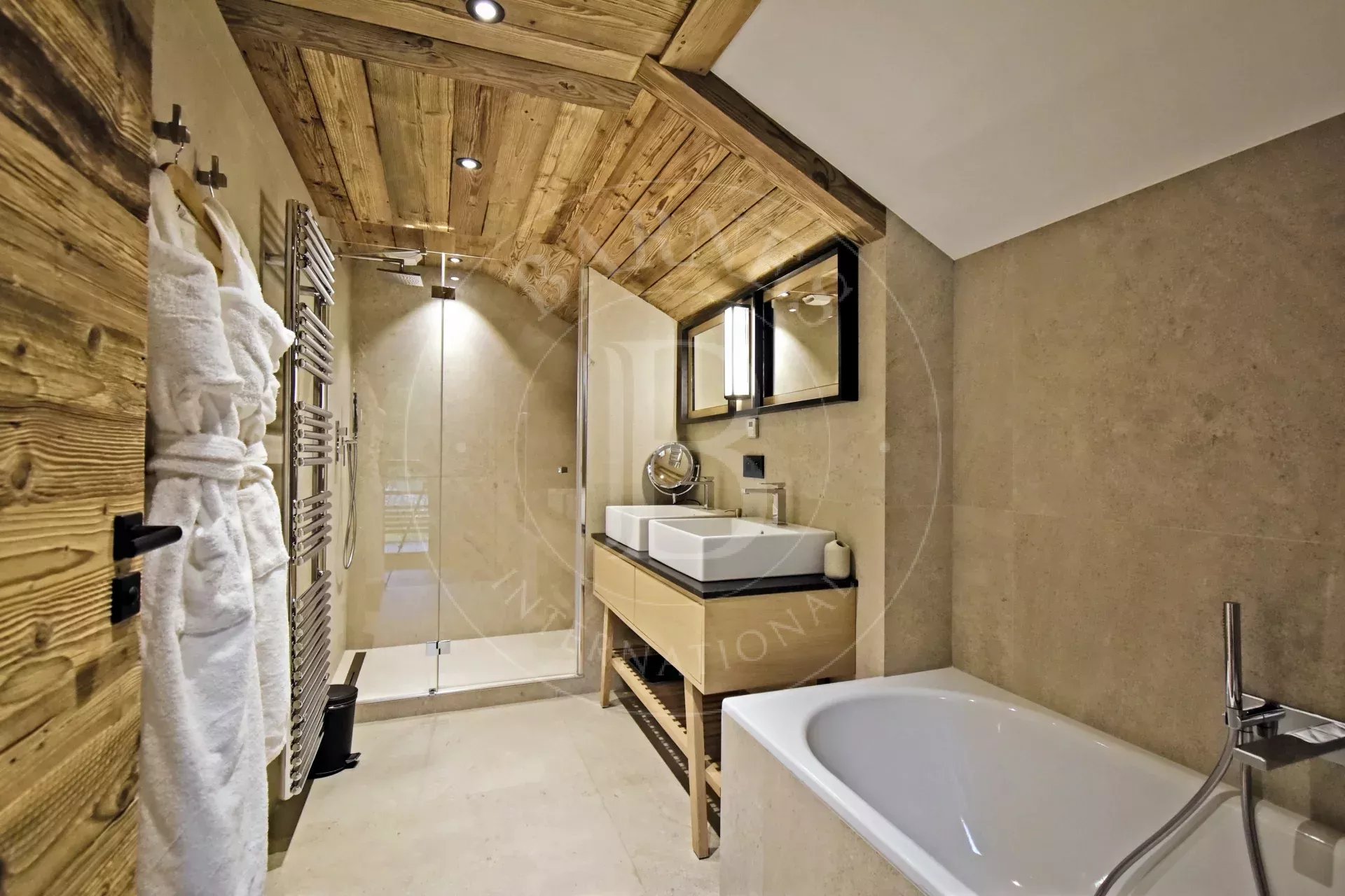 - Toilettes invités - Chambre 4 : lit double, TV, salle de bain avec double vasque ainsi que douche et baignoire, - Ski room toilettes, accès terrasse