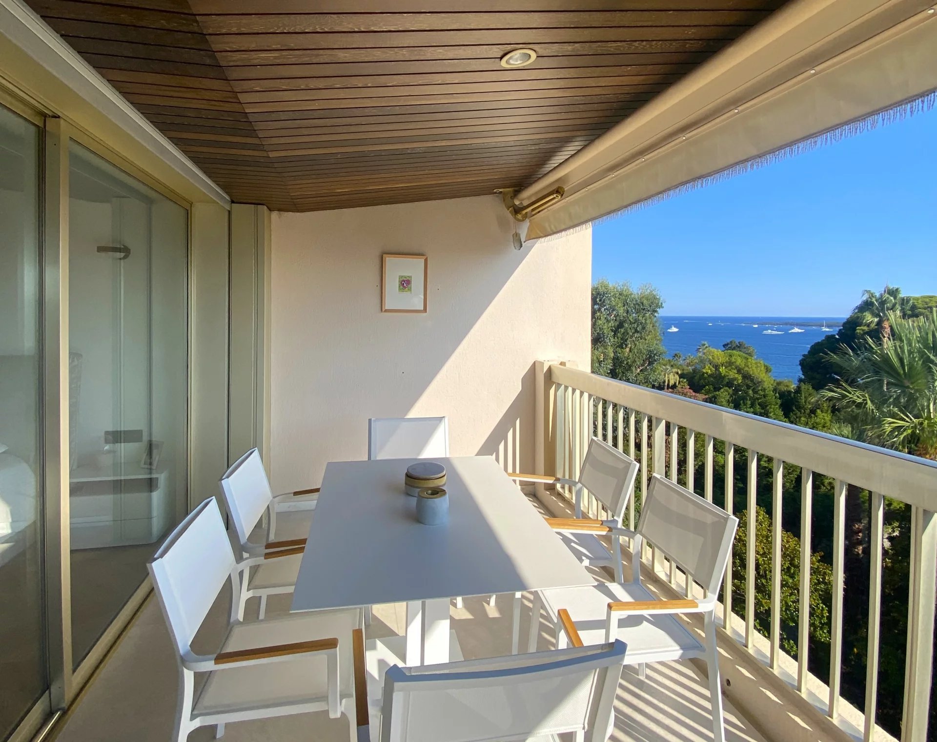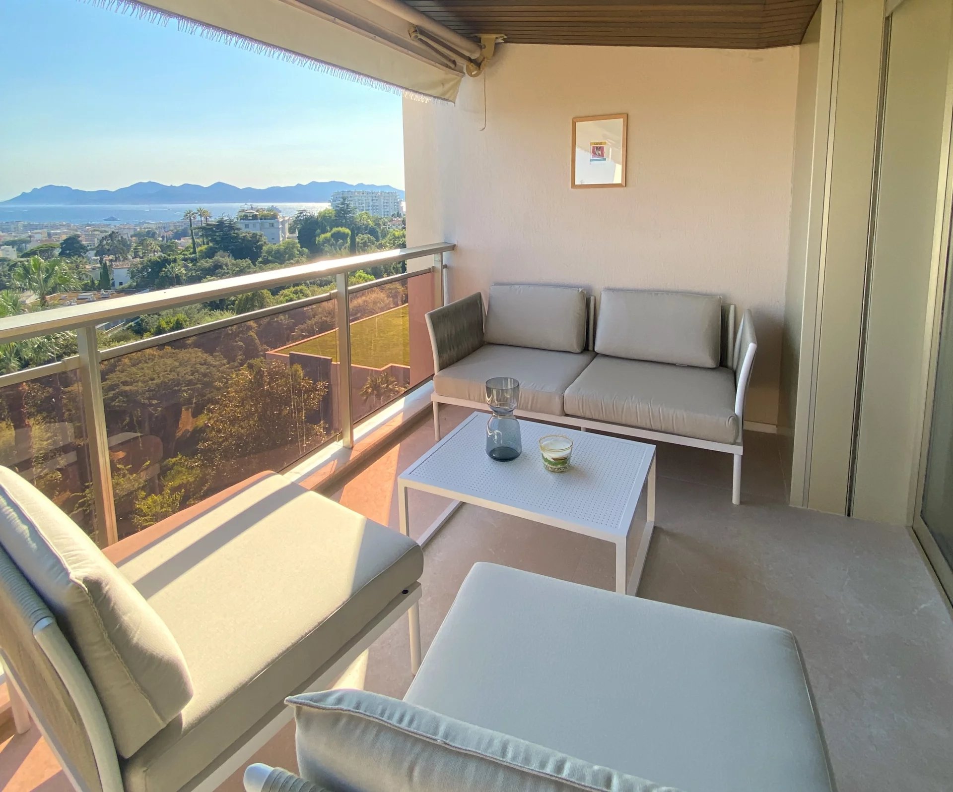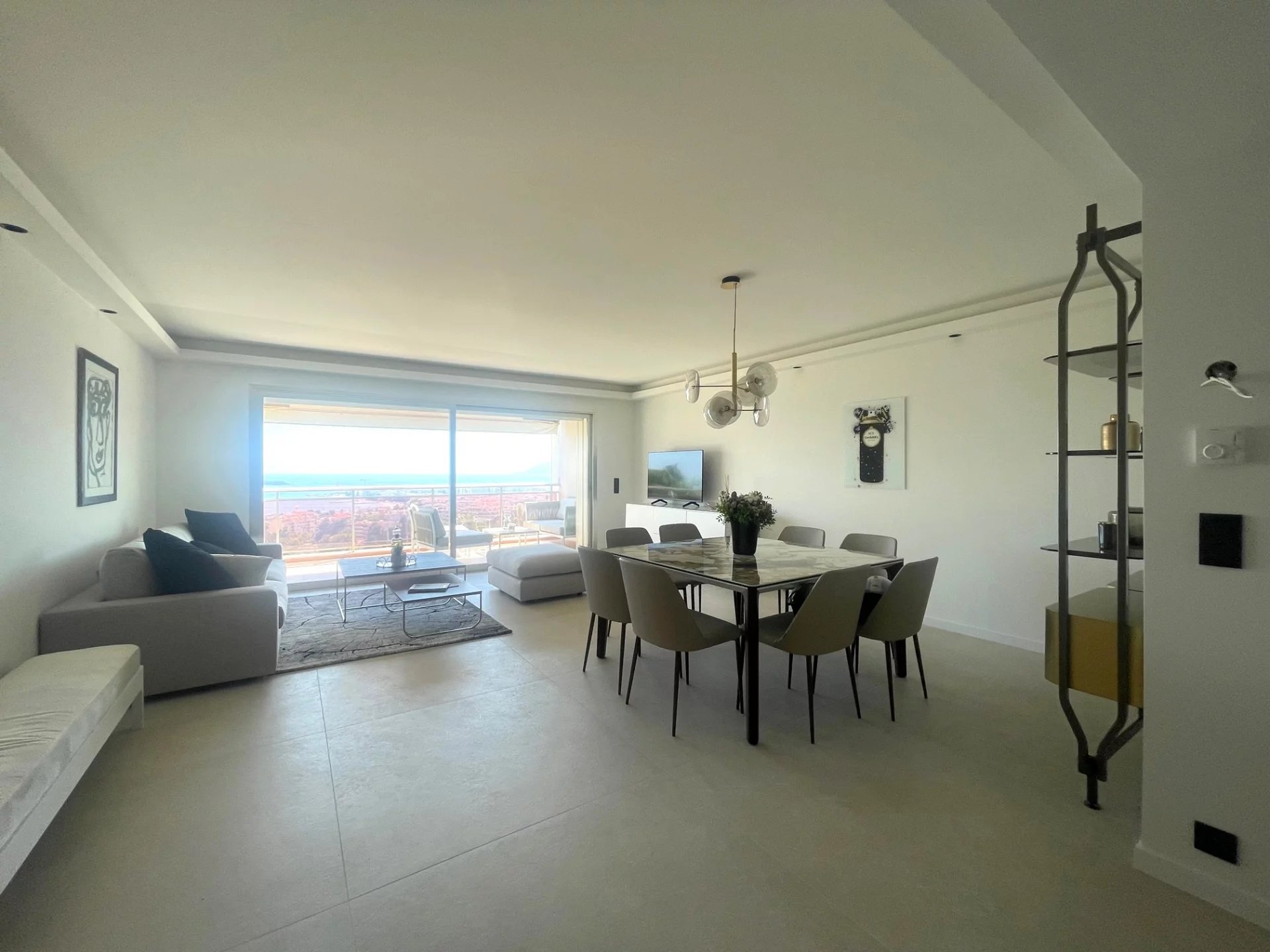 Dans le secteur très prisé de la Californie dans une résidence de grand standing avec gardien parc piscine tennis au calme absolu Magnifique appartement de 4 pièces superbement rénové avec des matériaux de qualités Il est composé d'un grand séjour donnant sur une belle terrasse de 20 m² dominant la baie de Cannes avec une vue fantastique sur la mer et les iles de Lerins, une cuisine ouverte équipée 3 belles chambres en suites . il dispose de 2 garages et d'une cave .