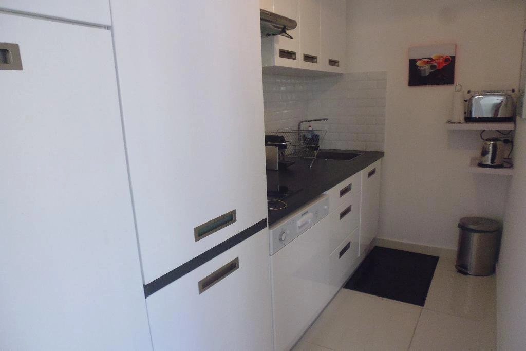 "Banane" de Cannes - Proche du palais des festivals. Dans une résidence avec ascenseur et gardien, appartement d'angle neuf de 2 pièces d'environ 37,00 m² bénéficiant d'une terrasse d'une dizaine de m² bien exposée et comprenant une cuisine toute équipée en retrait, un séjour doté d'un couchage double d'1,40 m de large, une chambre dotée d'un lit double d'1,40 m de large et une salle de douches avec WC : internet, lave-linge et lave-vaisselle.