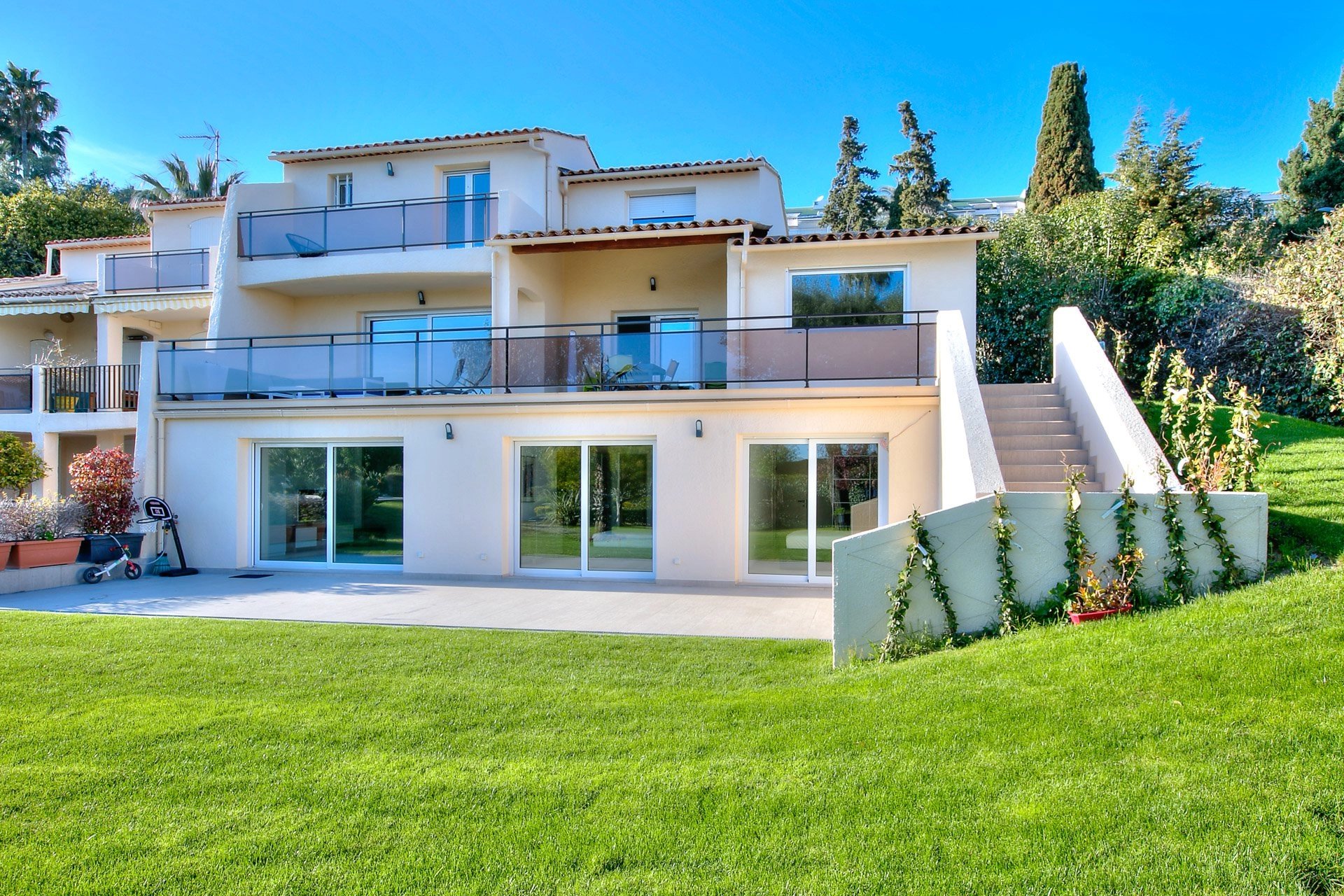 En plein coeur de la Californie, dans un lotissement clos et sécurisé de 4 lots avec piscine et jardin. Belle villa de 215 m2 sur 3 niveaux tout juste rénovée avec de belles prestations contemporaines. Au total 3/4 chambres et leurs salles d'eaux dont une chambre de maitre à l'étage supérieur avec terrasse privée et une jolie vue sur la verdure et la mer. Garage et parking