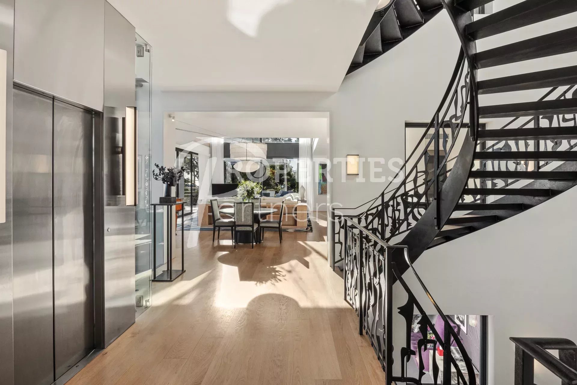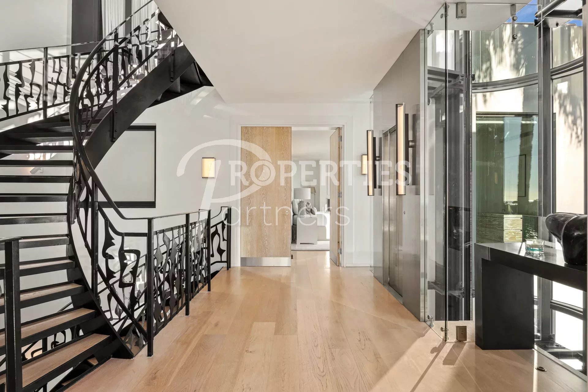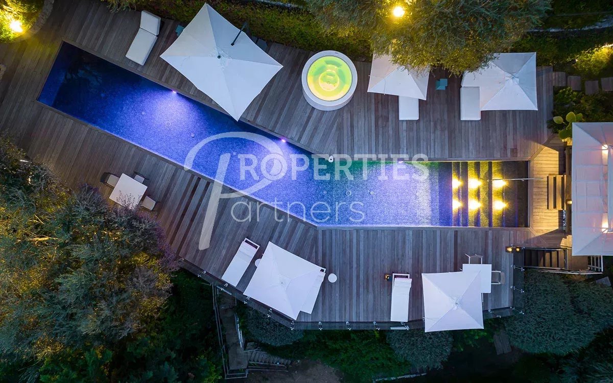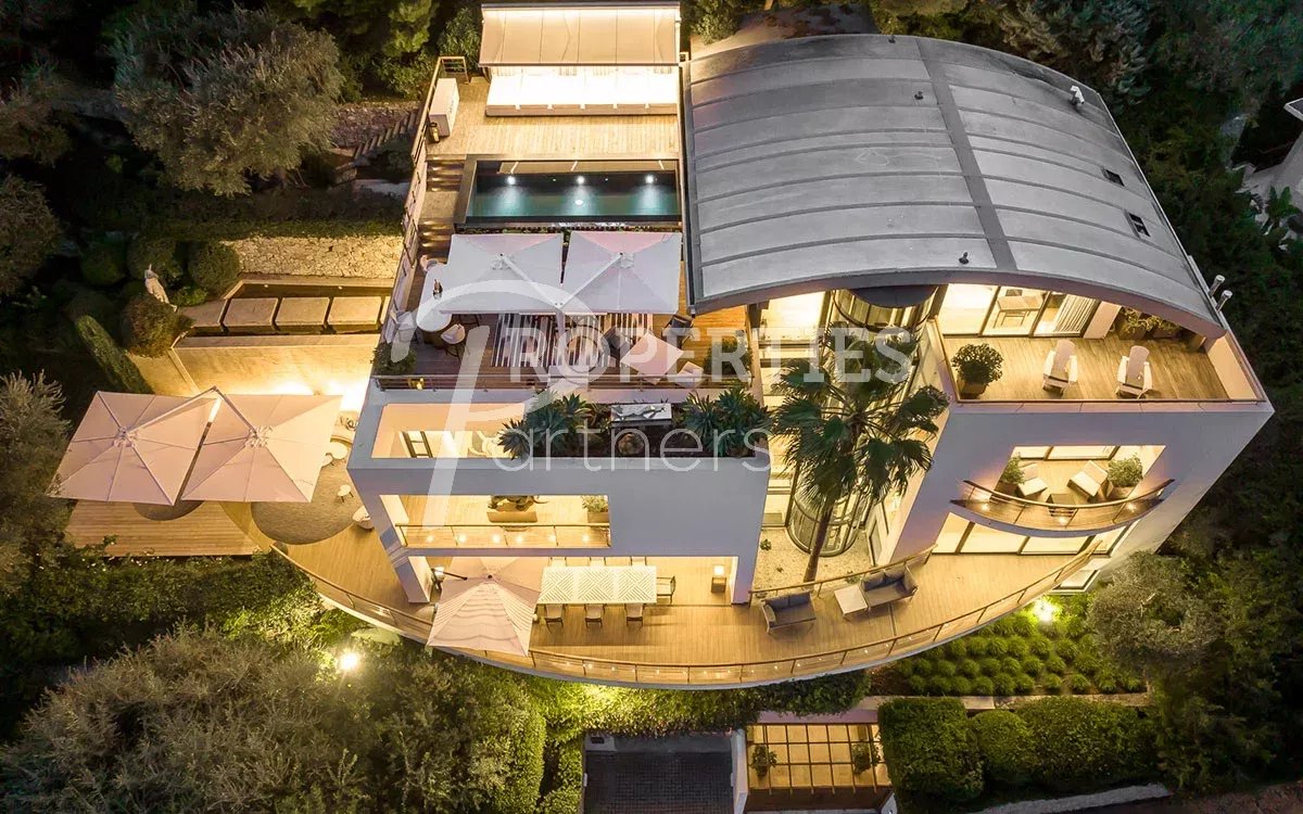 Avec de nombreuses terrasses extérieures et entourée de 4500 m² de jardin impeccablement entretenus et une piscine à débordement qui borde le jardin, la villa comprend 5 niveaux reliés par un escalier en spirale dans un atrium de 25m et un ascenseur en verre.